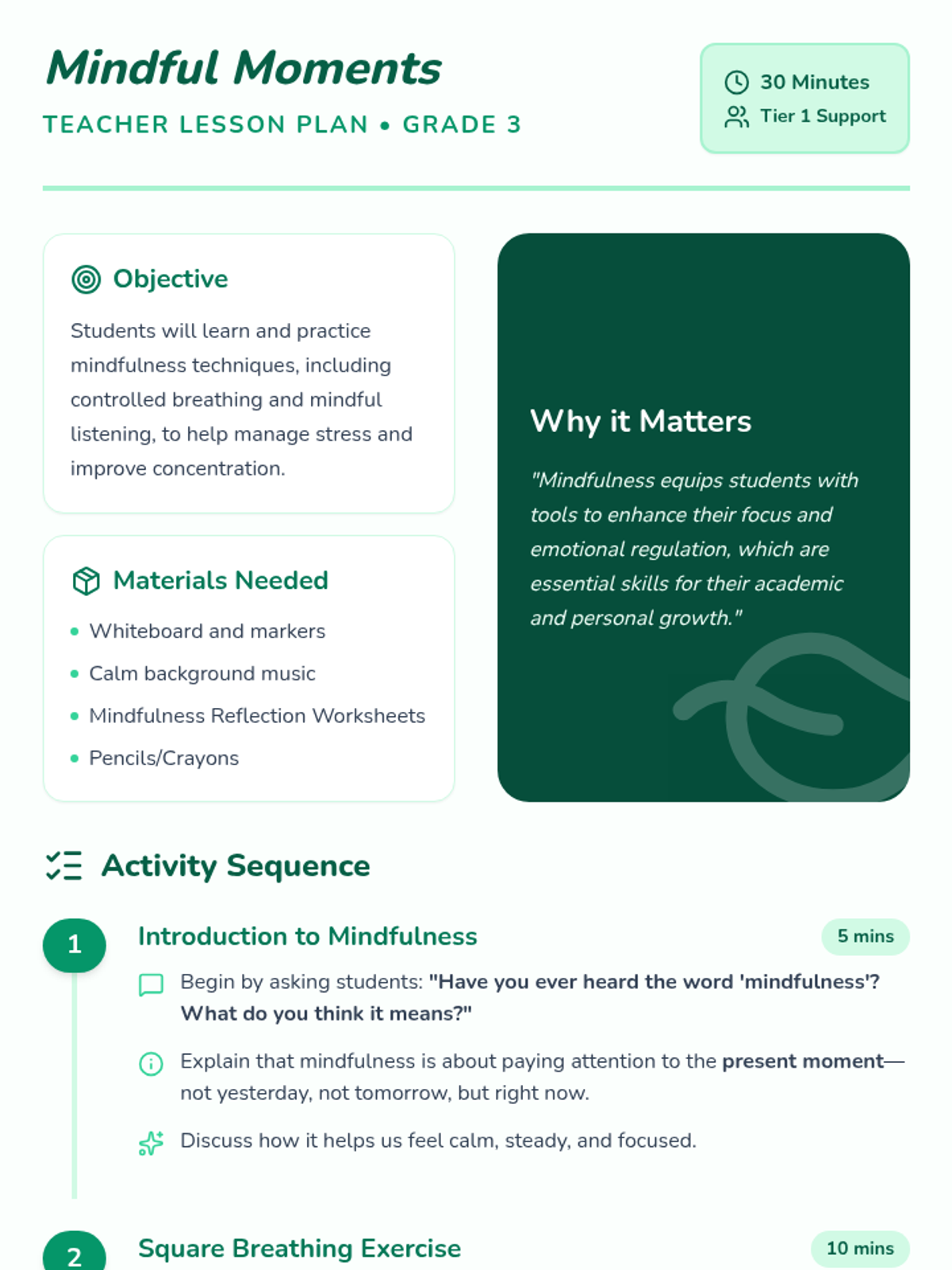 This lesson introduces 3rd grade students to mindfulness techniques to help them manage stress and improve concentration. Students will practice simple breathing exercises and mindful listening activities. This lesson is important as it equips students with tools to enhance their focus and emotional regulation, which are essential skills for their academic and personal growth.