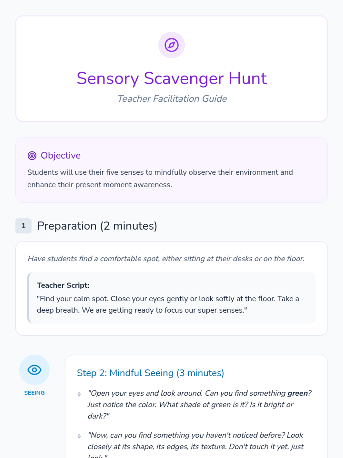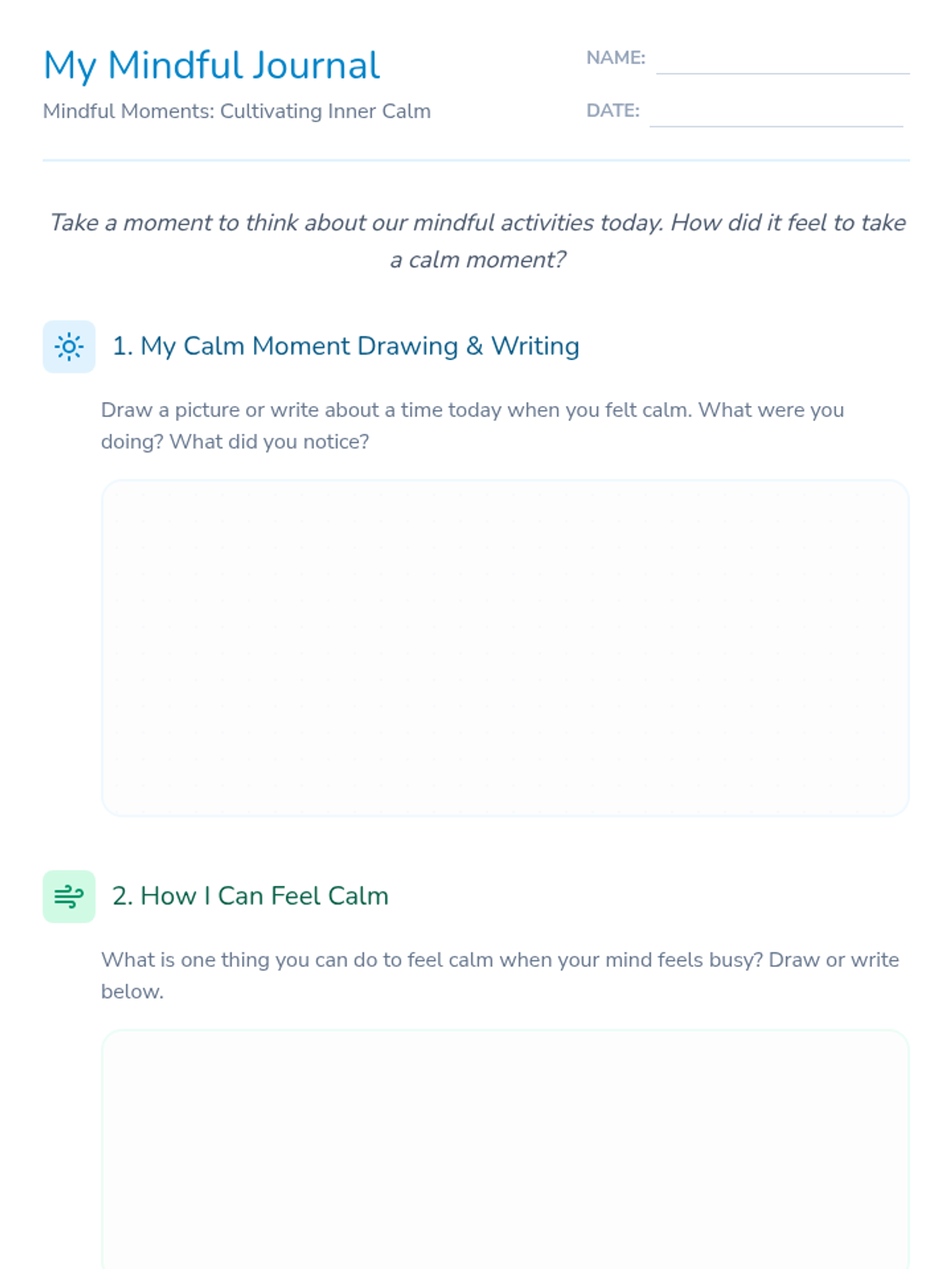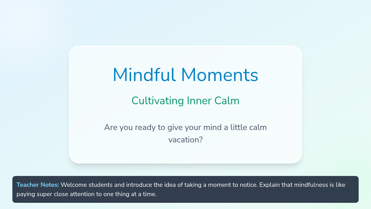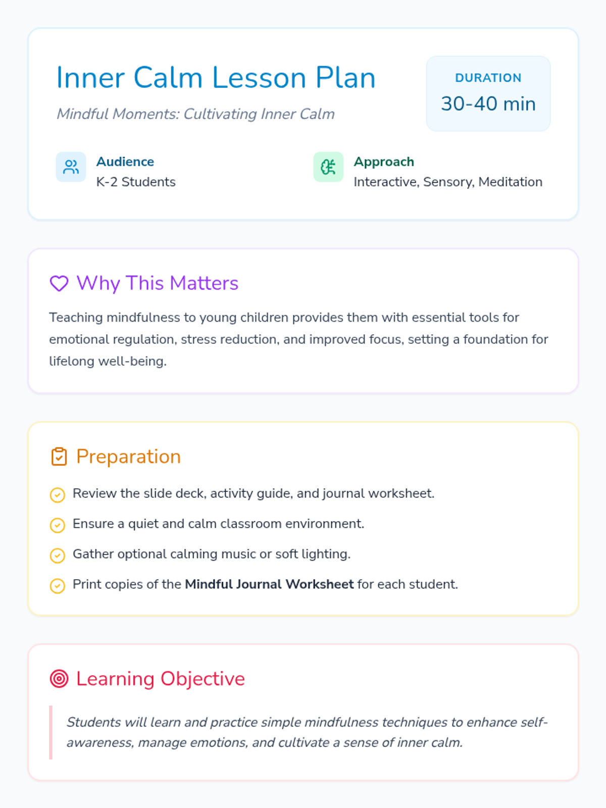 A gentle introduction to mindfulness for K-2 students, focusing on belly breathing and sensory awareness to cultivate inner calm.