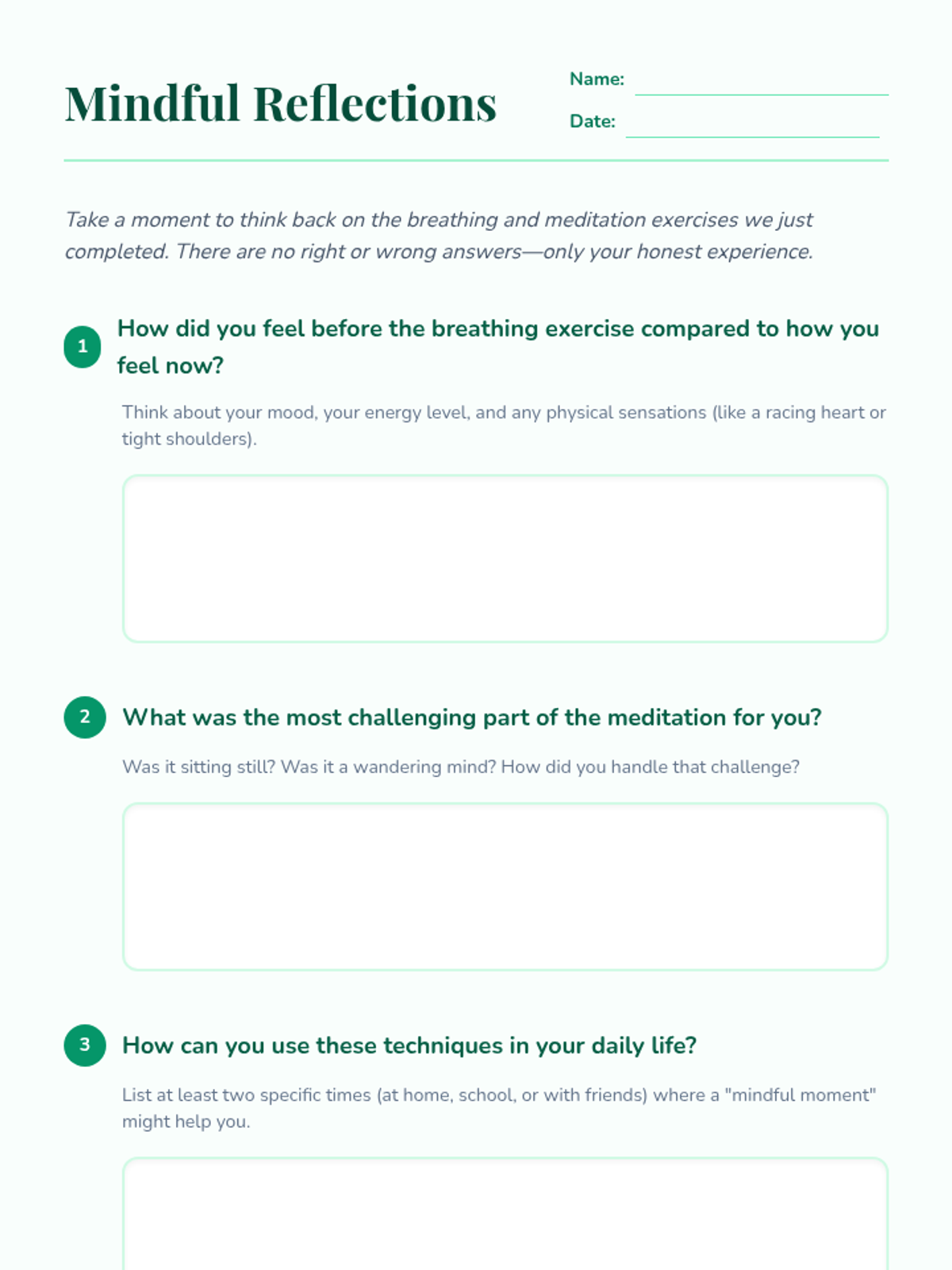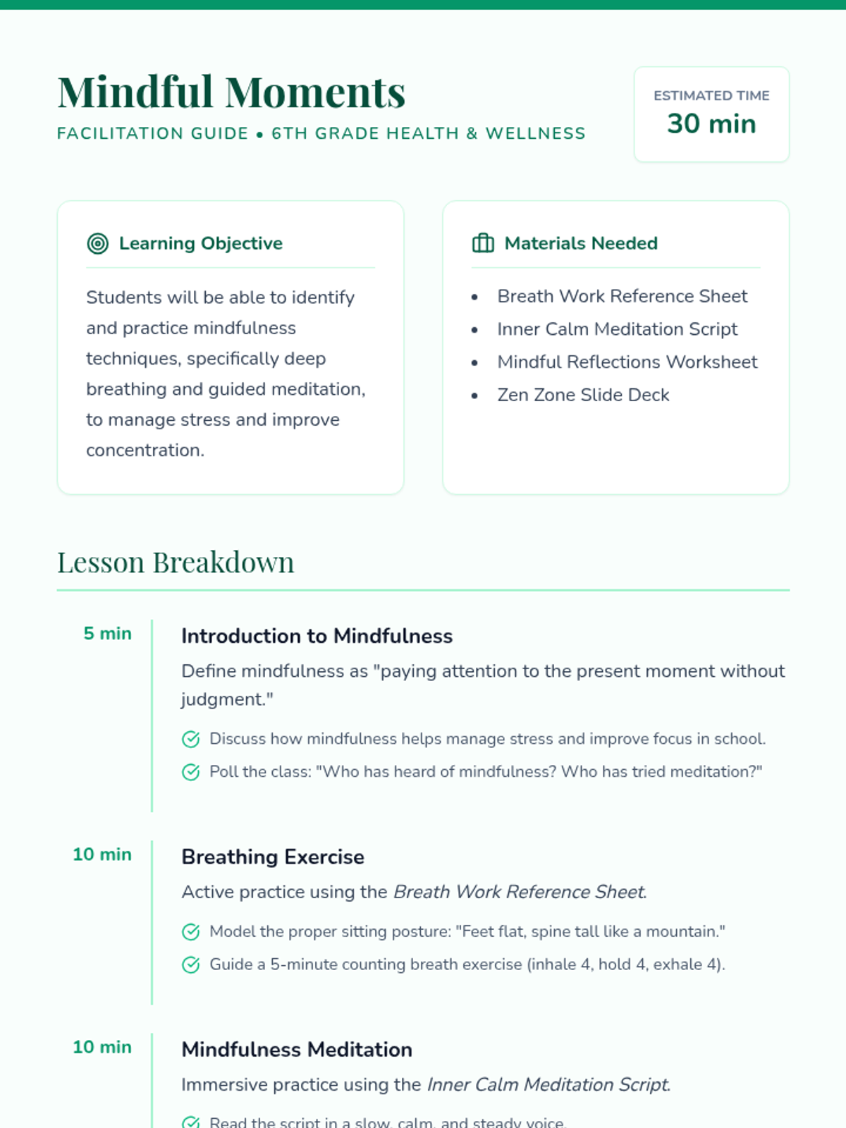 This lesson introduces 6th-grade students to mindfulness techniques to help them manage stress and anxiety through breathing exercises and guided meditation. Students will learn practical tools to enhance focus, relaxation, and emotional well-being in their daily lives.