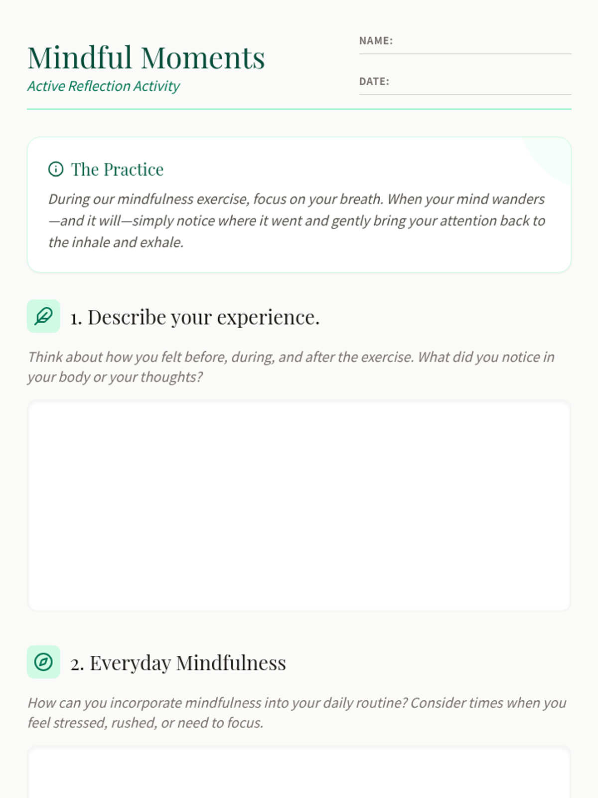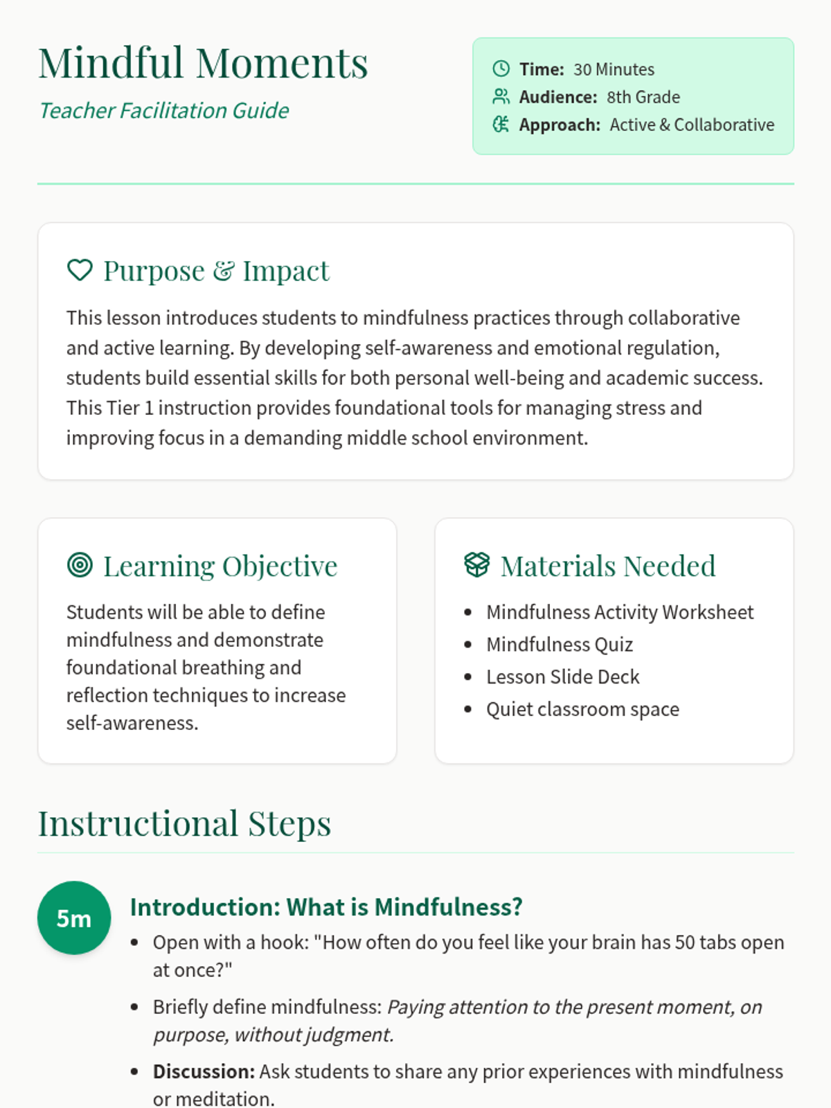 An introductory mindfulness lesson for 8th-grade students to foster self-awareness and emotional regulation through active breathing exercises and reflection.