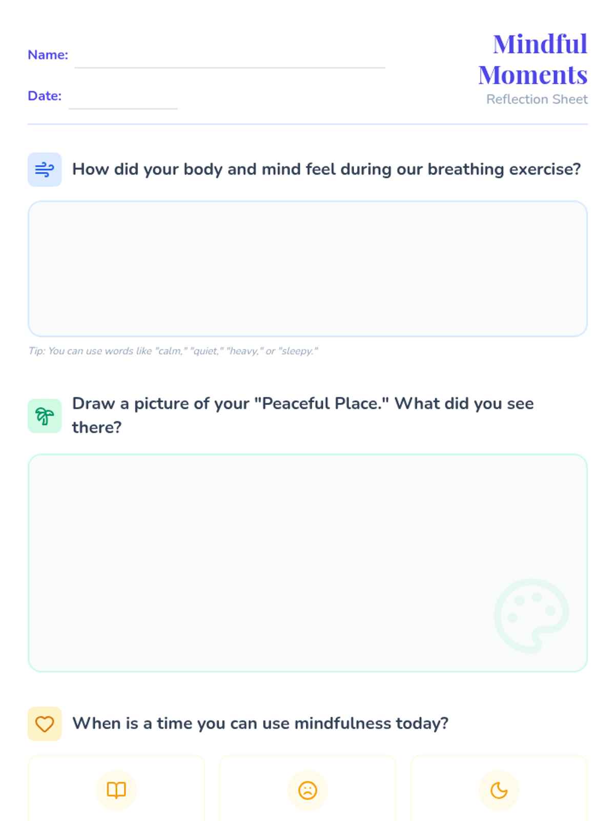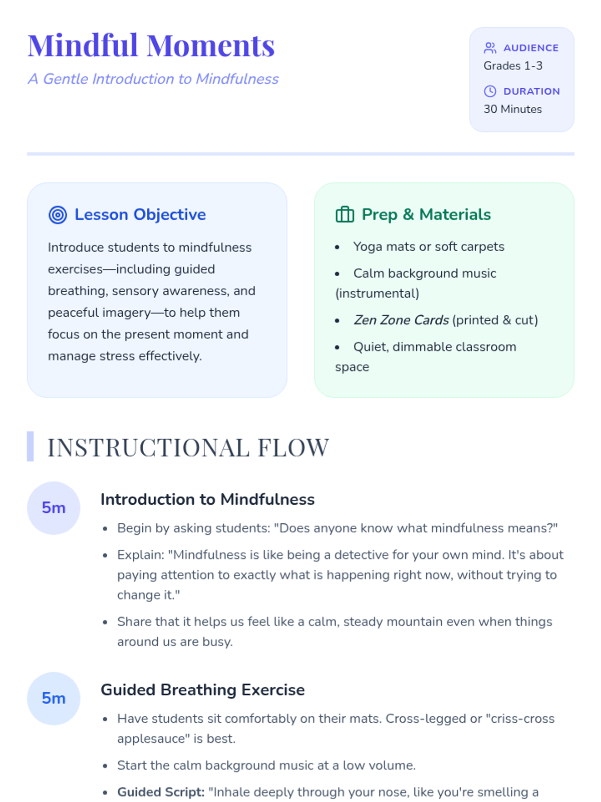 A gentle introduction to mindfulness for young students (grades 1-3), featuring guided breathing, sensory awareness, and peaceful imagery to build emotional regulation skills.