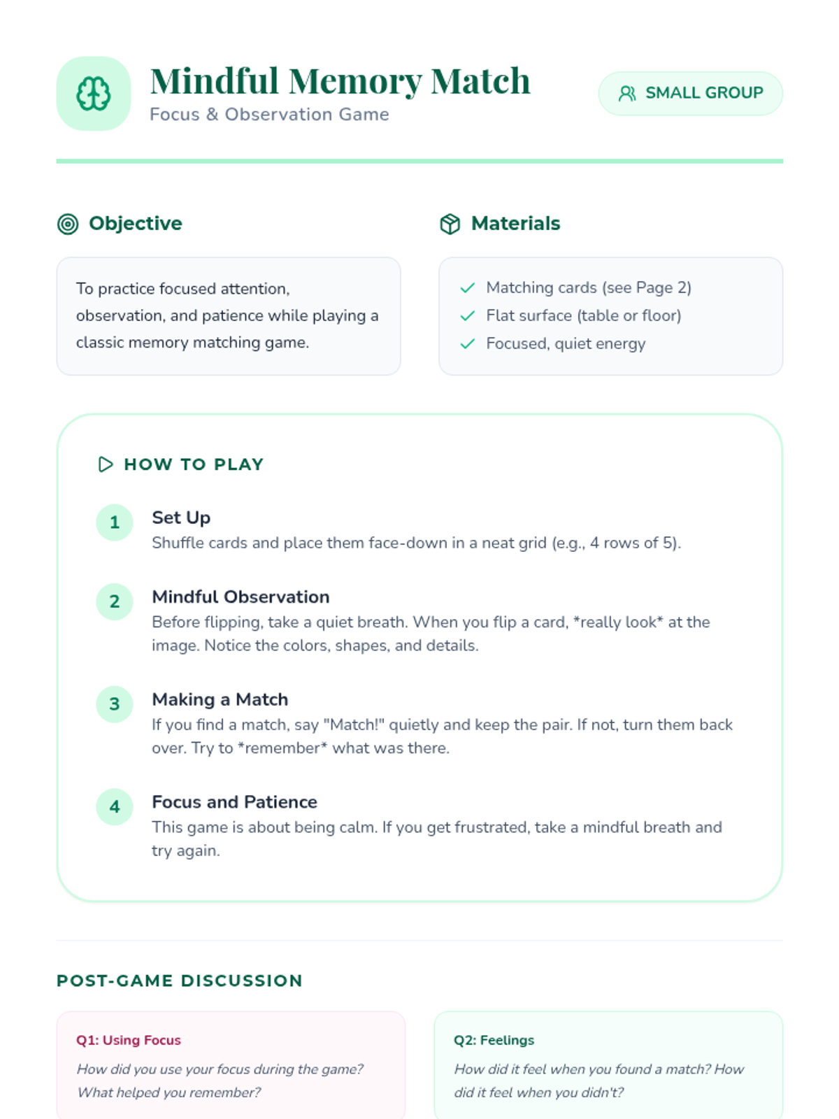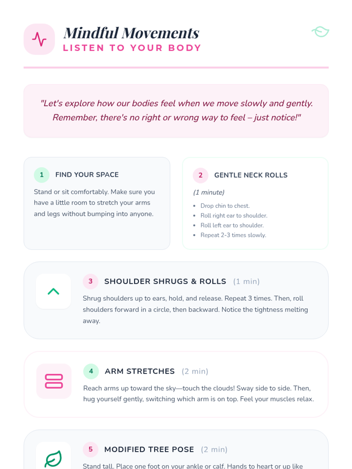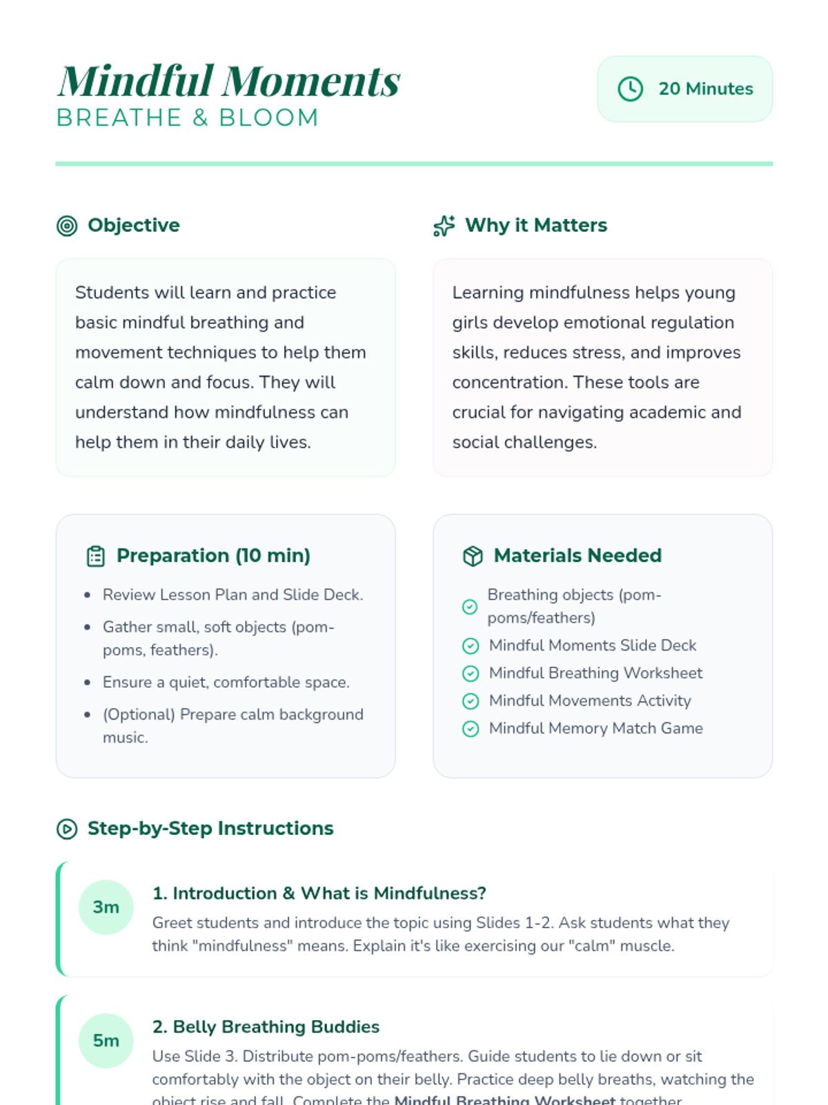 This lesson introduces 3rd-grade girls to simple mindfulness activities, including belly breathing and gentle movement, to help manage emotions and improve focus in a small-group setting.