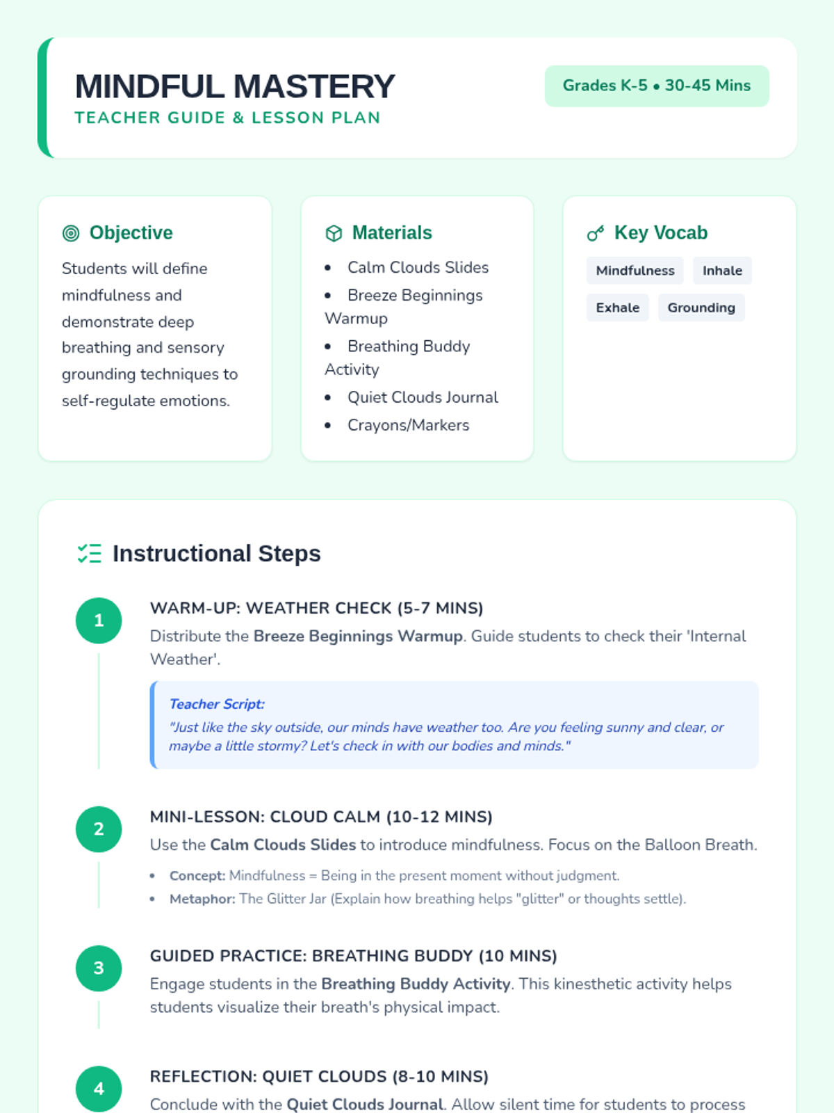 A foundational SEL lesson for K-5 students focused on introductory mindfulness techniques, deep breathing exercises, and sensory awareness to support emotional regulation and focus.