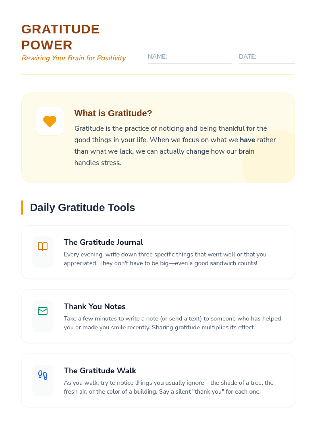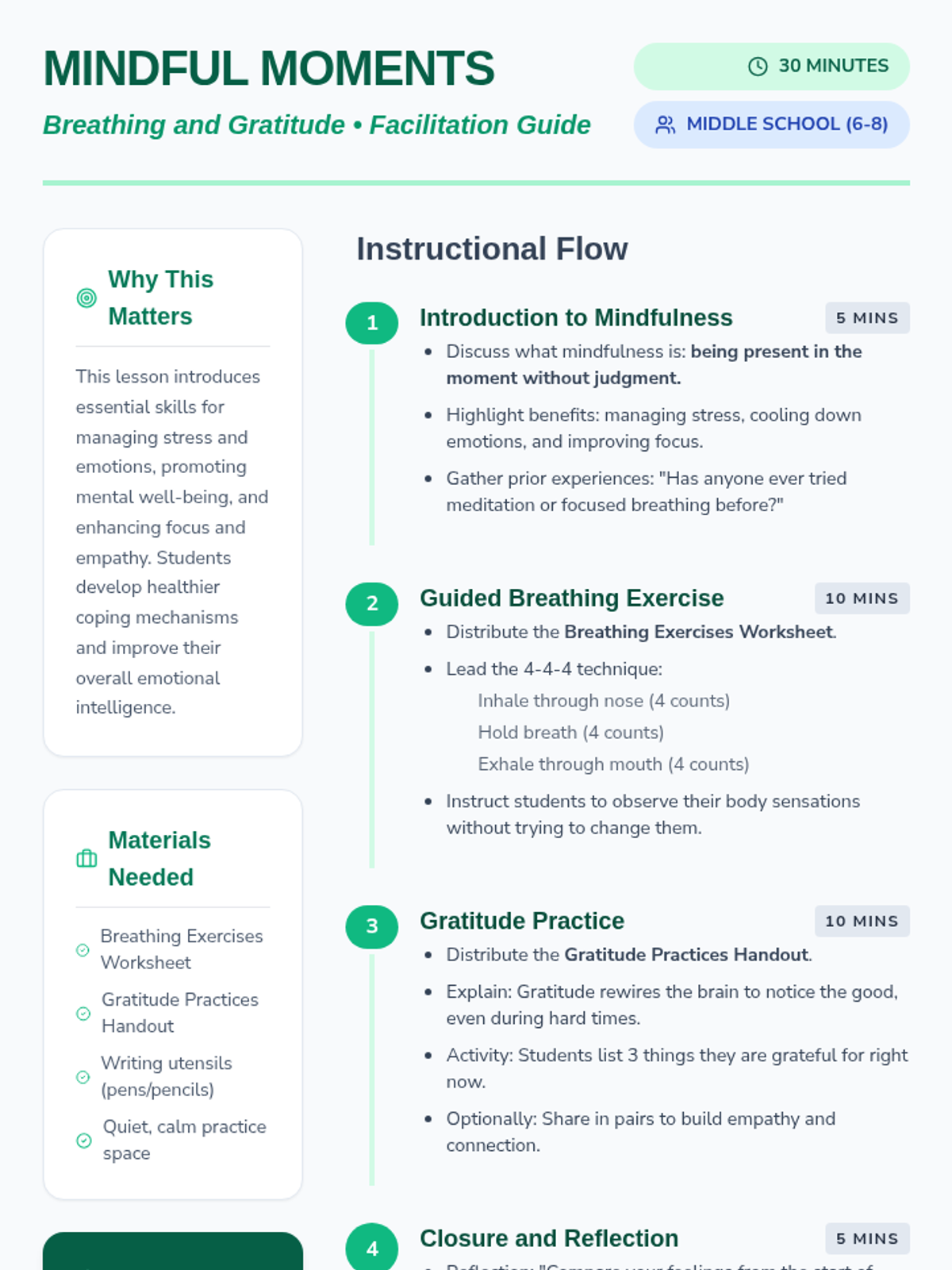 This lesson introduces middle school students to mindfulness techniques, focusing on breathing exercises and gratitude practices to manage stress and enhance focus.
