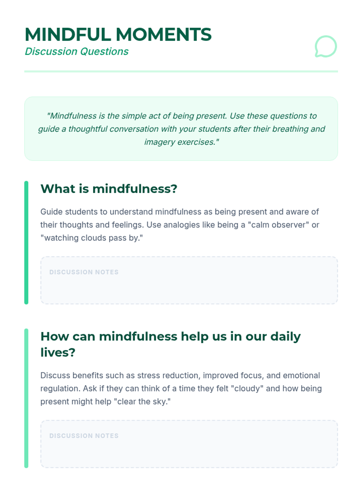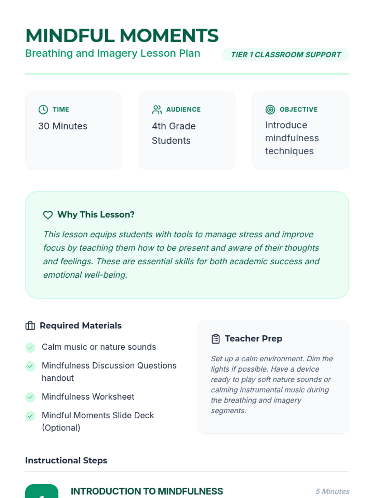 This lesson introduces 4th grade students to mindfulness through simple breathing exercises and guided imagery to help manage stress and improve focus.