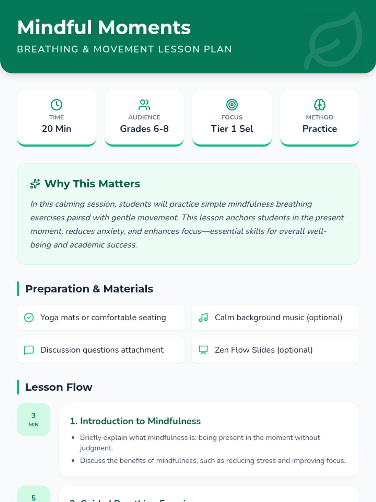 A calming Tier 1 session for middle schoolers to practice mindful breathing and gentle movement to reduce anxiety and enhance focus.
