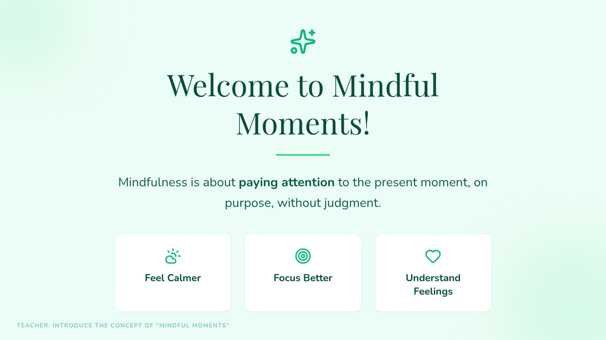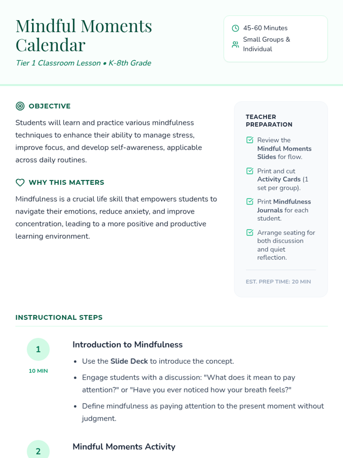 A single-session lesson for K-8 students exploring mindfulness techniques to manage stress and improve focus through short, engaging daily practices.