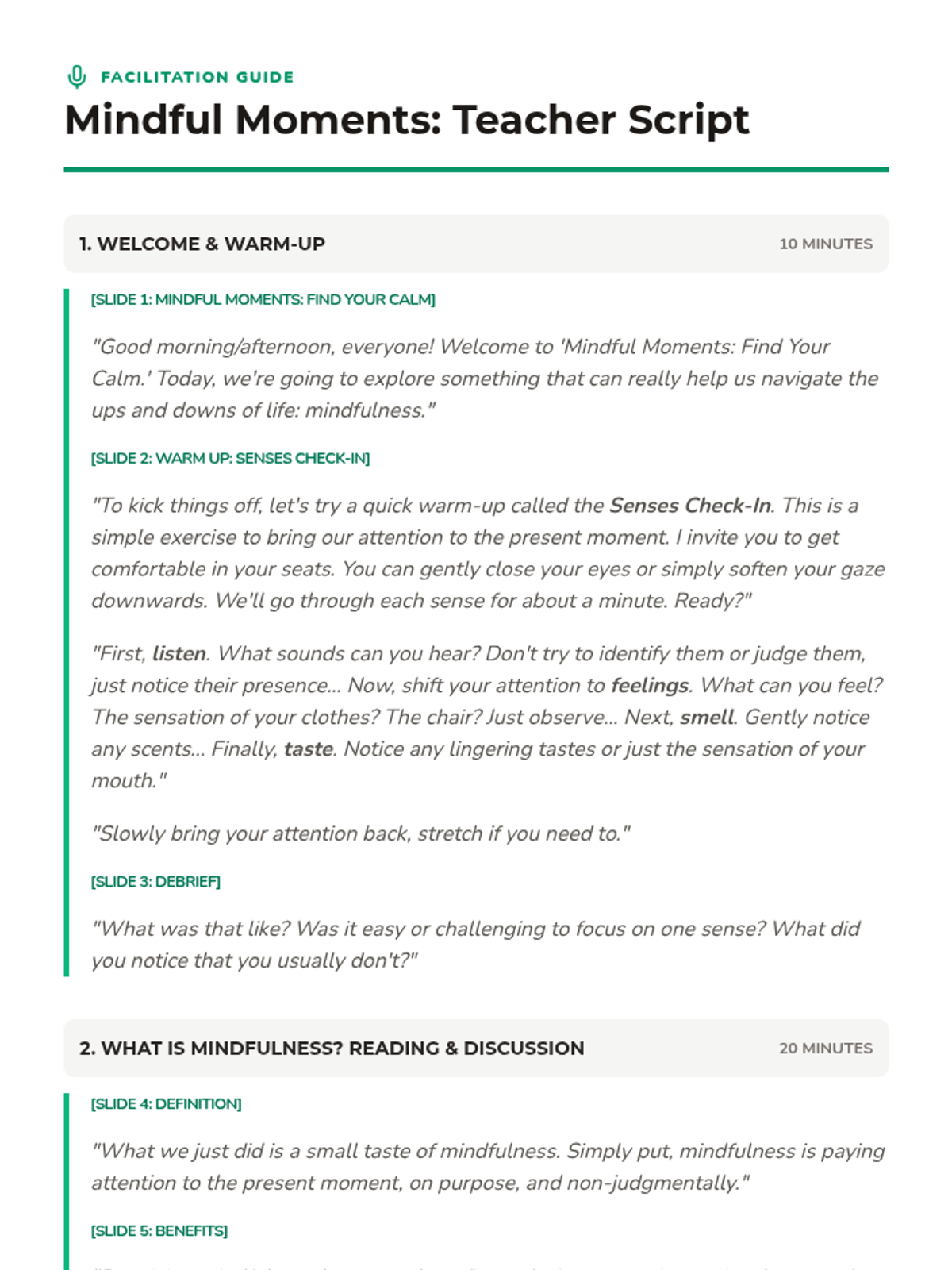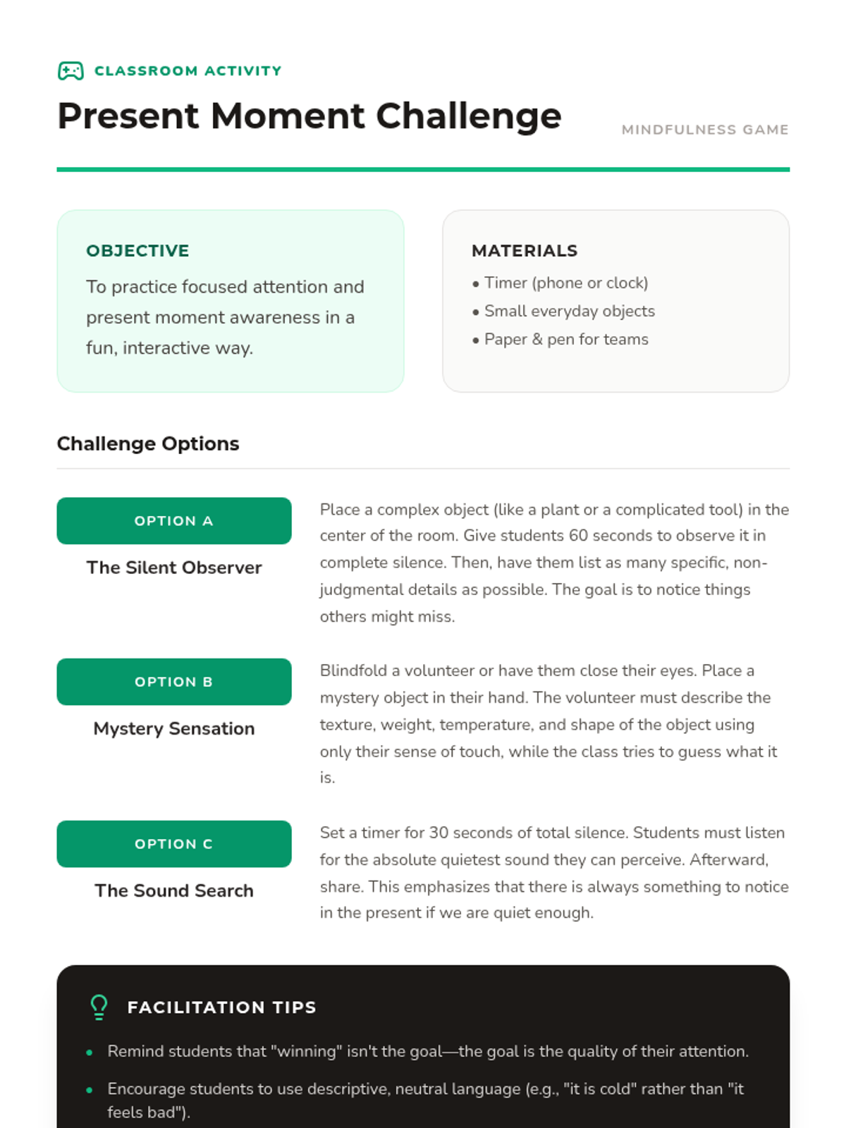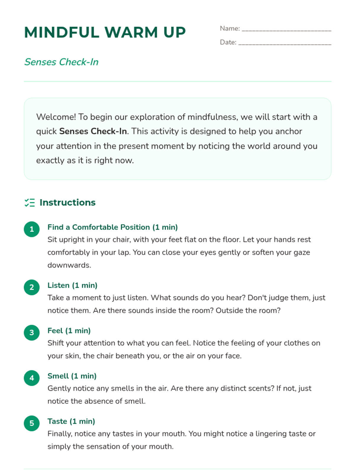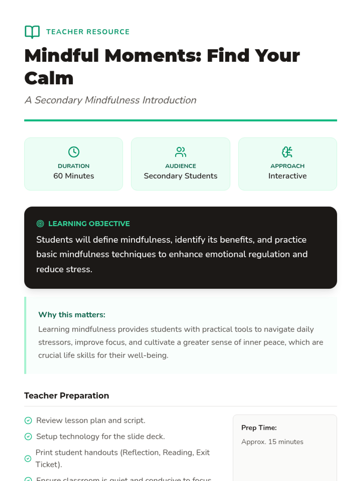 A comprehensive 60-minute lesson introducing secondary students to mindfulness through sensory awareness, guided breathing, and reflective practice to improve emotional regulation and reduce stress.