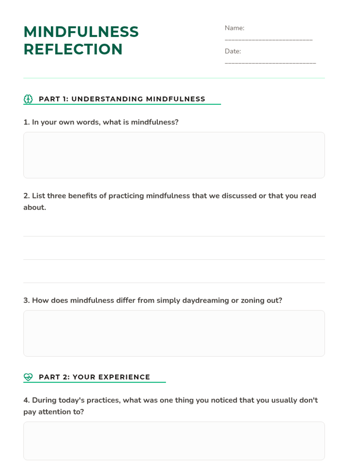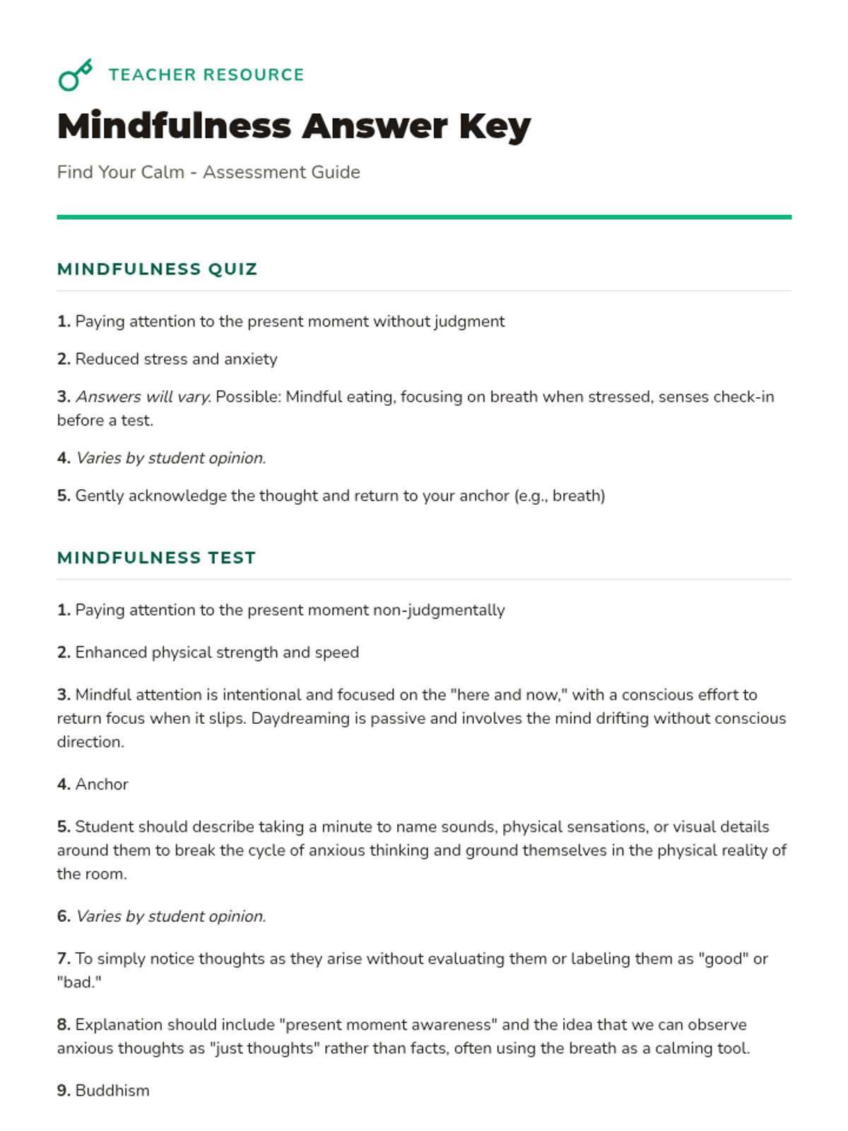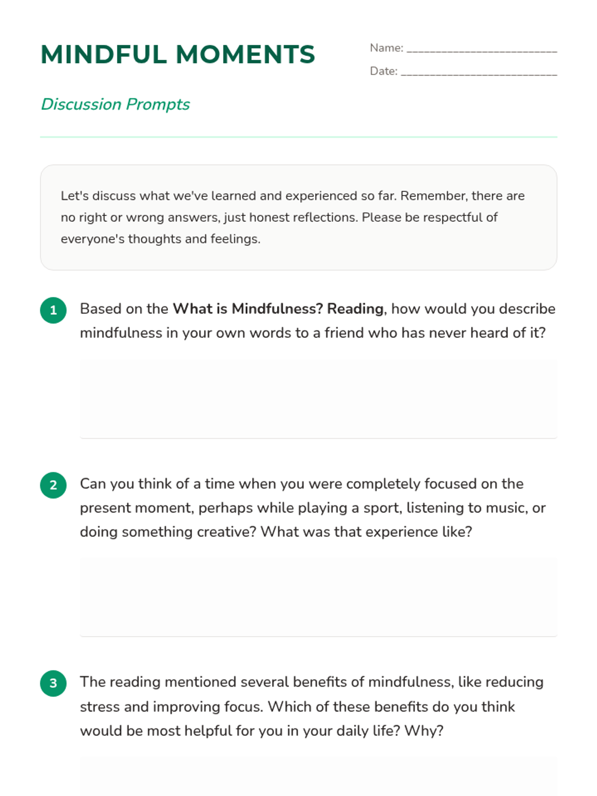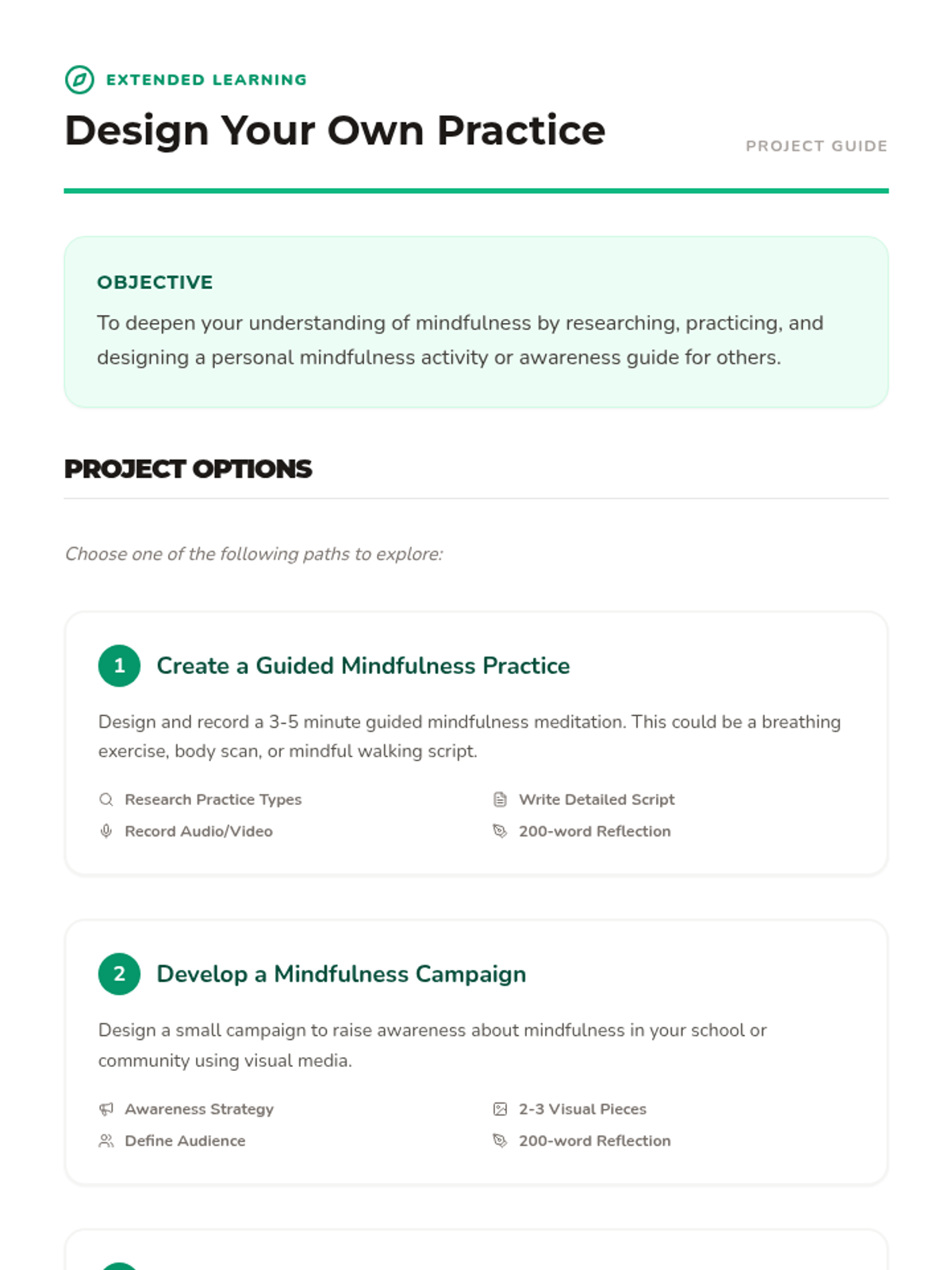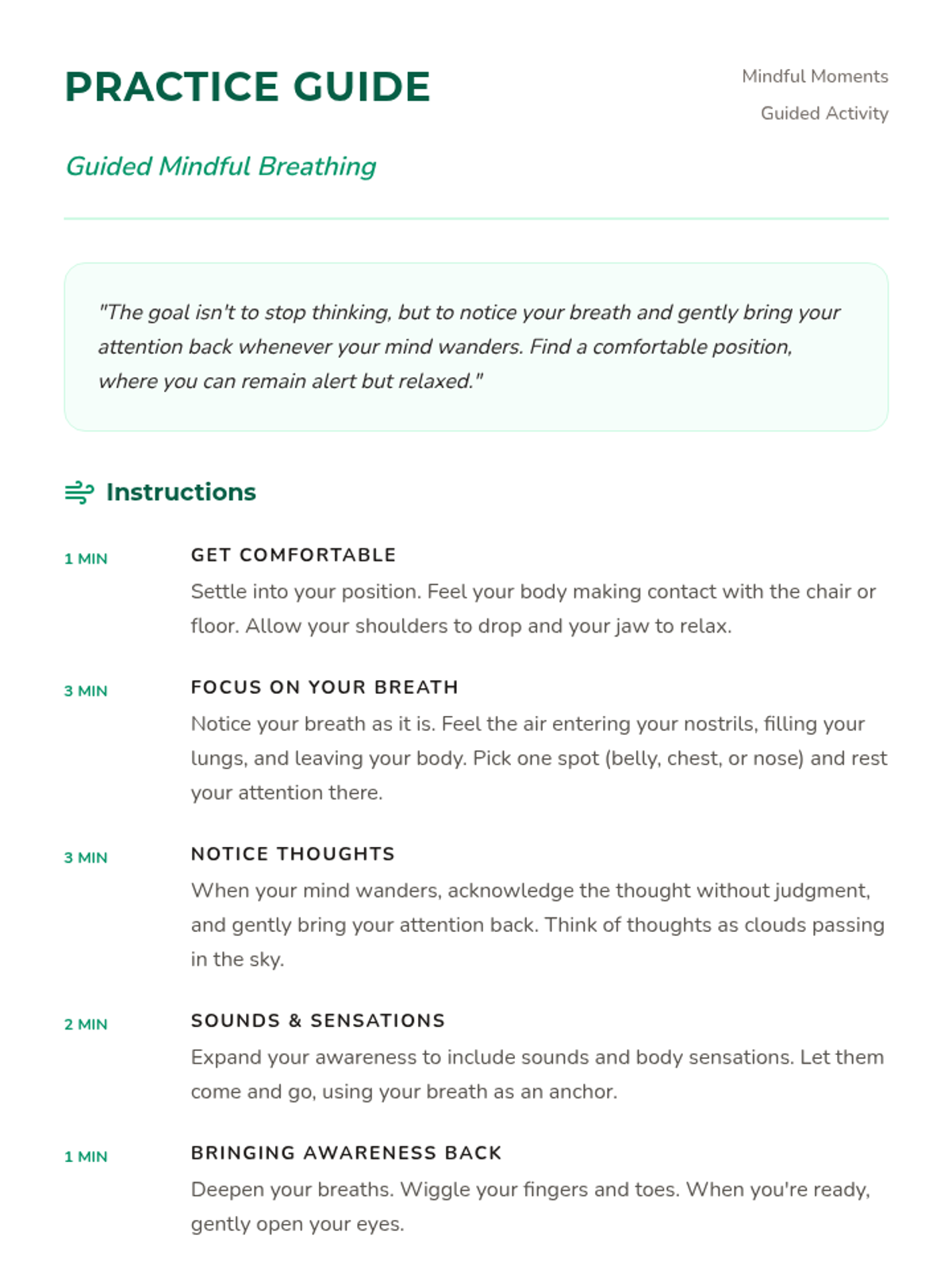 A comprehensive 60-minute lesson introducing secondary students to mindfulness through sensory awareness, guided breathing, and reflective practice to improve emotional regulation and reduce stress.