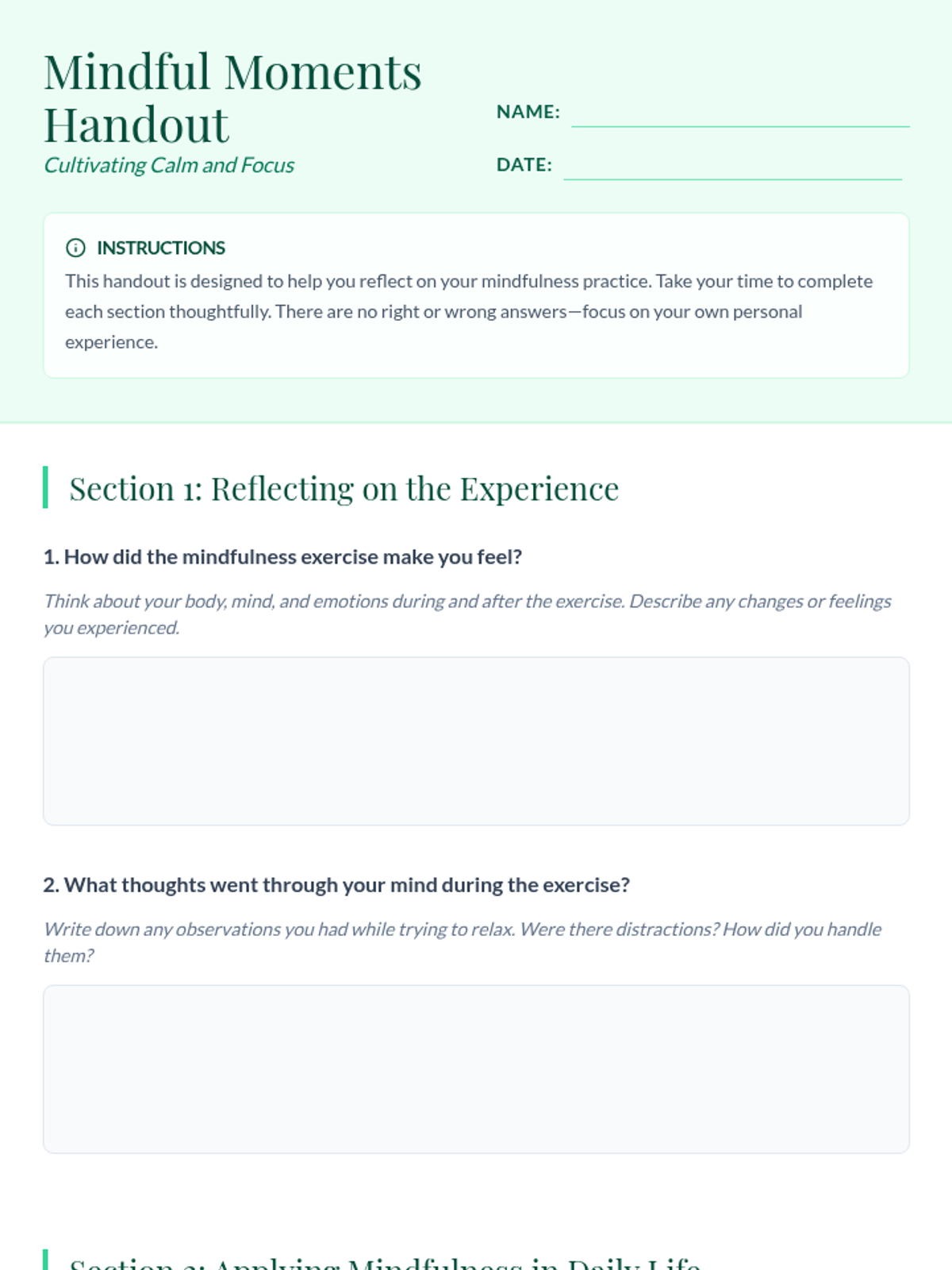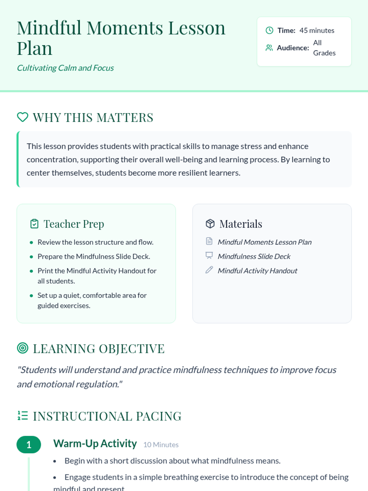 This lesson introduces students to mindfulness, providing practical techniques to improve focus and emotional regulation through guided exercises and reflection.