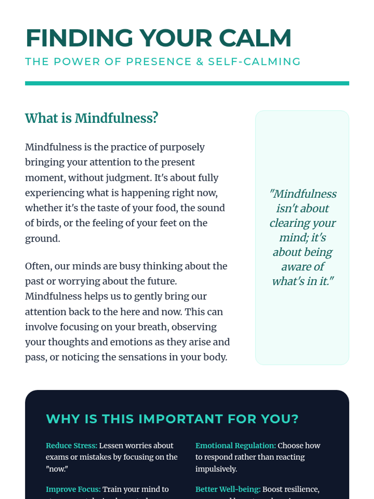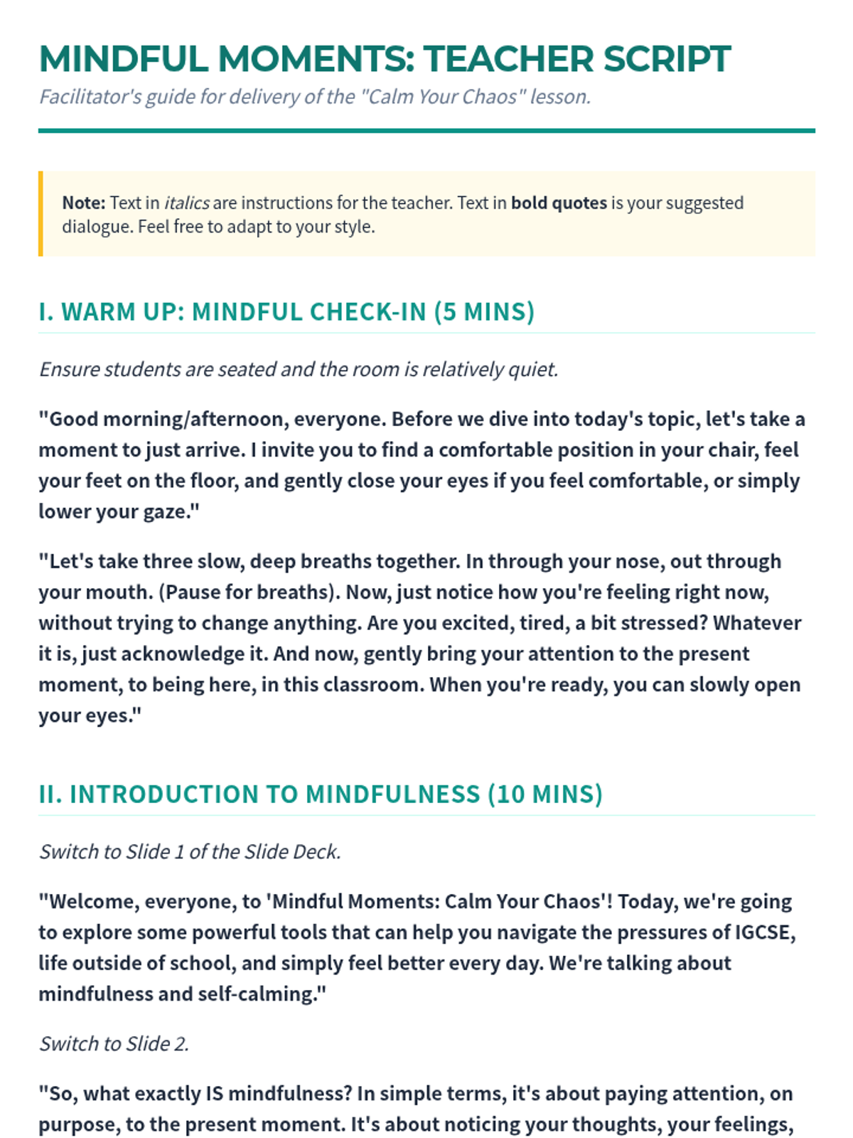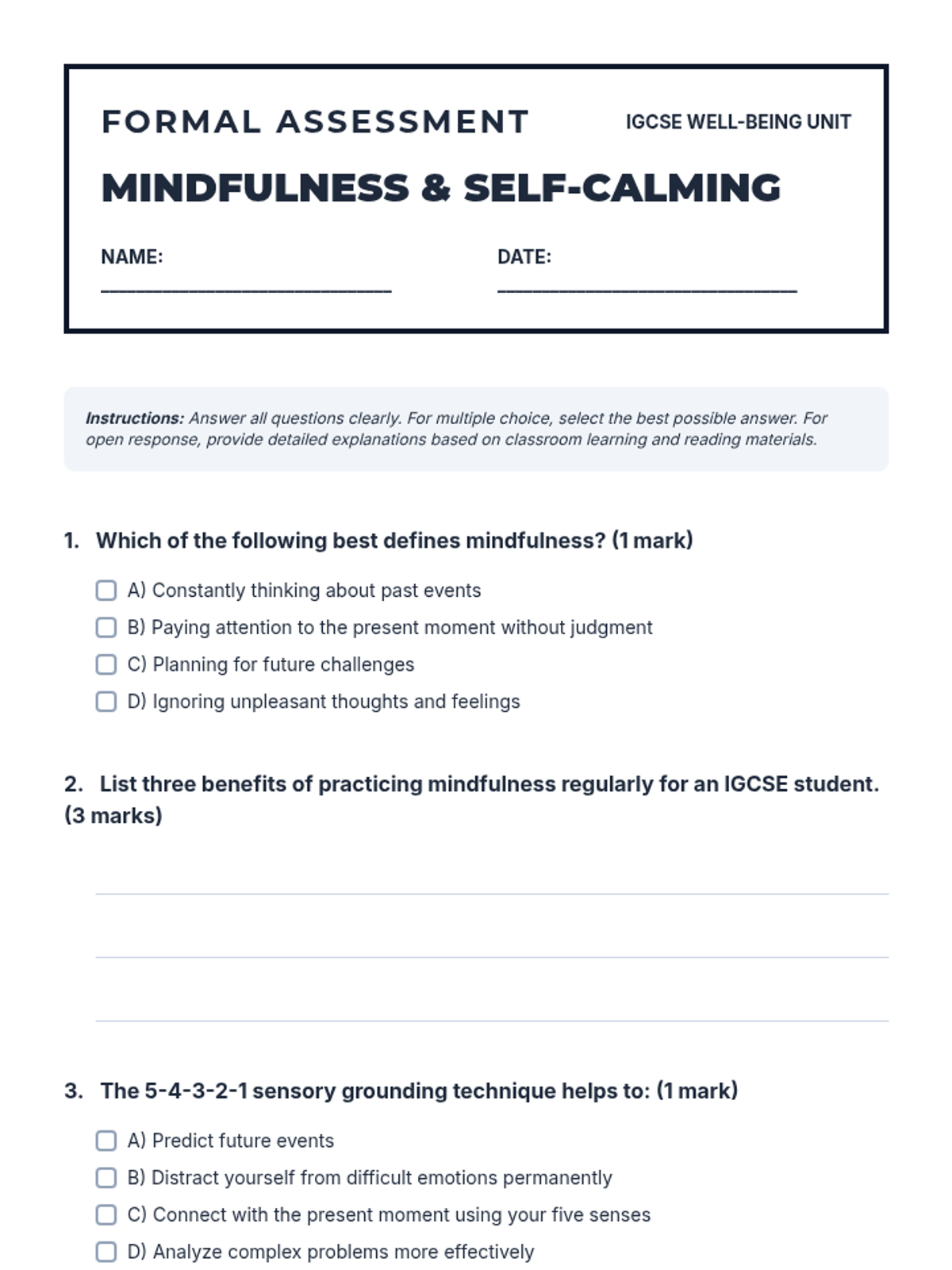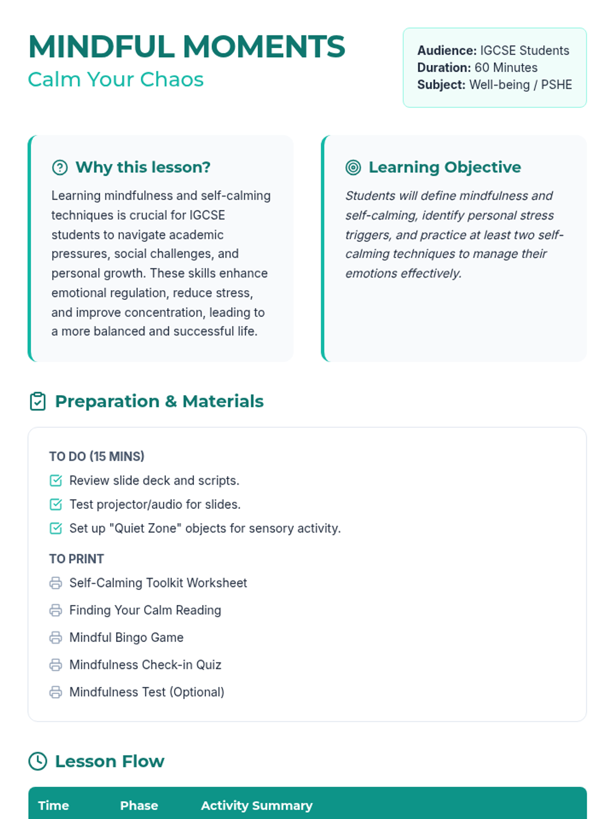 A comprehensive one-hour lesson for IGCSE students focused on mindfulness and self-calming techniques to manage academic and personal stress. Students will explore practical tools like deep breathing and sensory grounding to enhance emotional well-being and focus.