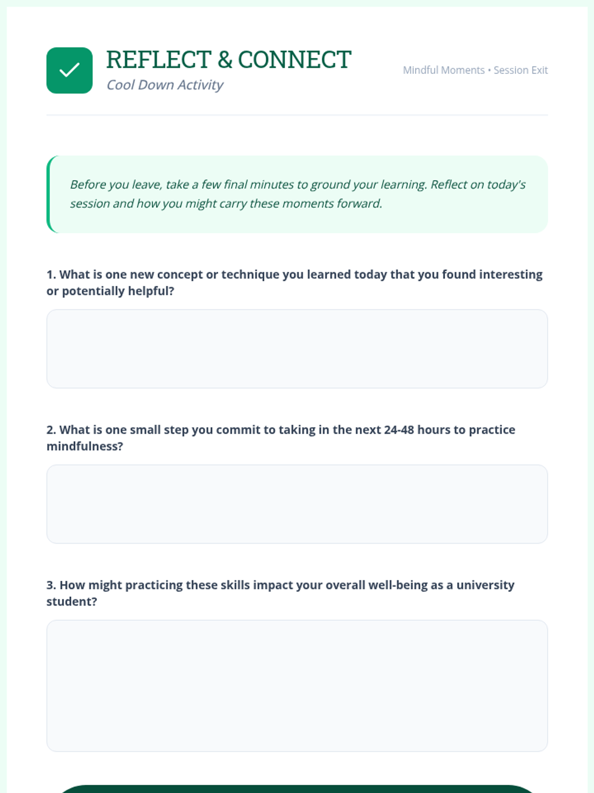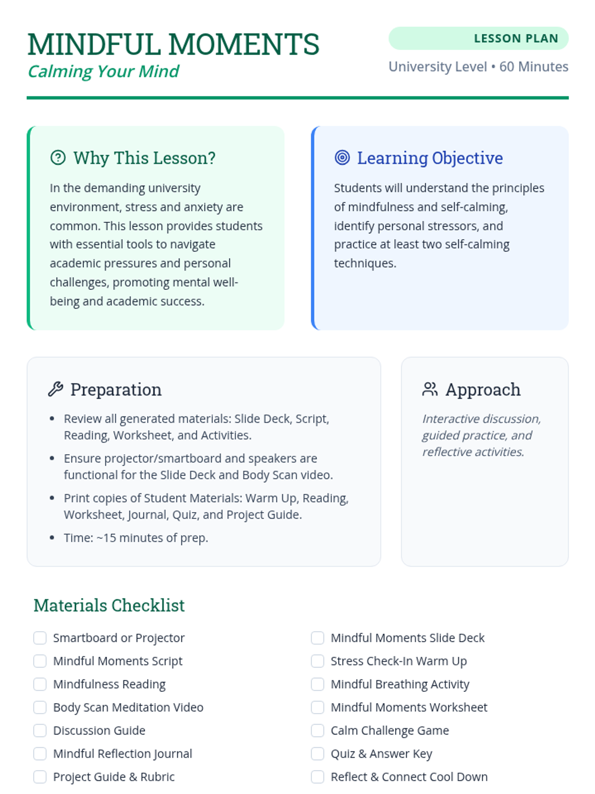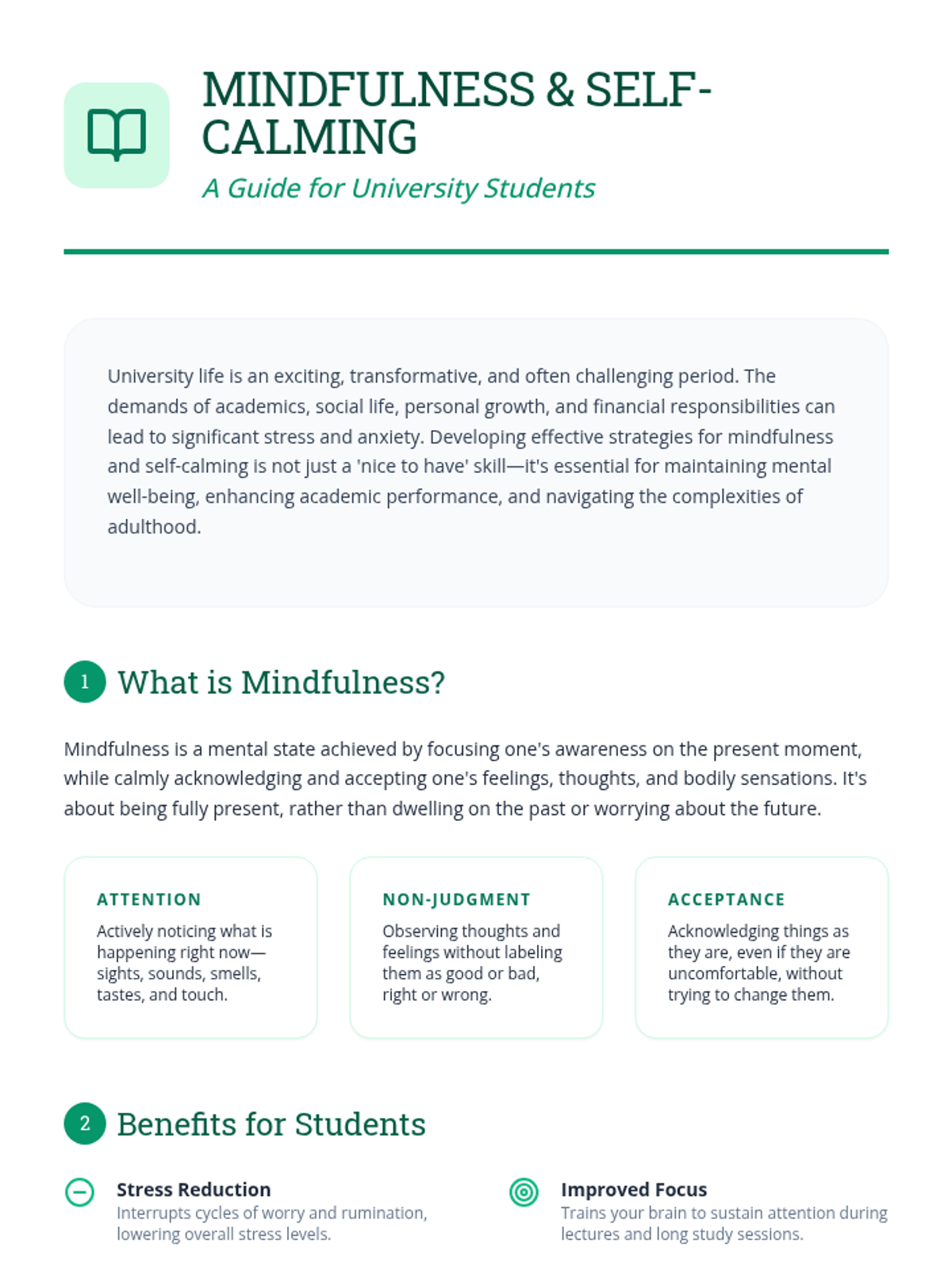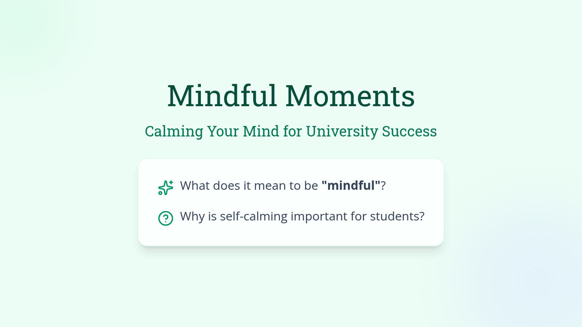 A 60-minute session for university students exploring mindfulness and self-calming techniques to manage academic stress and enhance focus.