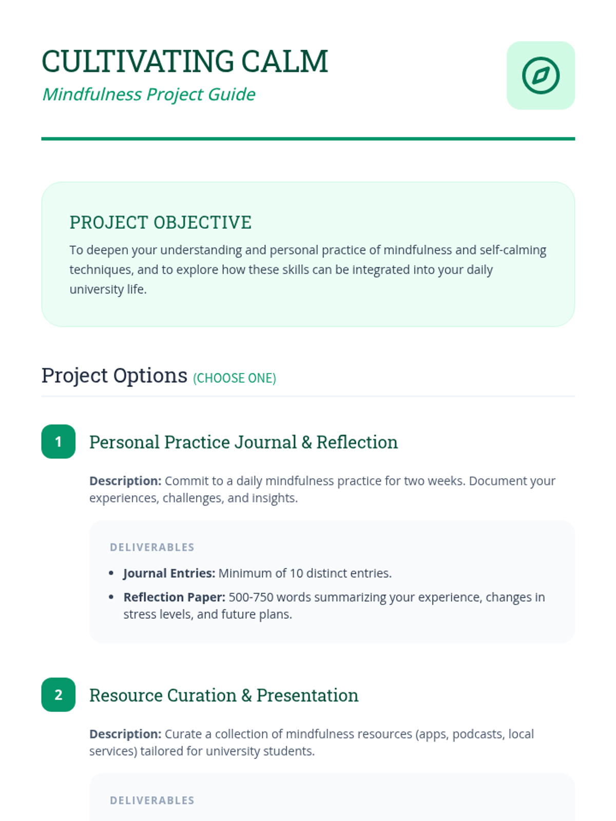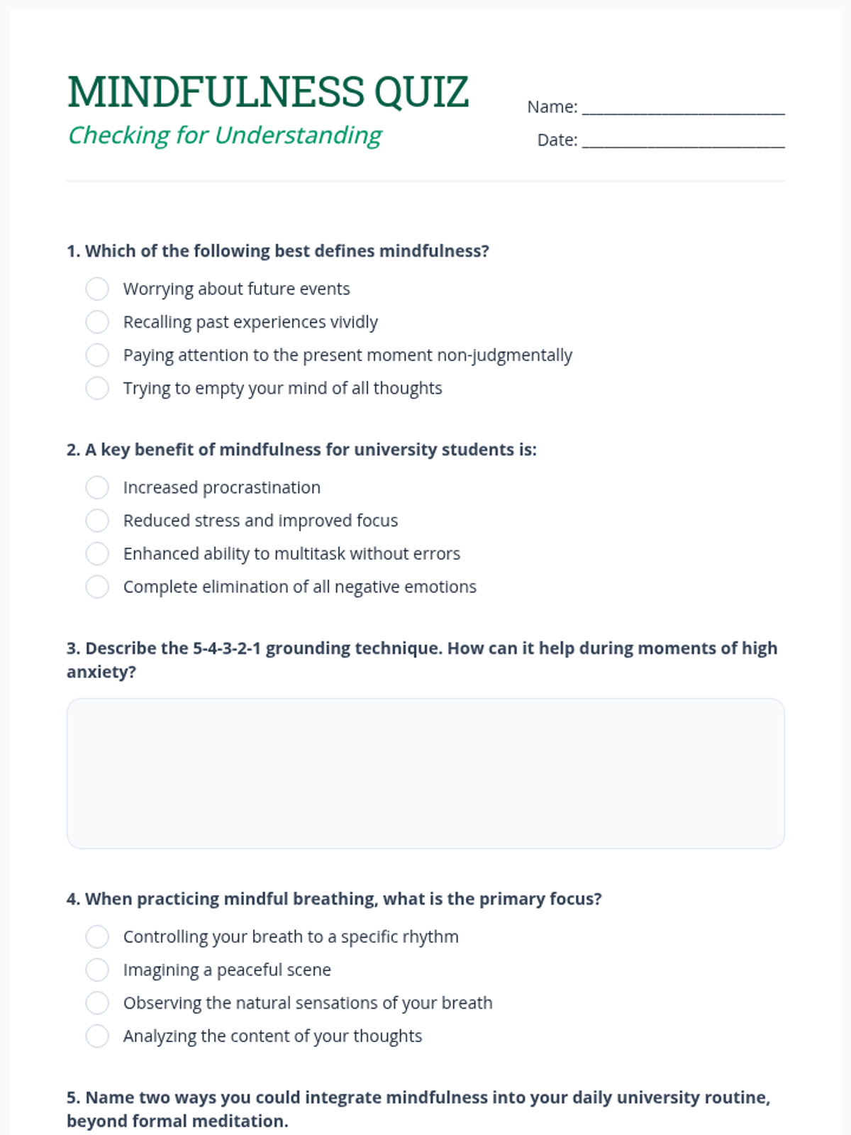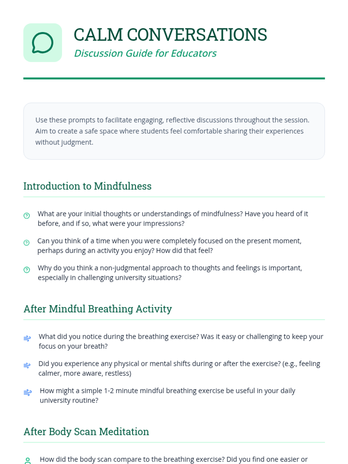 A 60-minute session for university students exploring mindfulness and self-calming techniques to manage academic stress and enhance focus.