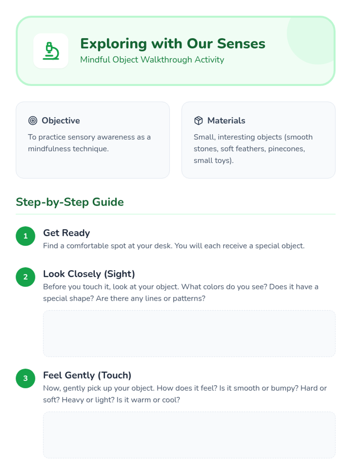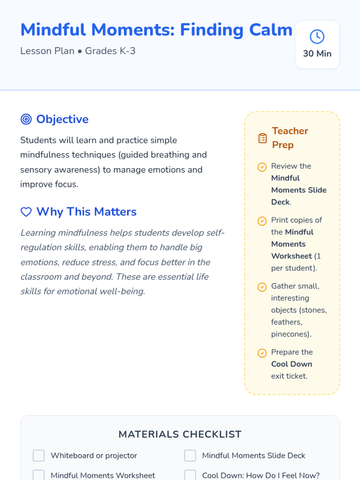 A 30-minute introductory mindfulness lesson for K-3 students focusing on belly breathing and sensory awareness to help manage emotions and improve focus.
