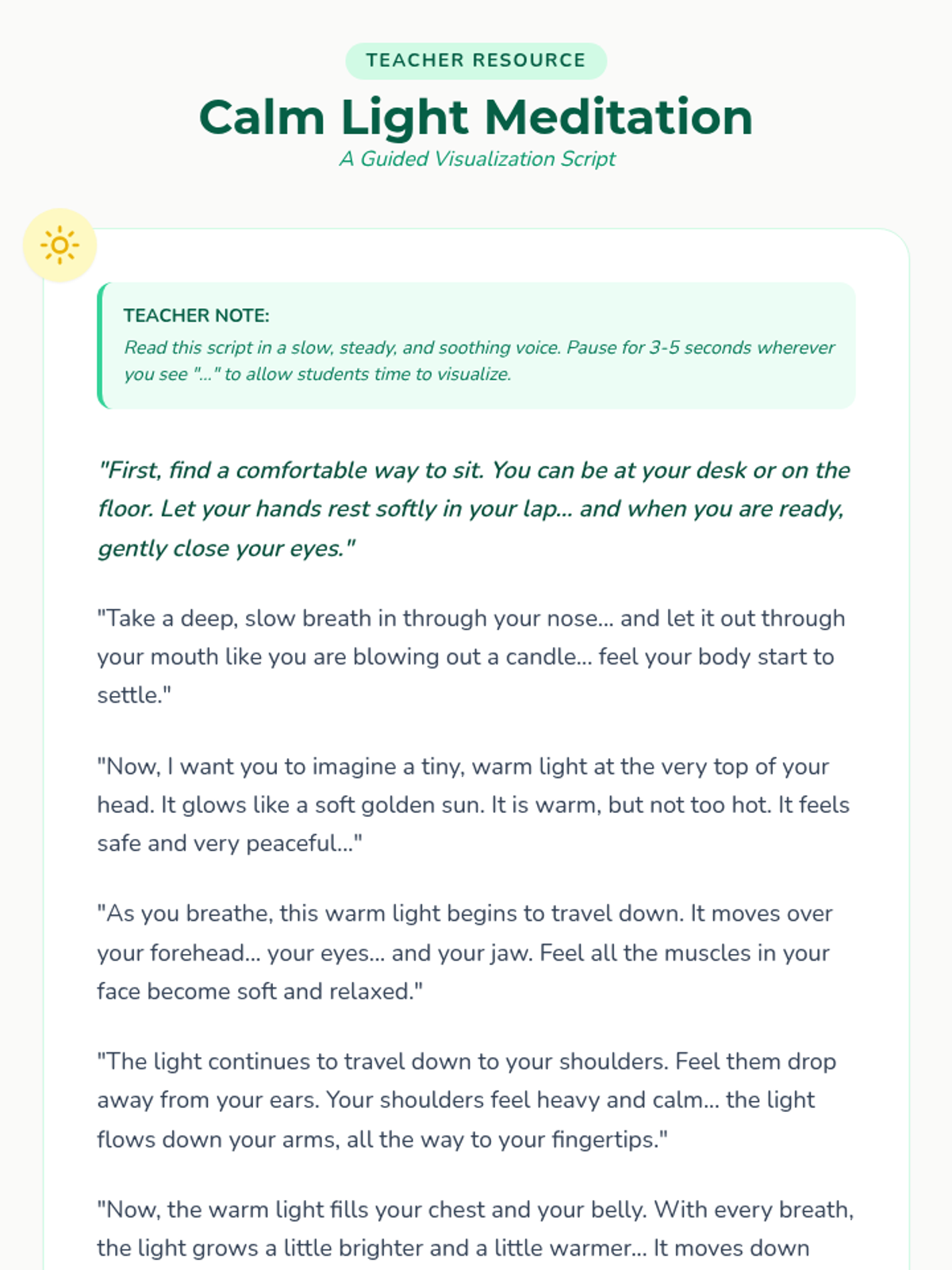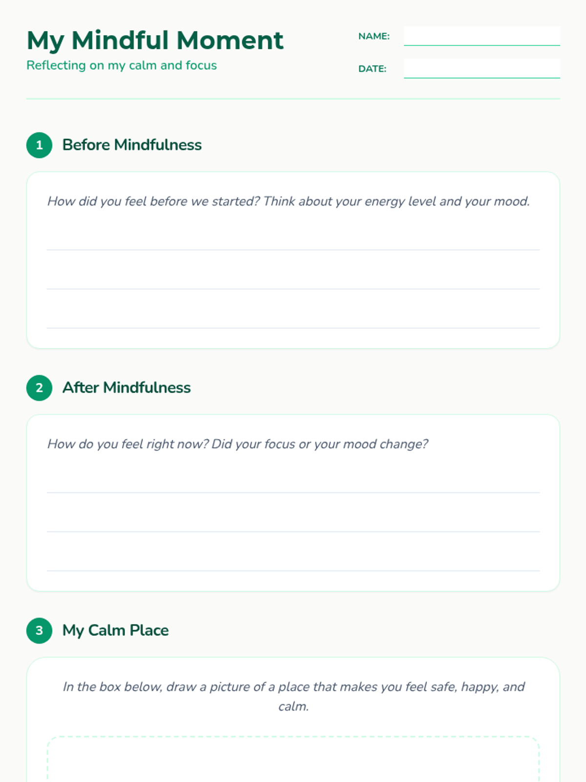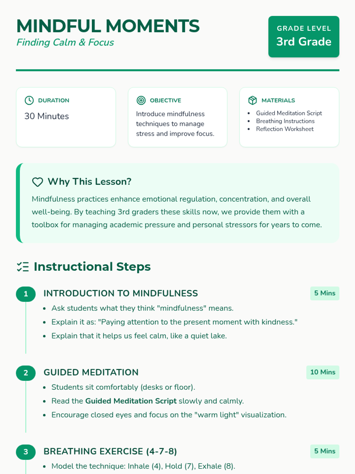 This lesson introduces 3rd-grade students to mindfulness techniques, including guided meditation and breathing exercises, to help them manage stress and improve focus. students will learn to regulate emotions and enhance concentration through practical, hands-on activities.