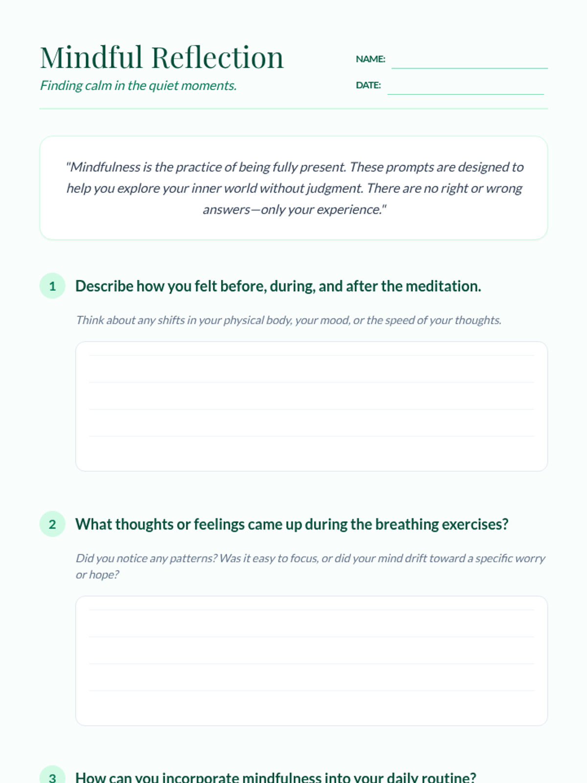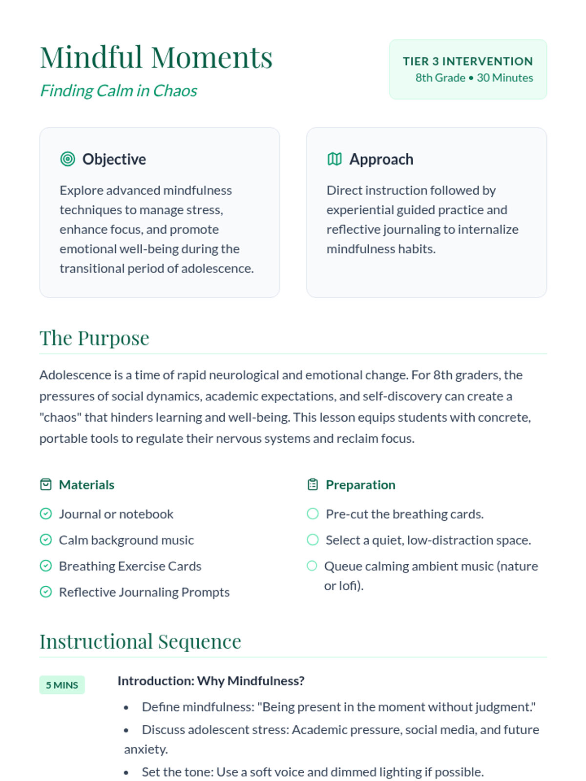 This lesson introduces an 8th-grade student to advanced mindfulness techniques to help manage stress and anxiety through guided meditation, breathing exercises, and reflective journaling.