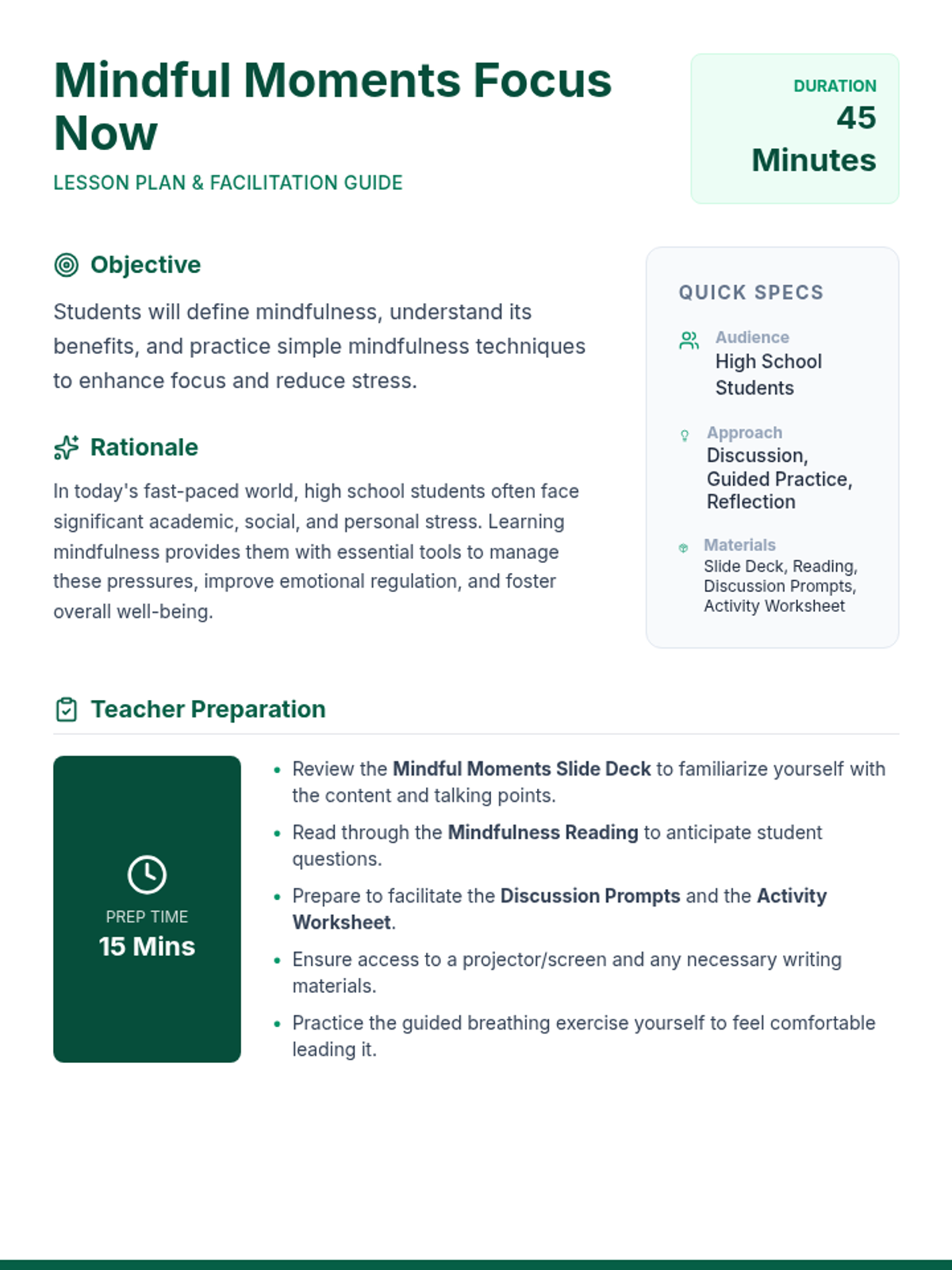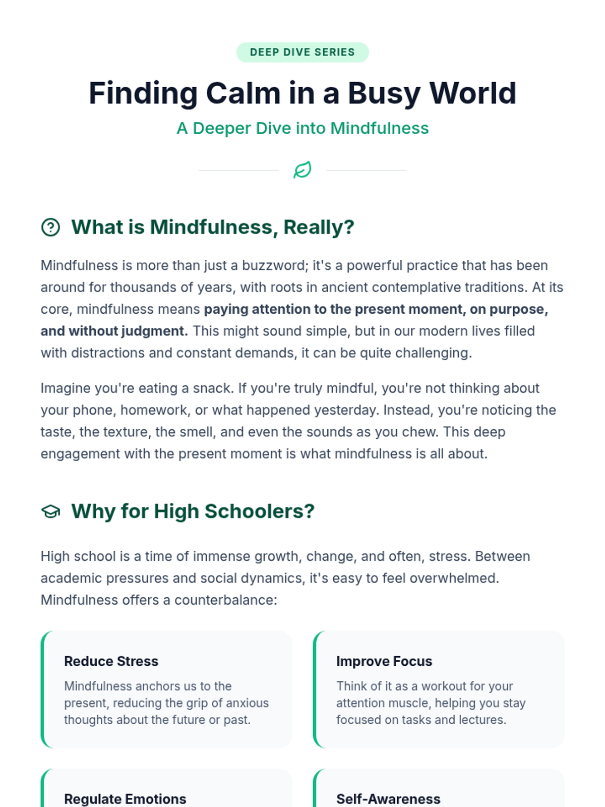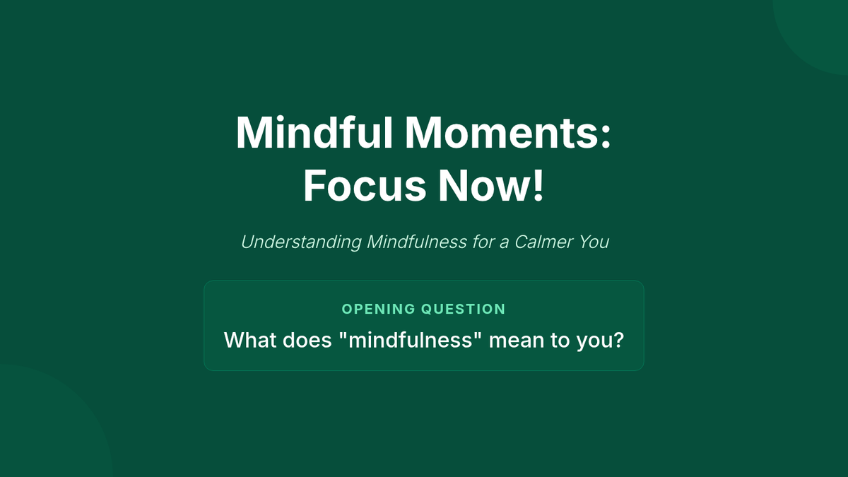 A 45-minute introductory lesson for high school students on the principles of mindfulness, its benefits for stress management and focus, and practical techniques like the STOP skill and guided breathing.