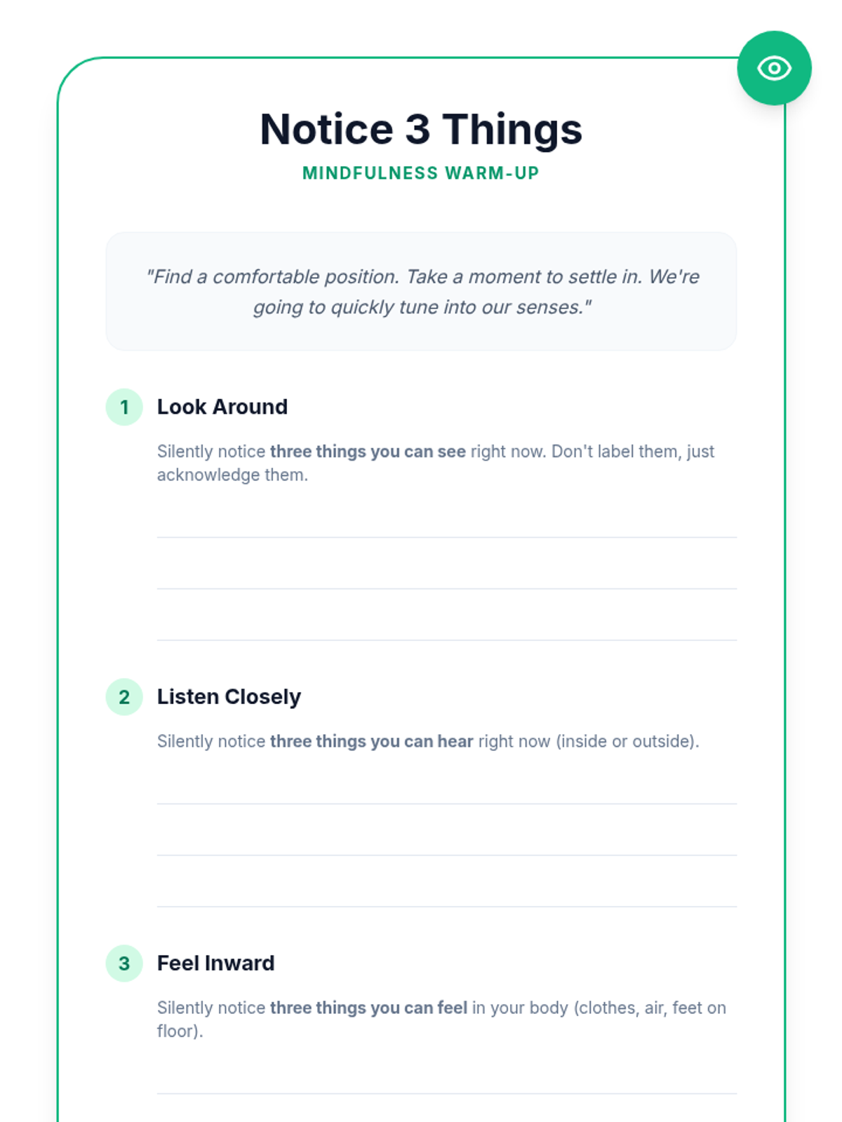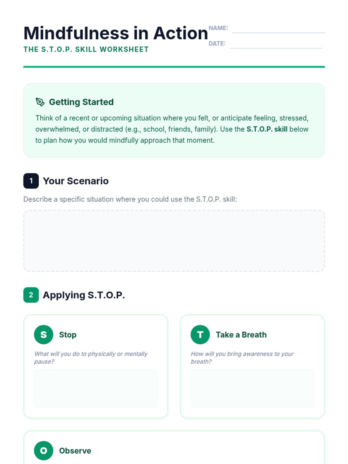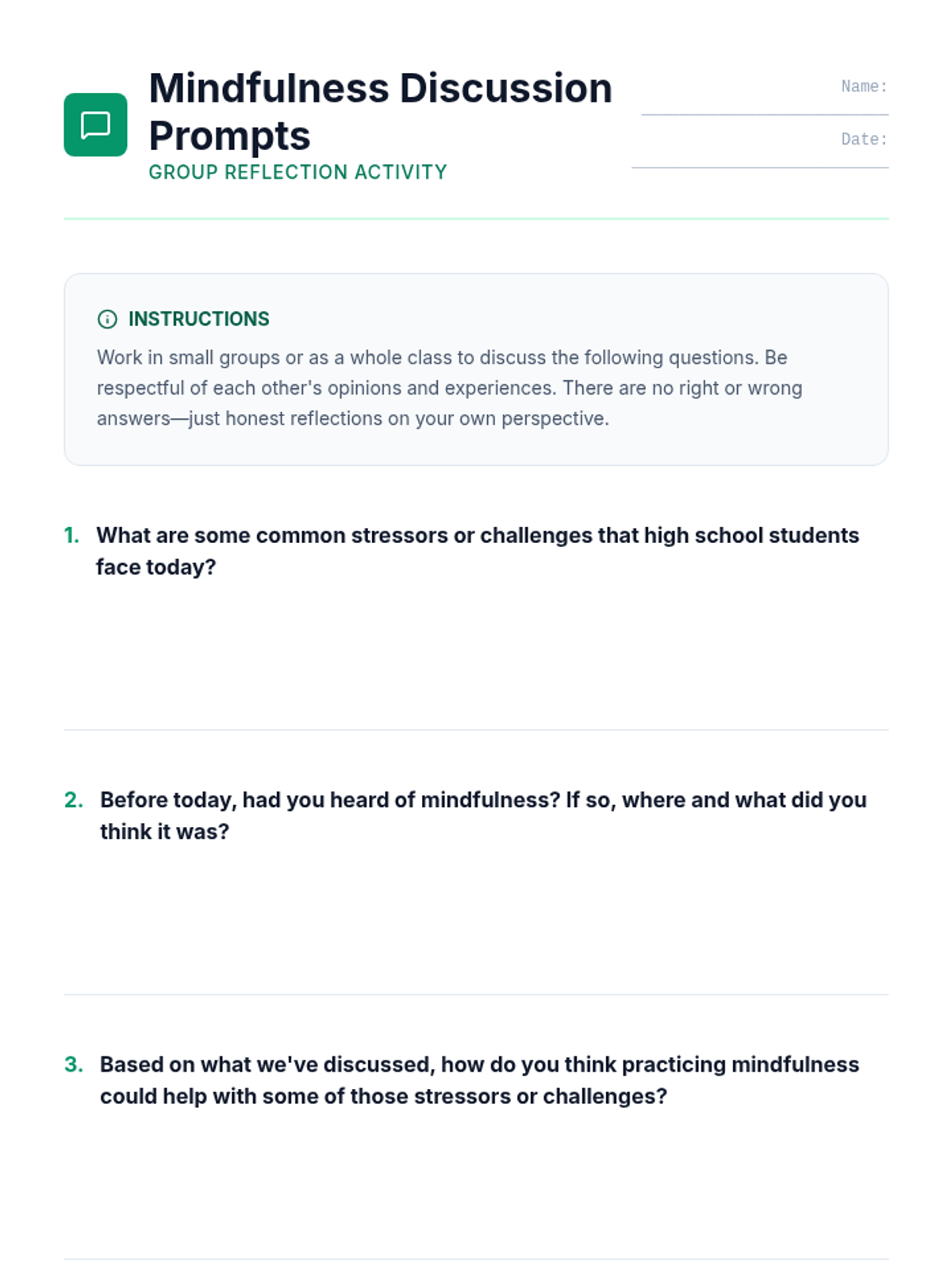 A 45-minute introductory lesson for high school students on the principles of mindfulness, its benefits for stress management and focus, and practical techniques like the STOP skill and guided breathing.