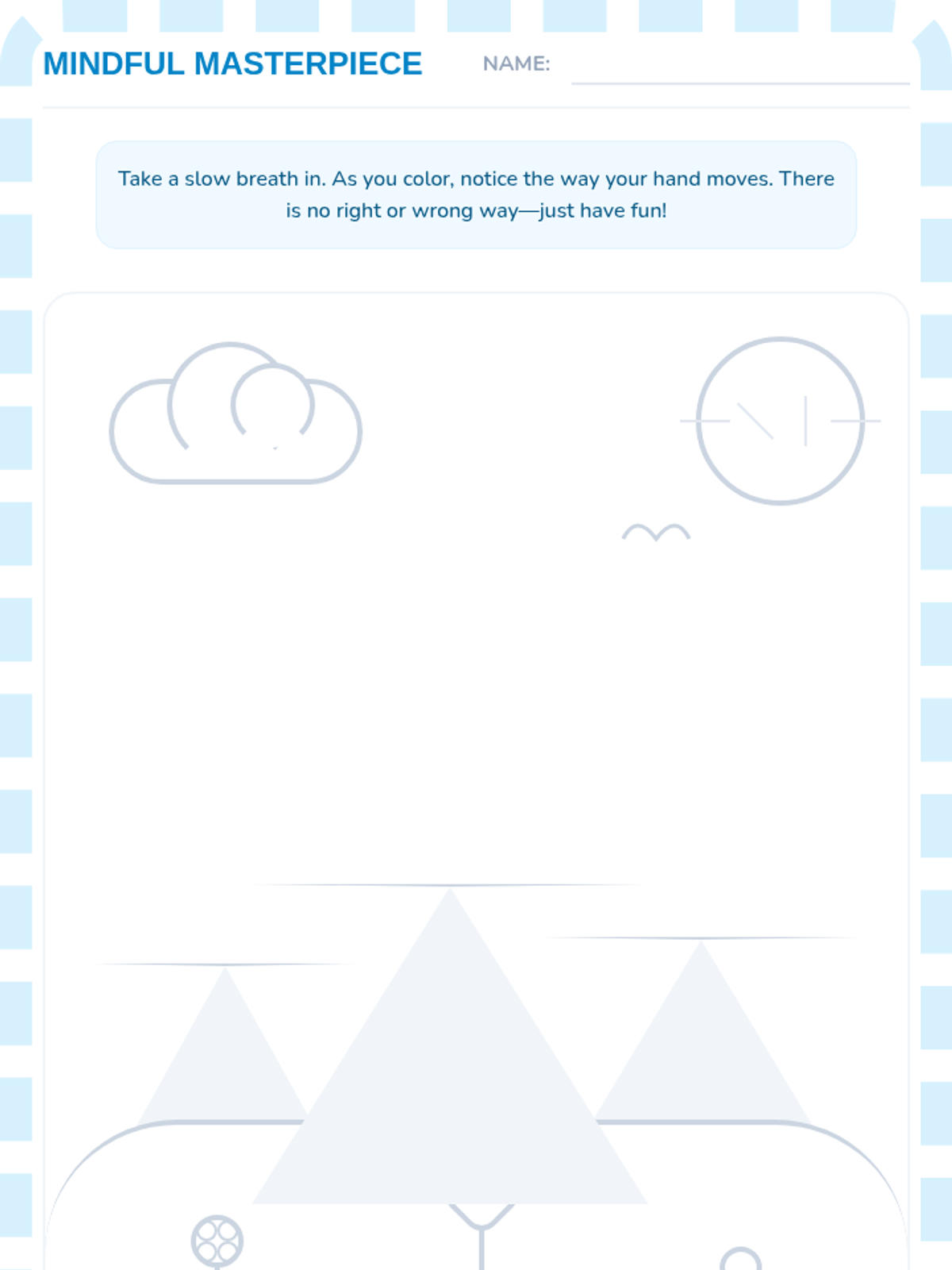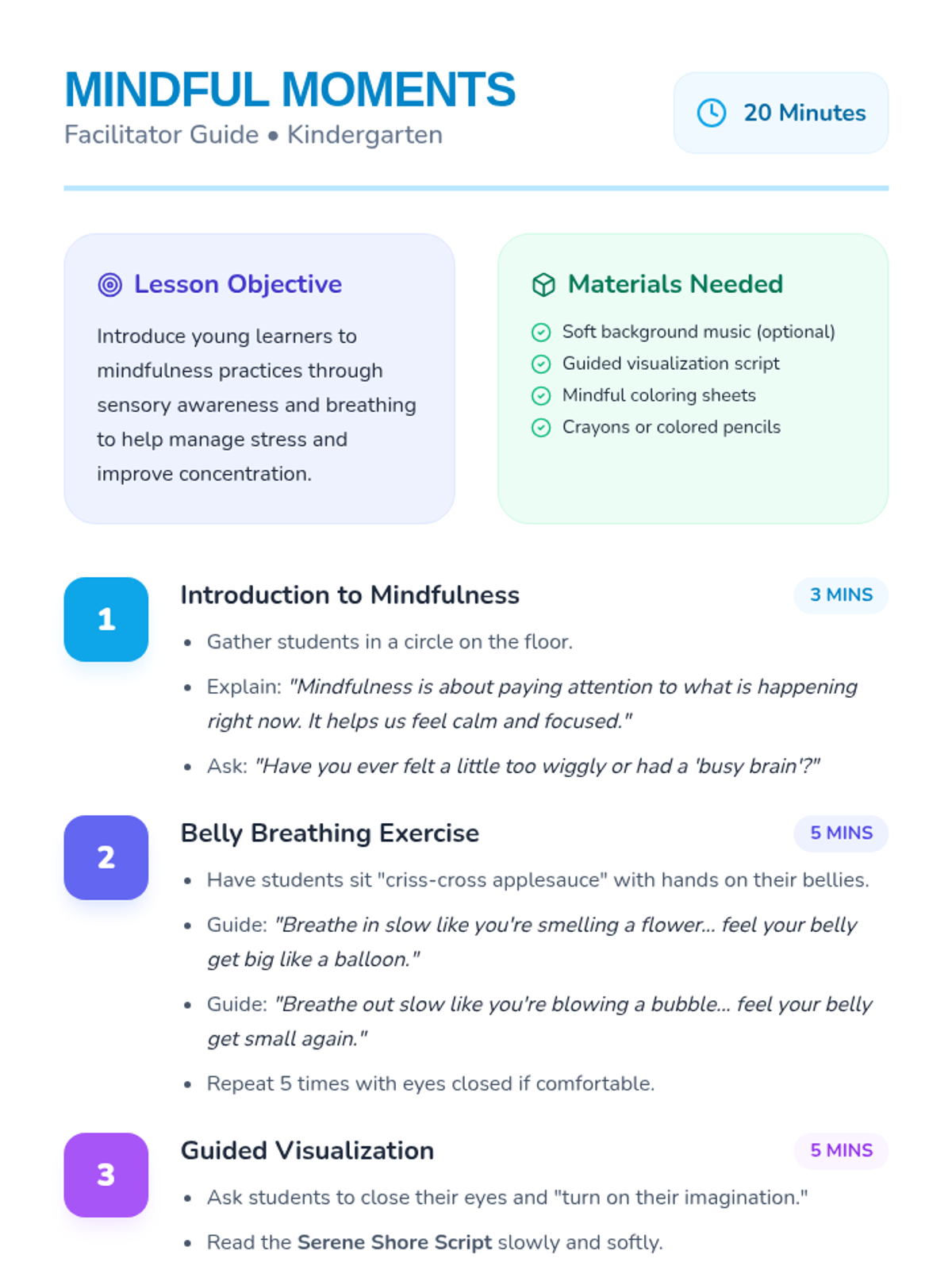 A gentle introduction to mindfulness for kindergarteners, featuring breathing exercises, a guided visualization, and mindful coloring to promote emotional regulation and focus.