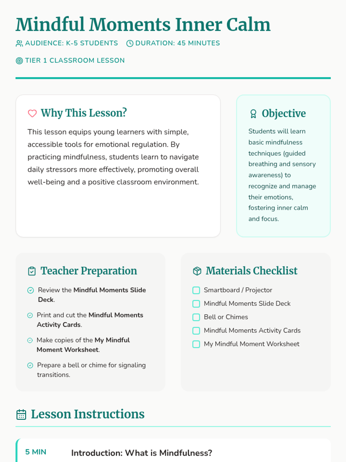 A 45-minute lesson for K-5 students introducing mindfulness through belly breathing and sensory awareness techniques to foster emotional regulation.