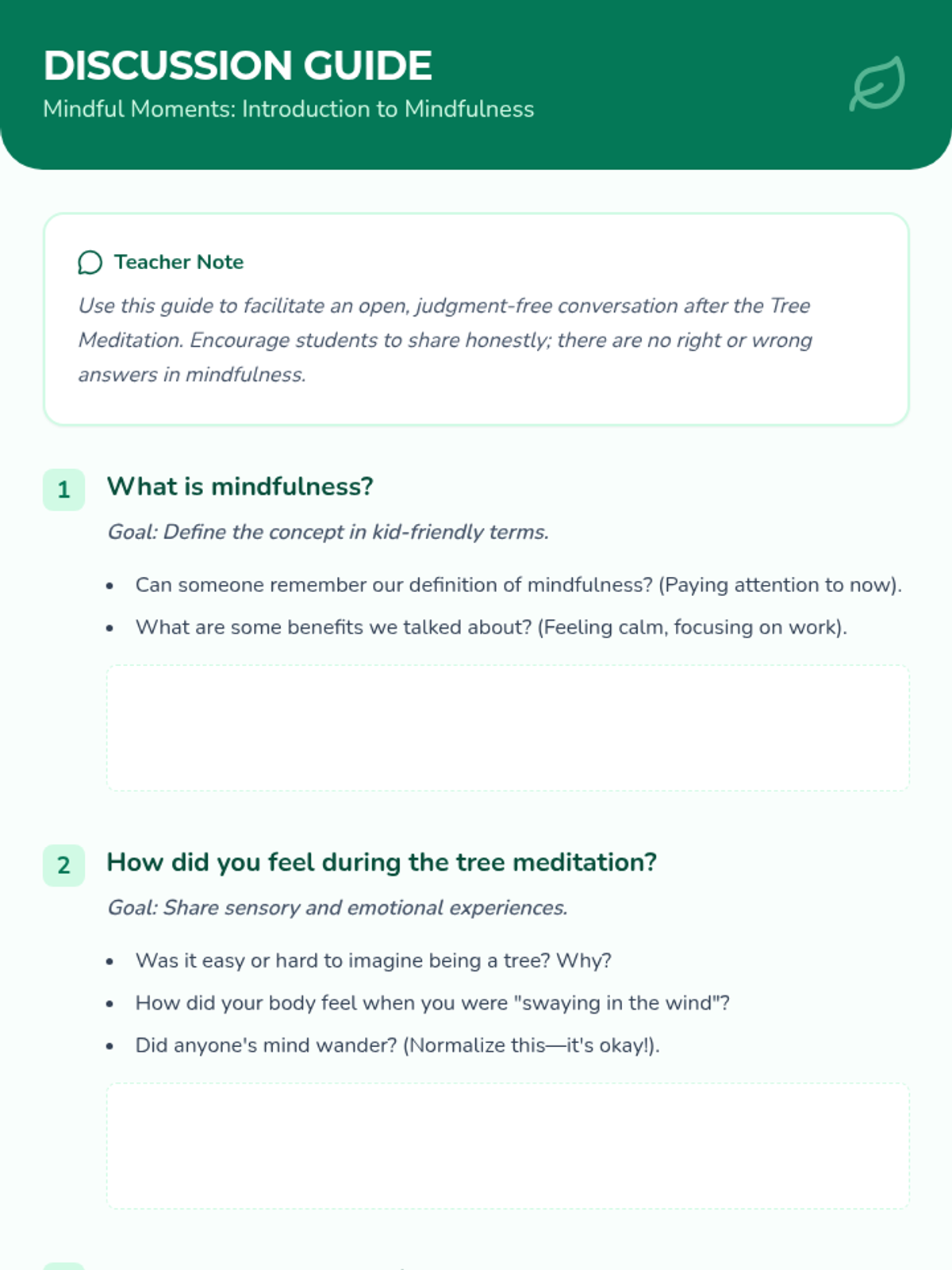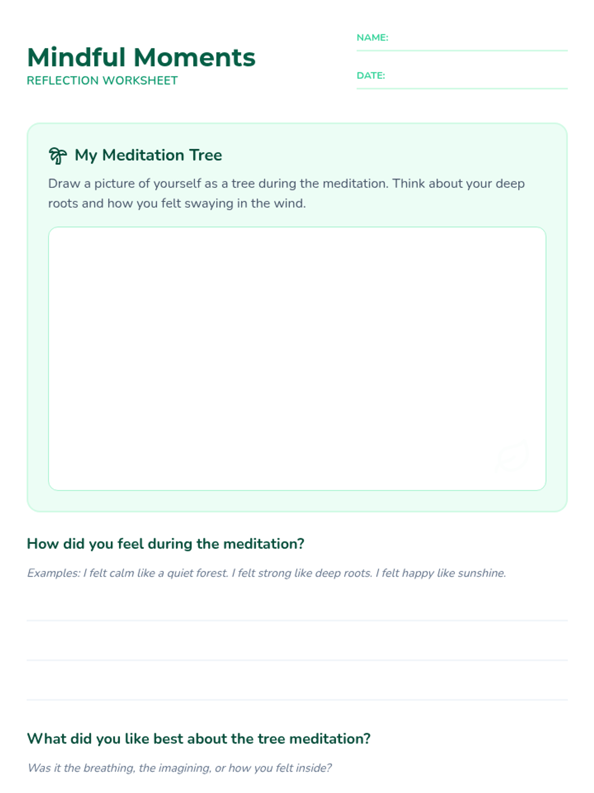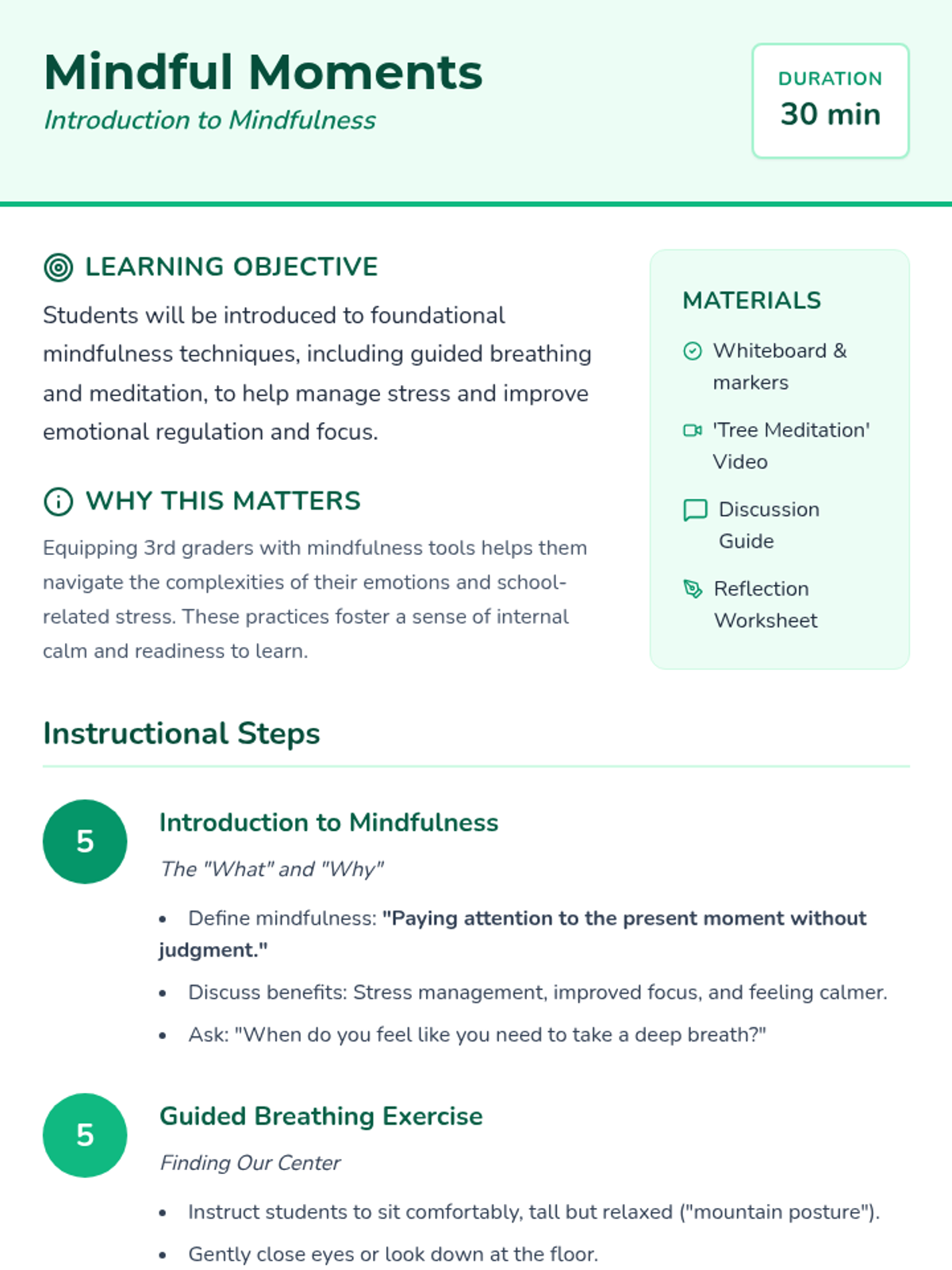 This lesson guides 3rd grade students through basic mindfulness techniques to help manage stress and improve focus. Students will participate in guided breathing exercises and a simple meditation using the 'Mindful Minutes: Tree Meditation for Children' video.