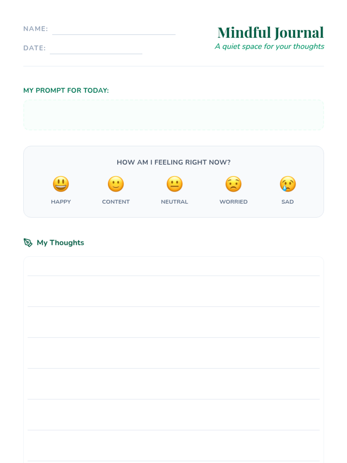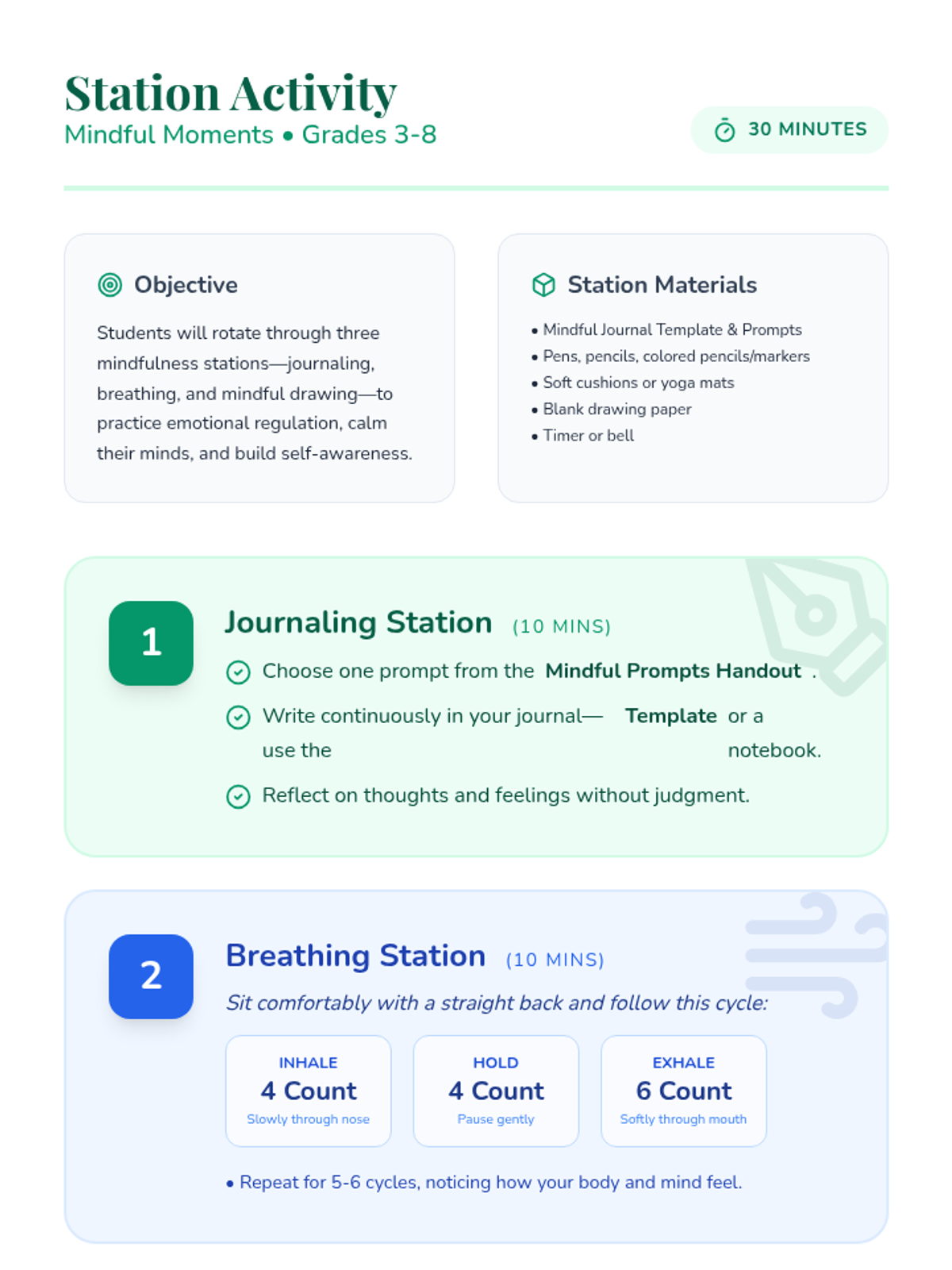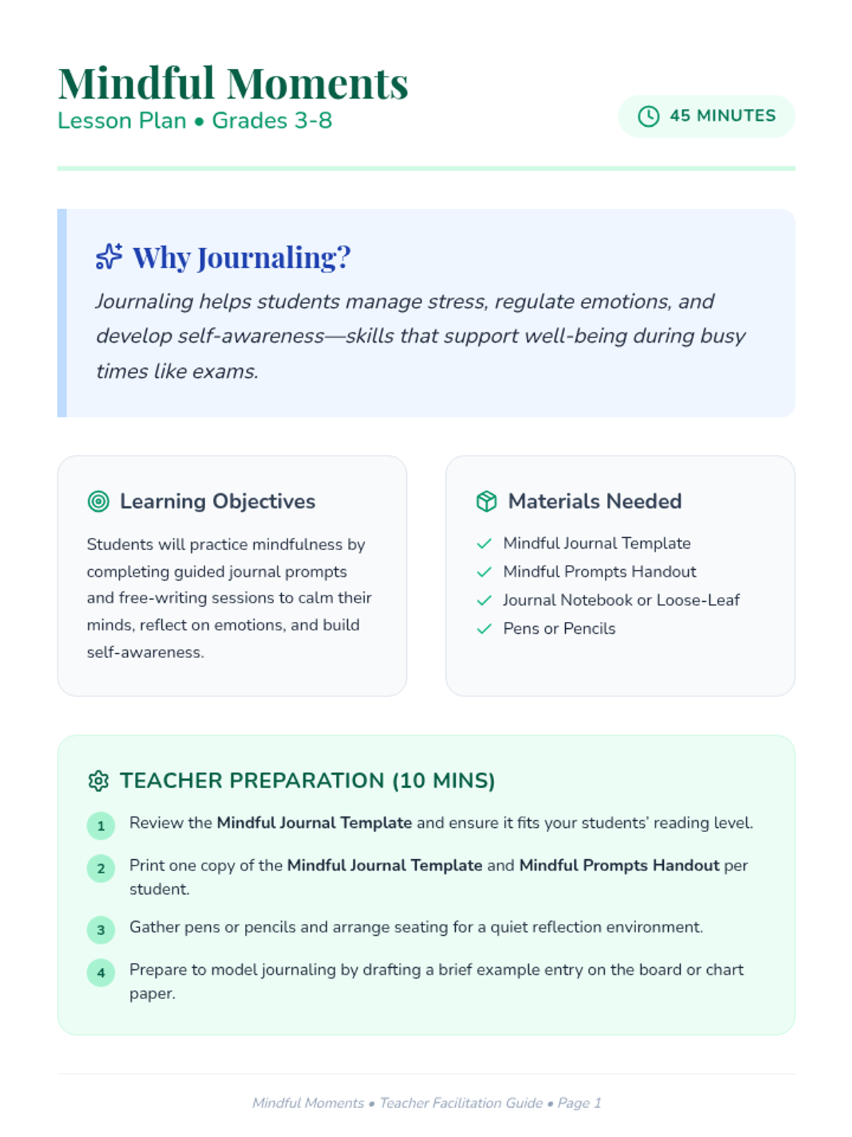 A mindfulness lesson for grades 3-8 that uses journaling to promote emotional regulation, self-awareness, and stress management through guided prompts and reflective writing.