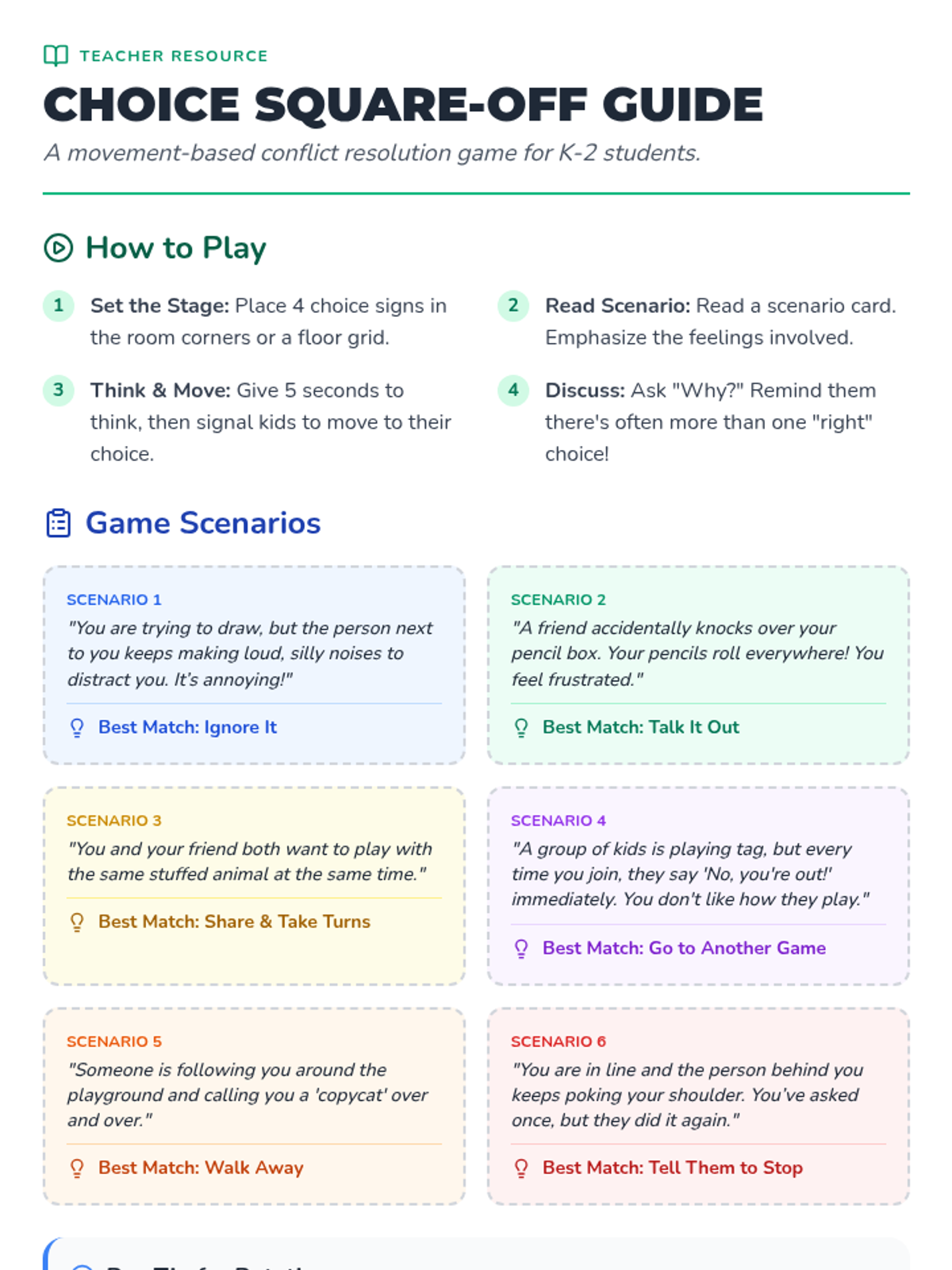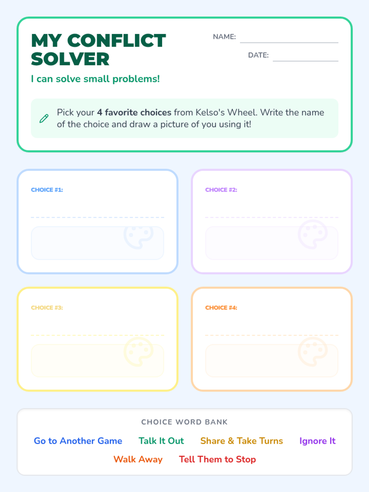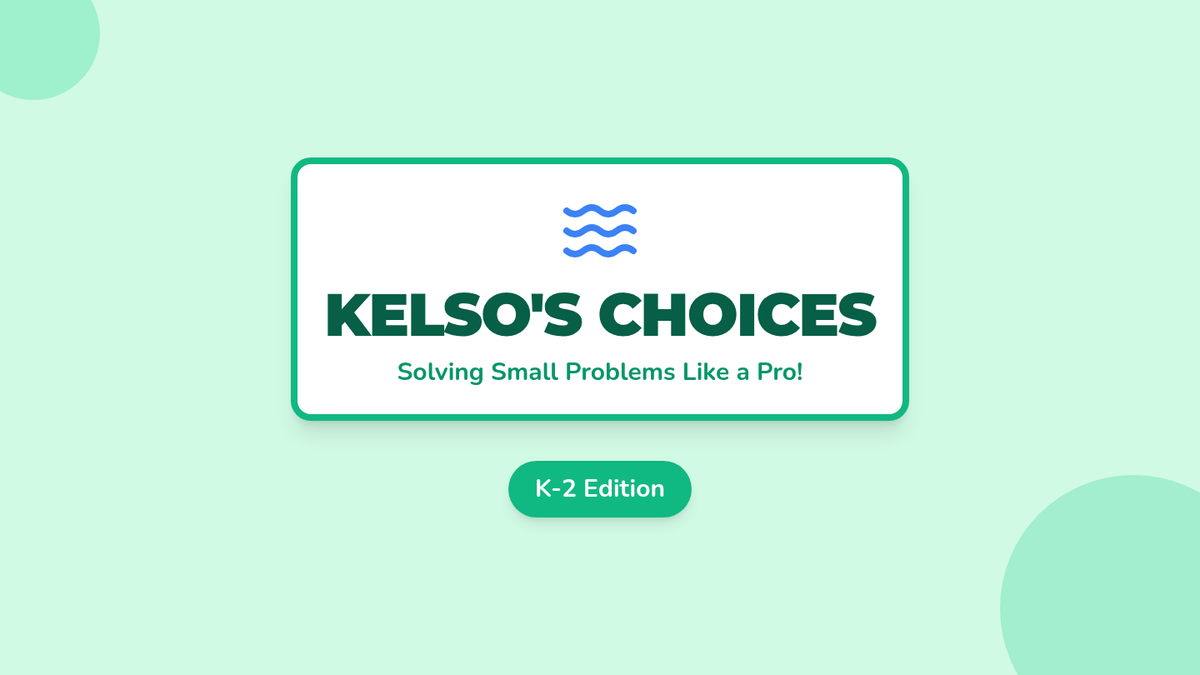 A lesson introducing K-2 students to the first six choices on Kelso's Wheel, focusing on identifying small problems and practicing conflict resolution through a movement-based 4-square game.