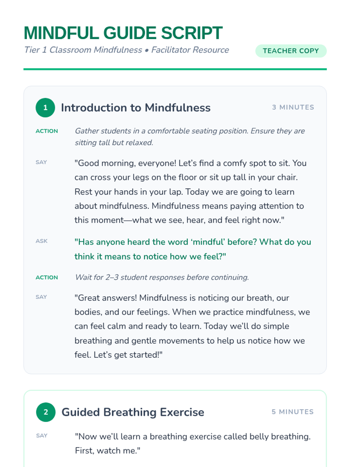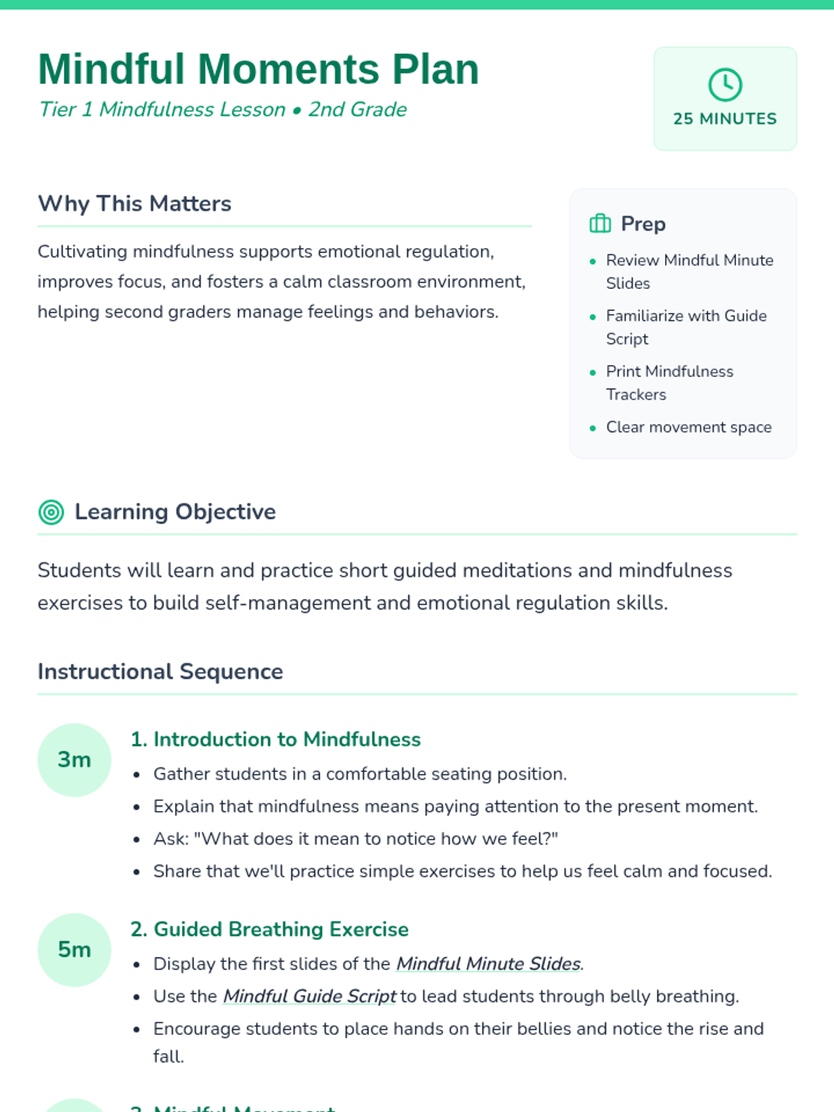 A 25-minute mindfulness lesson for 2nd graders focused on belly breathing and gentle movement to support emotional regulation.