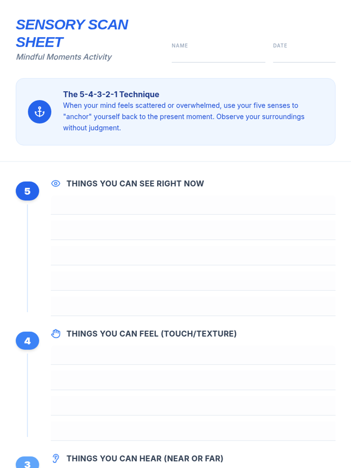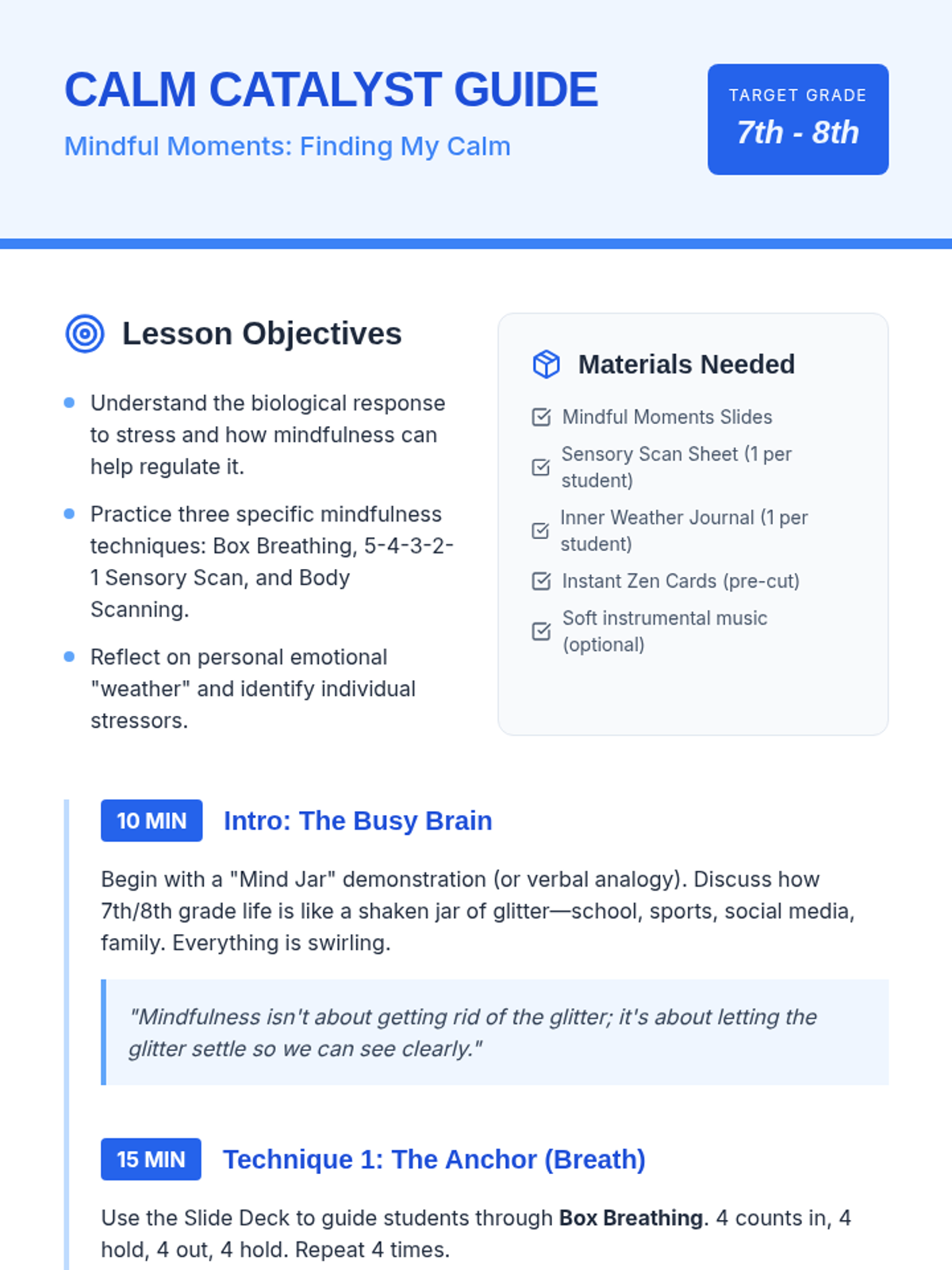 A lesson for 7th and 8th graders exploring mindfulness techniques, breathing exercises, and sensory awareness to manage stress and improve focus. Students will learn practical, accessible tools to observe their thoughts and feelings without judgment.