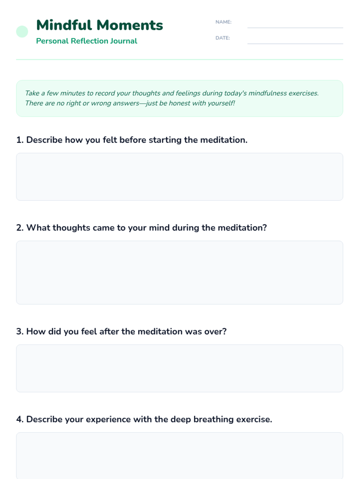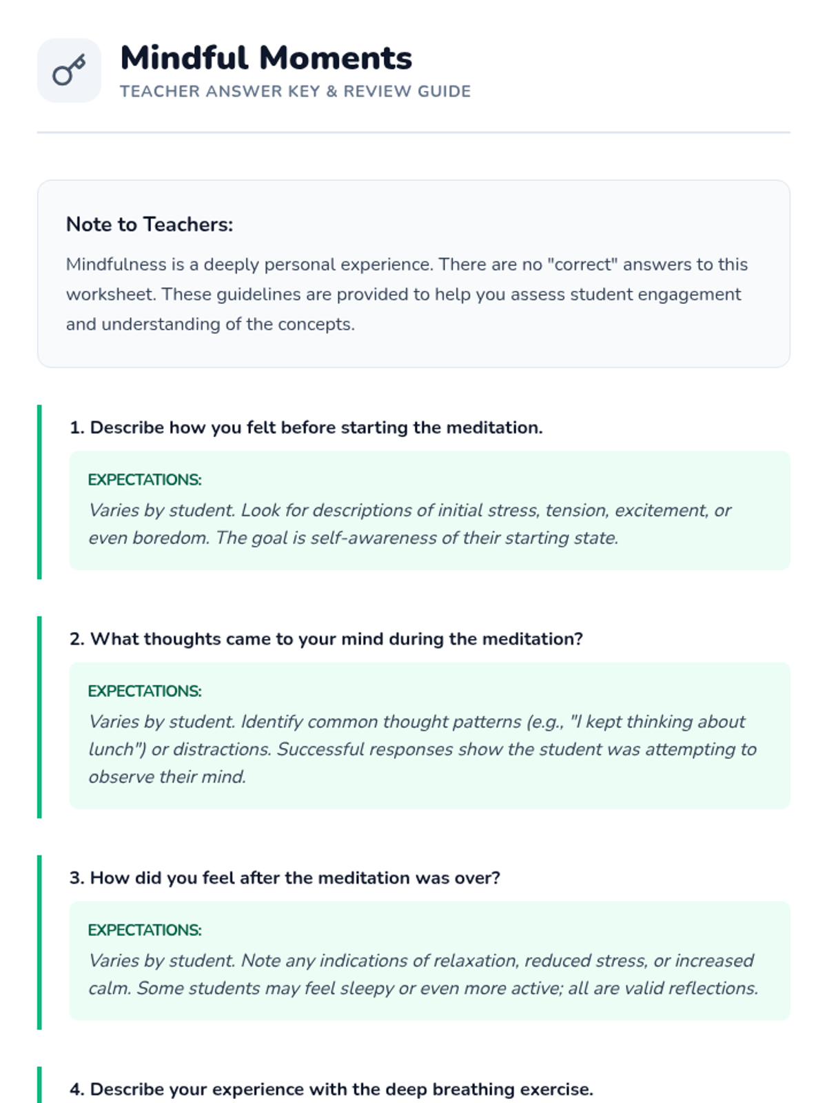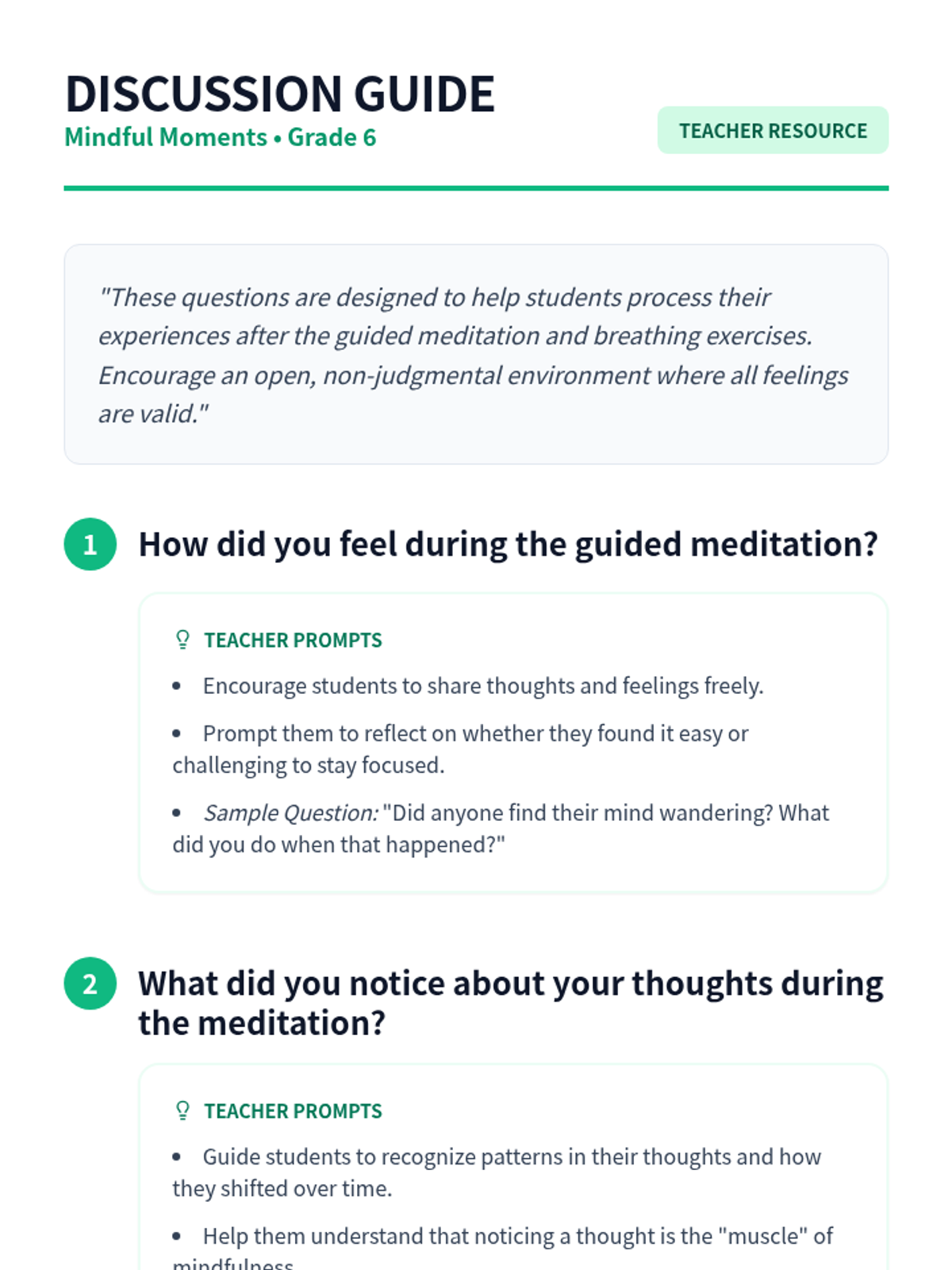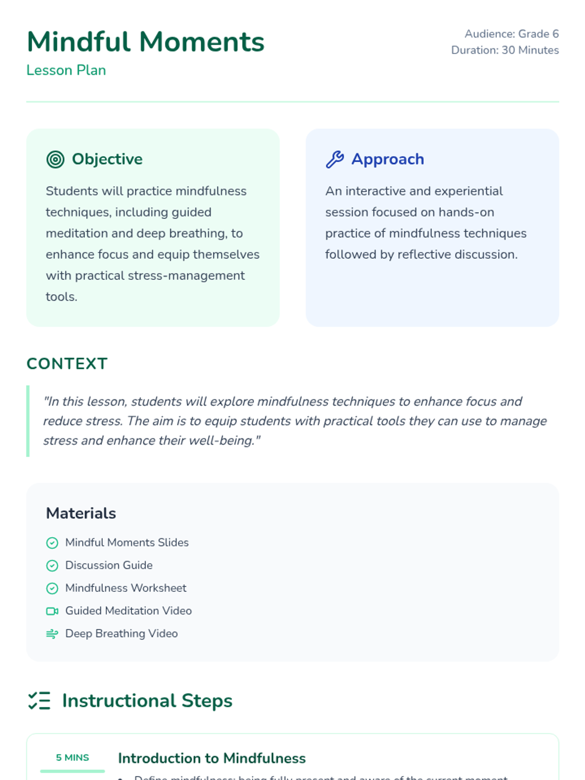A lesson for Grade 6 students exploring mindfulness techniques, deep breathing, and meditation to manage stress and improve focus. Students will engage in guided practices and reflect on their personal experiences.