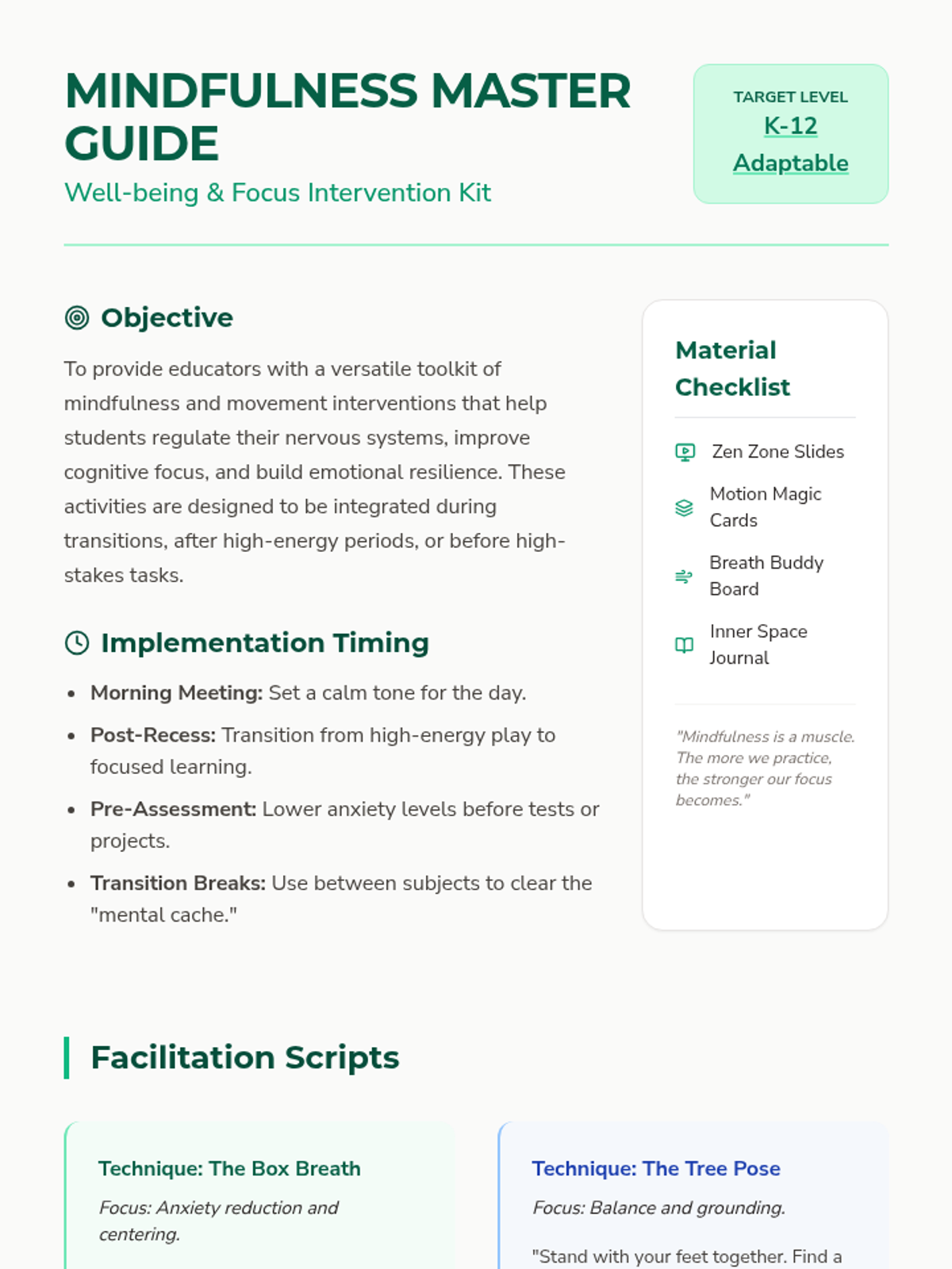 A comprehensive collection of mindfulness activities and movement breaks designed to help students regulate emotions and improve focus throughout the school day.