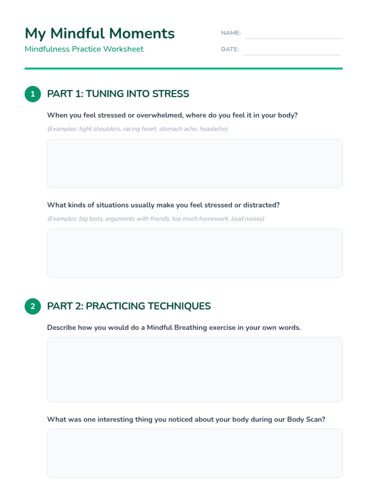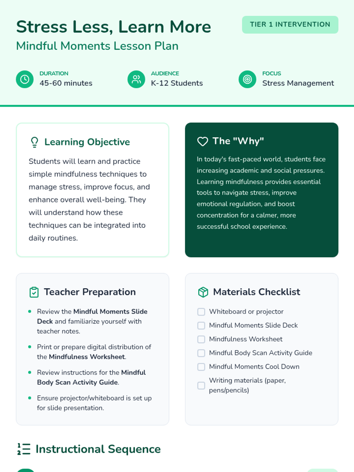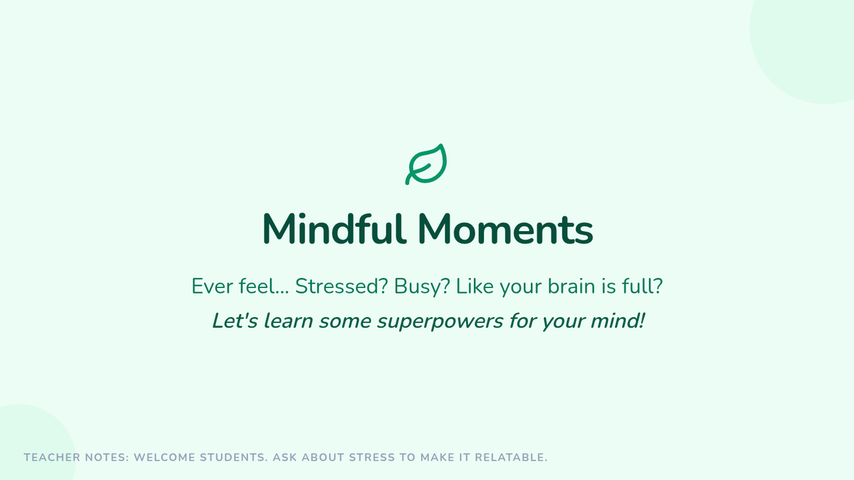 A lesson introducing K-12 students to practical mindfulness techniques like breathing and body scanning to manage stress and improve focus.