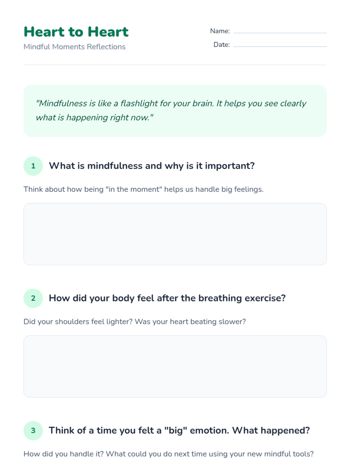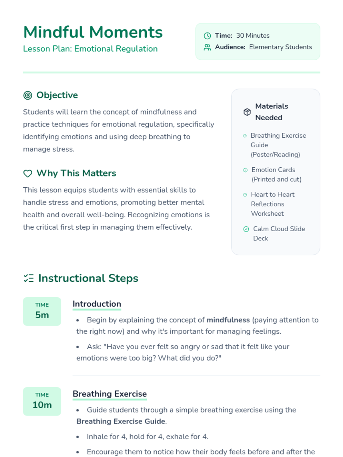 A foundational lesson for elementary students on mindfulness and emotional regulation, featuring breathing techniques and emotion identification activities.