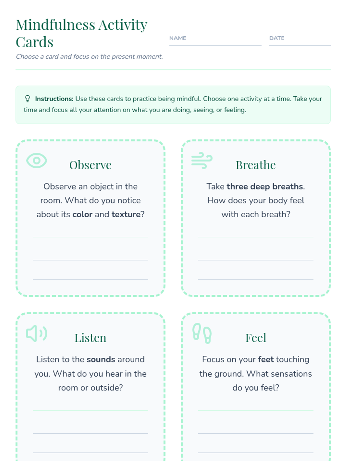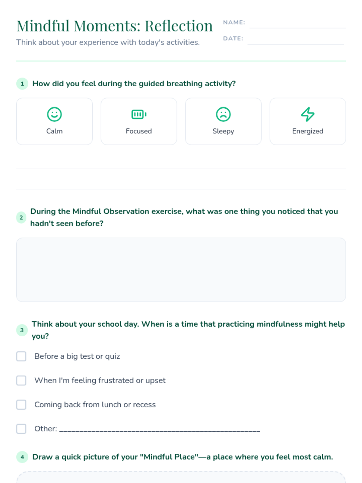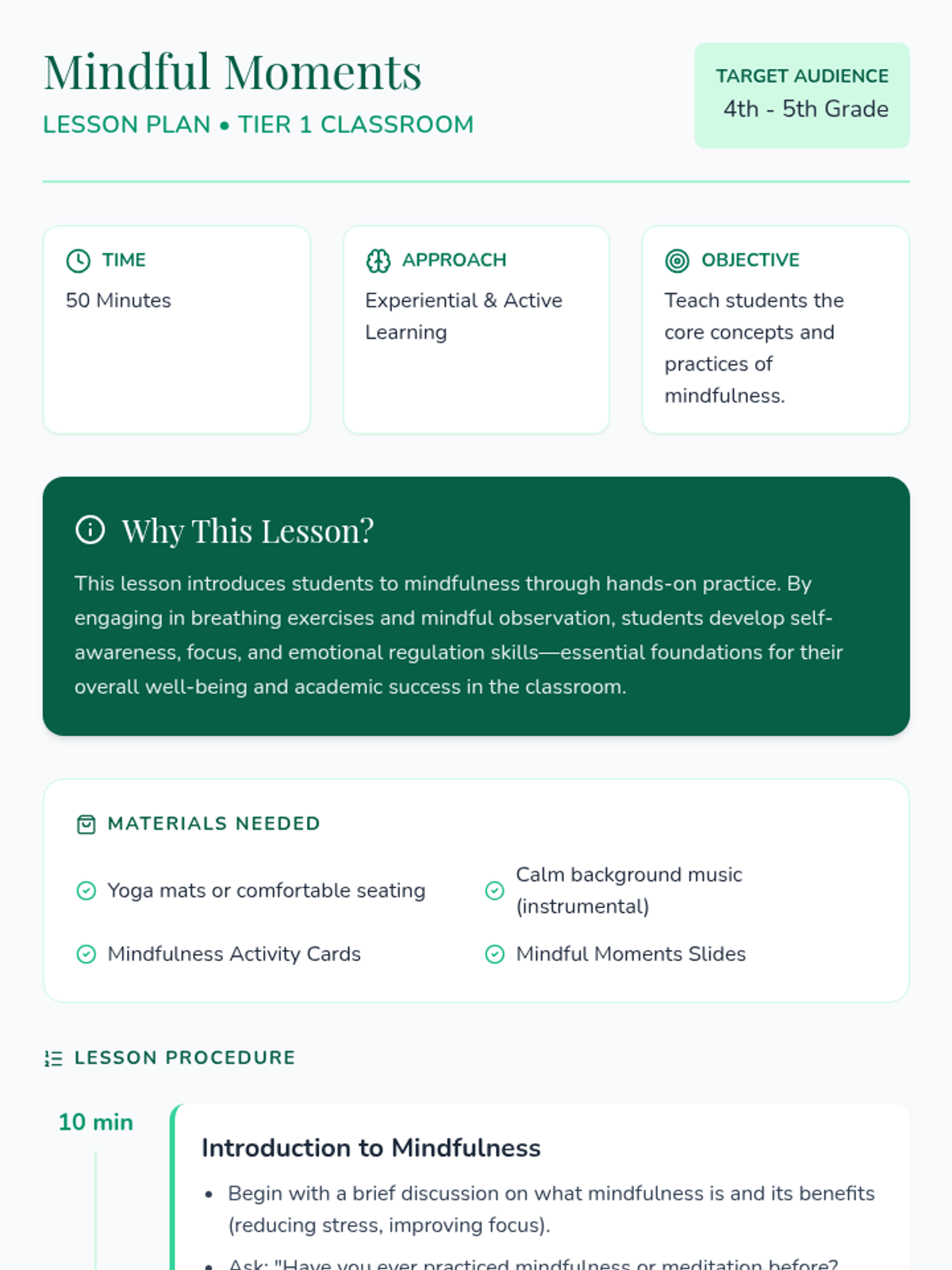 An introductory lesson on mindfulness for 4th and 5th graders, focusing on breathing techniques, body awareness, and mindful observation to improve emotional regulation and focus.