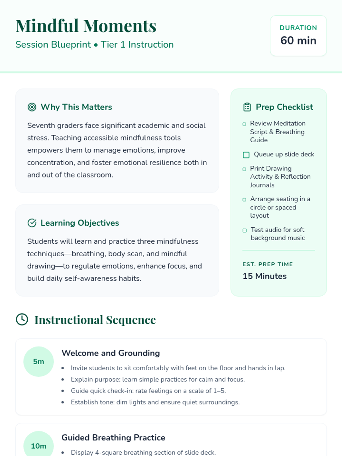 A 60-minute session introducing mindfulness techniques to help 7th graders regulate emotions, improve focus, and cultivate self-awareness in everyday life.
