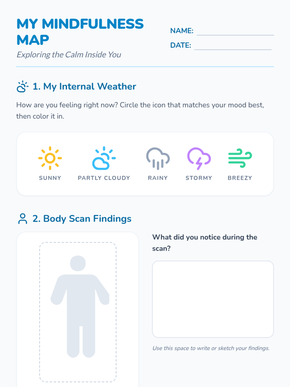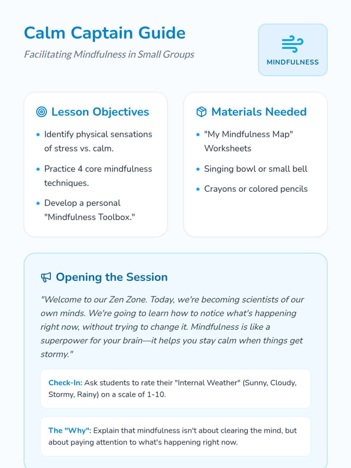 A foundational mindfulness lesson for small groups, teaching students four core techniques: breathing, body scanning, mindful listening, and reflective journaling to manage stress and build emotional awareness.
