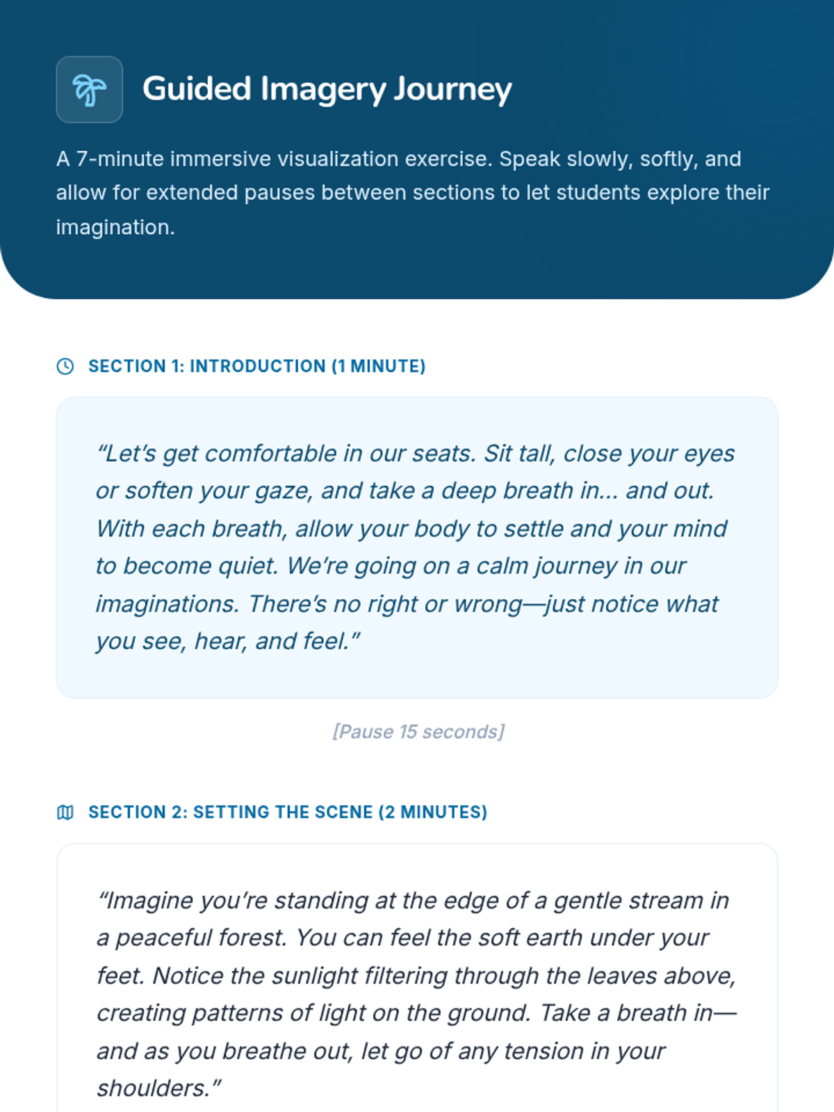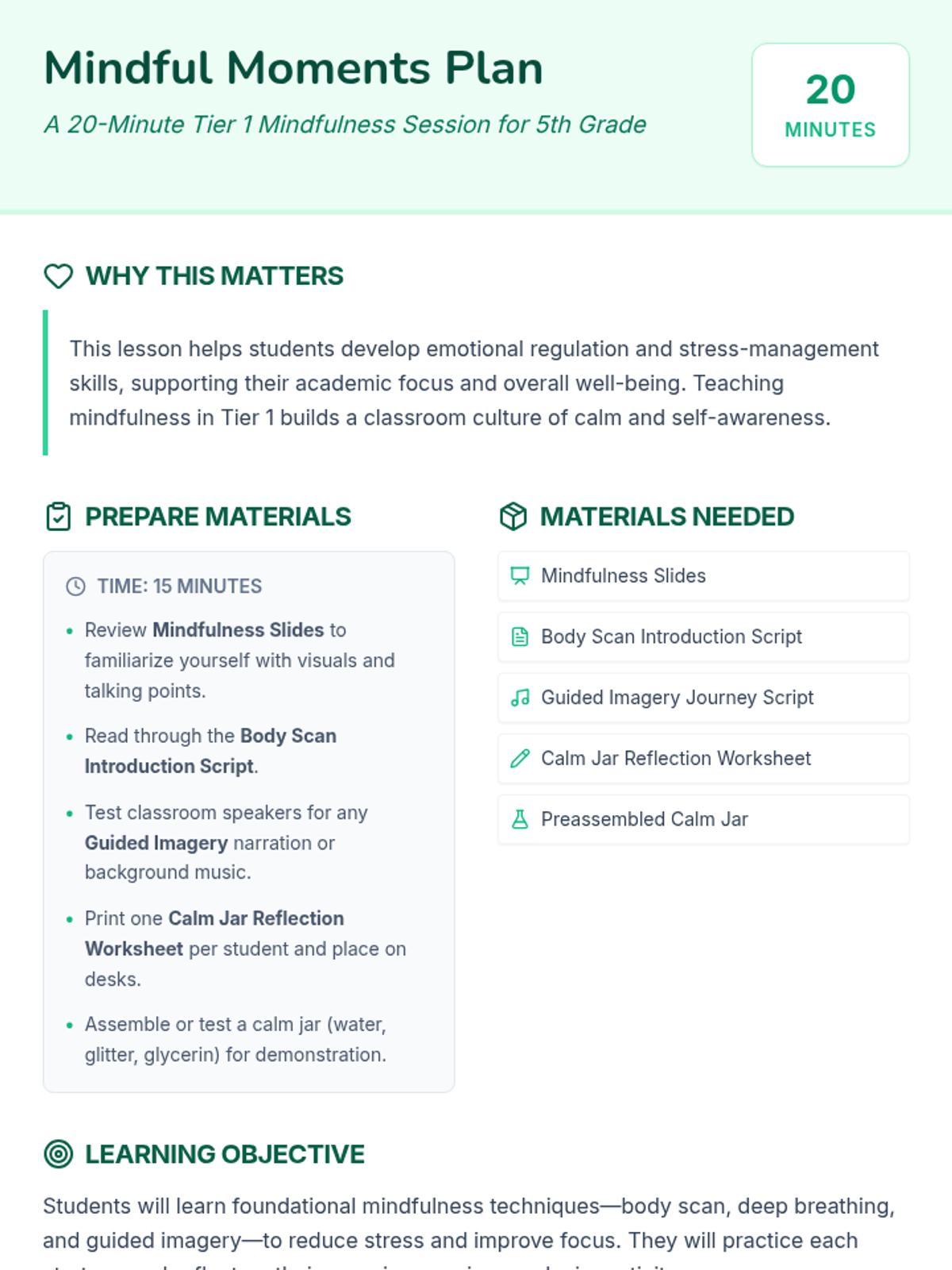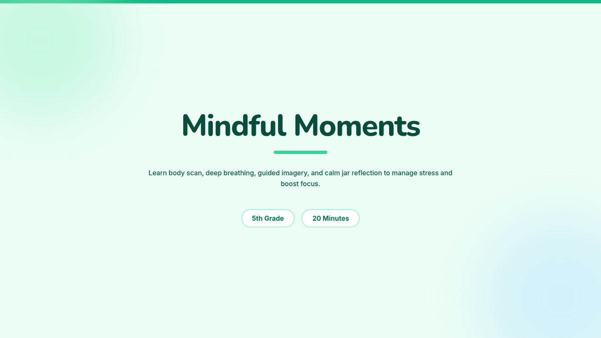A 20-minute Tier 1 classroom session for 5th graders to learn foundational mindfulness strategies—breathing techniques and guided imagery—to manage stress and boost focus.