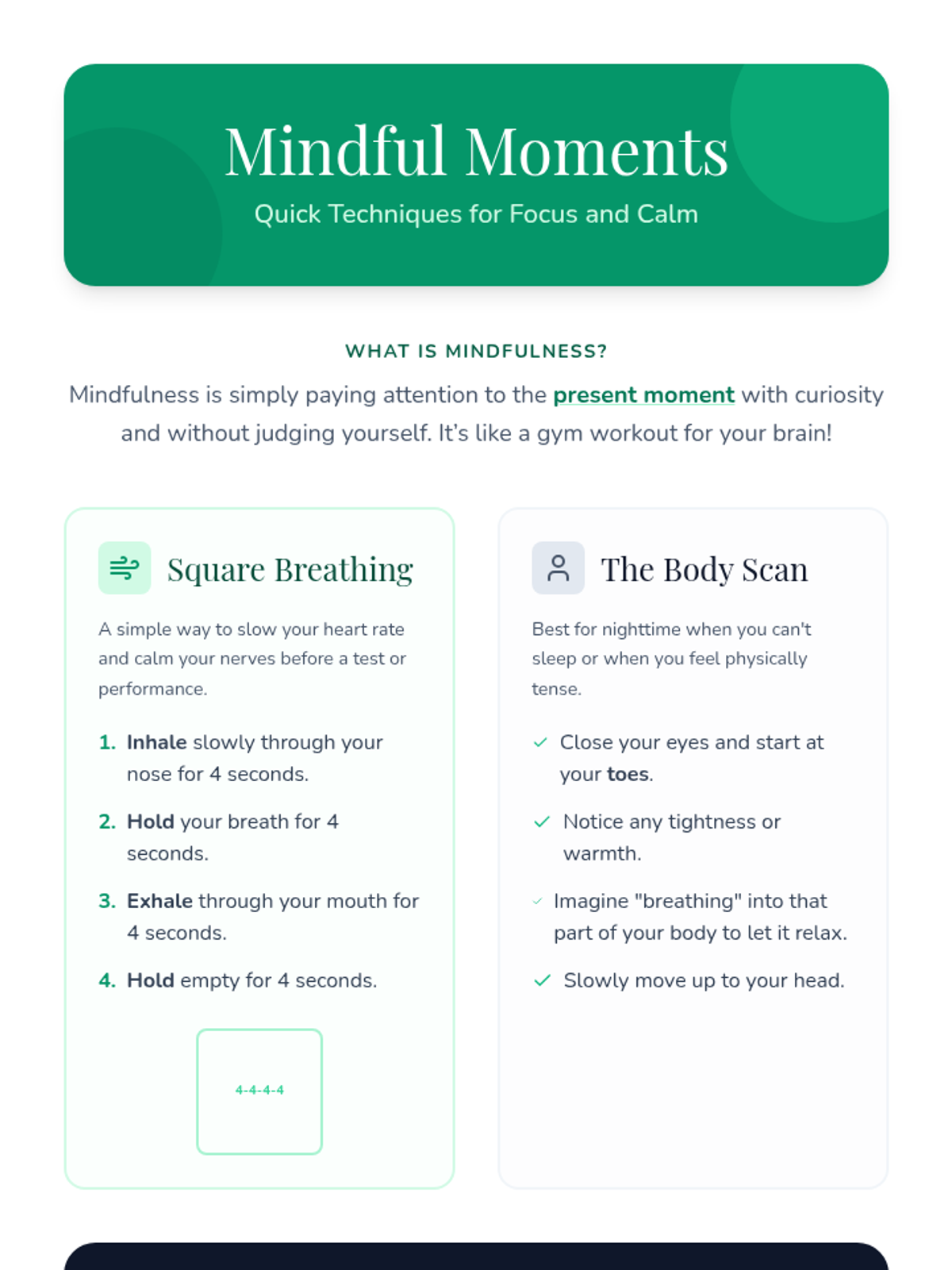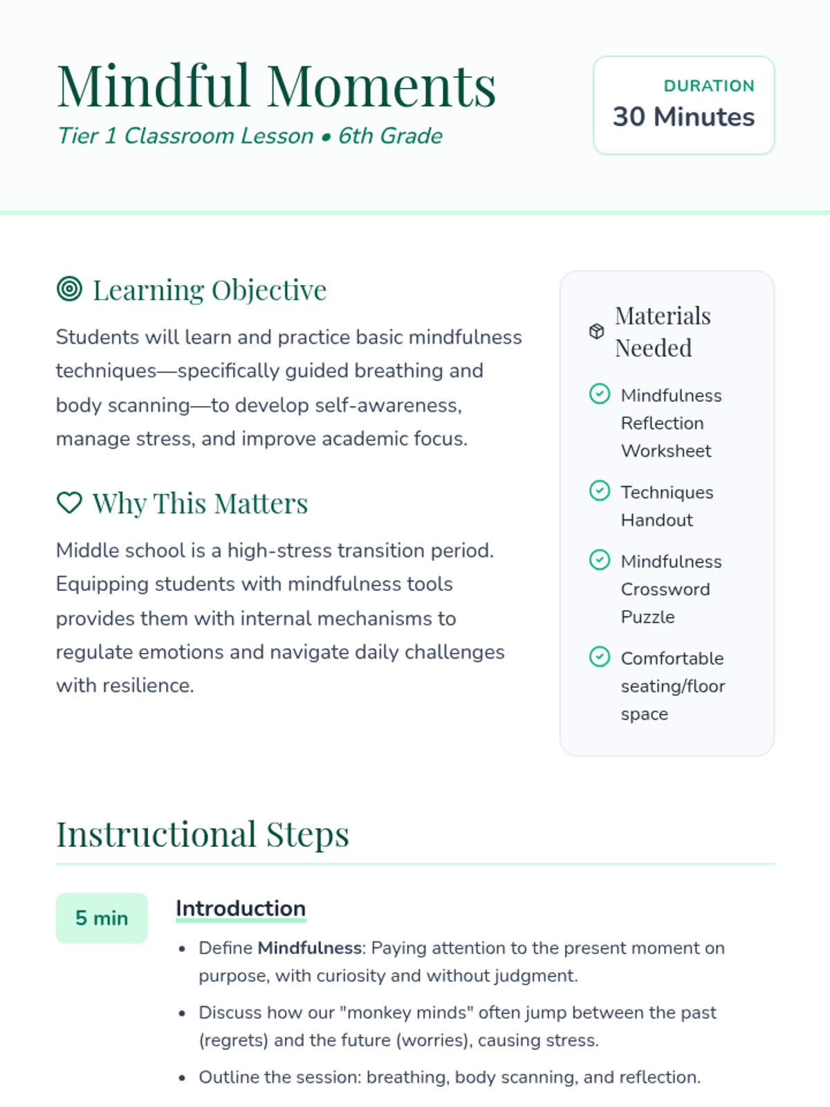A foundational introduction to mindfulness for 6th-grade students, featuring guided breathing, body scan exercises, and reflective activities to help manage stress and improve focus.