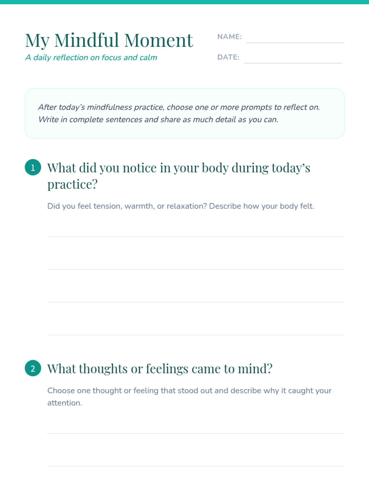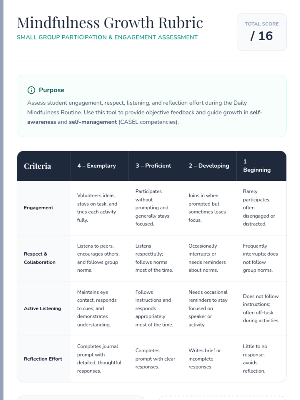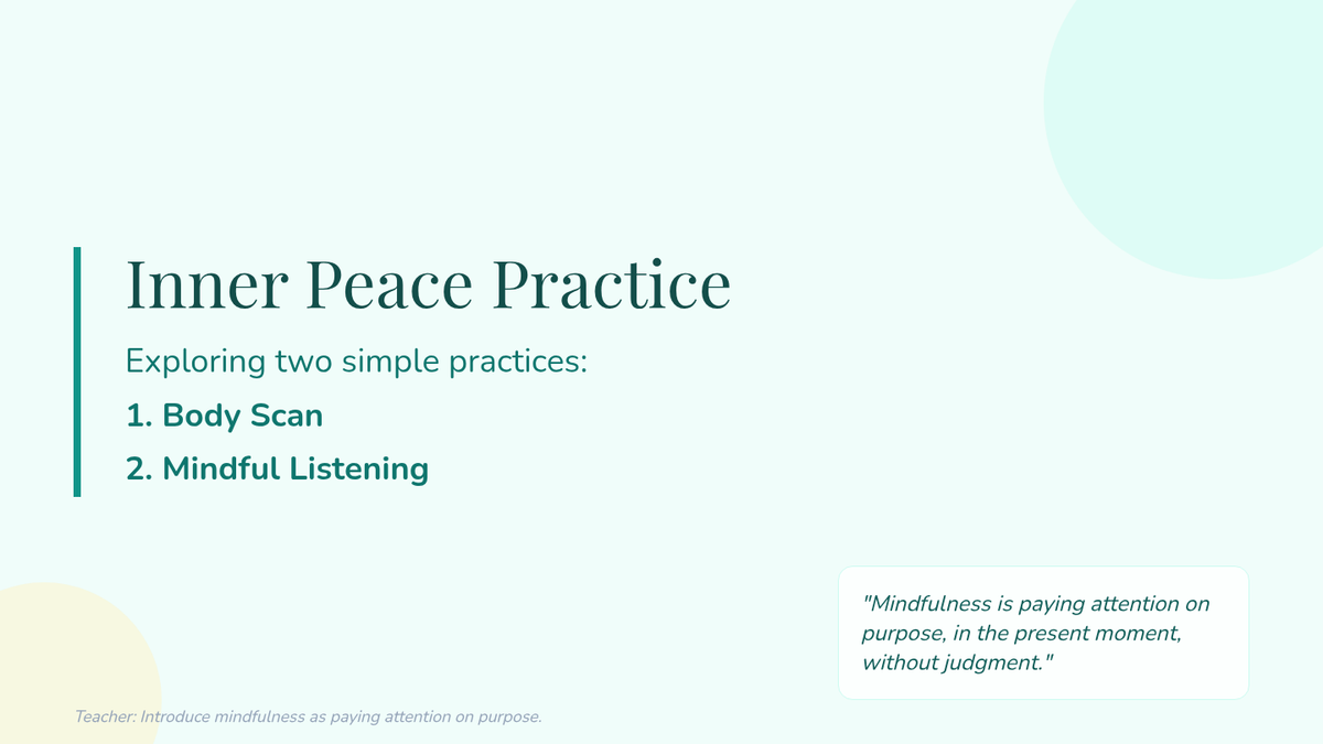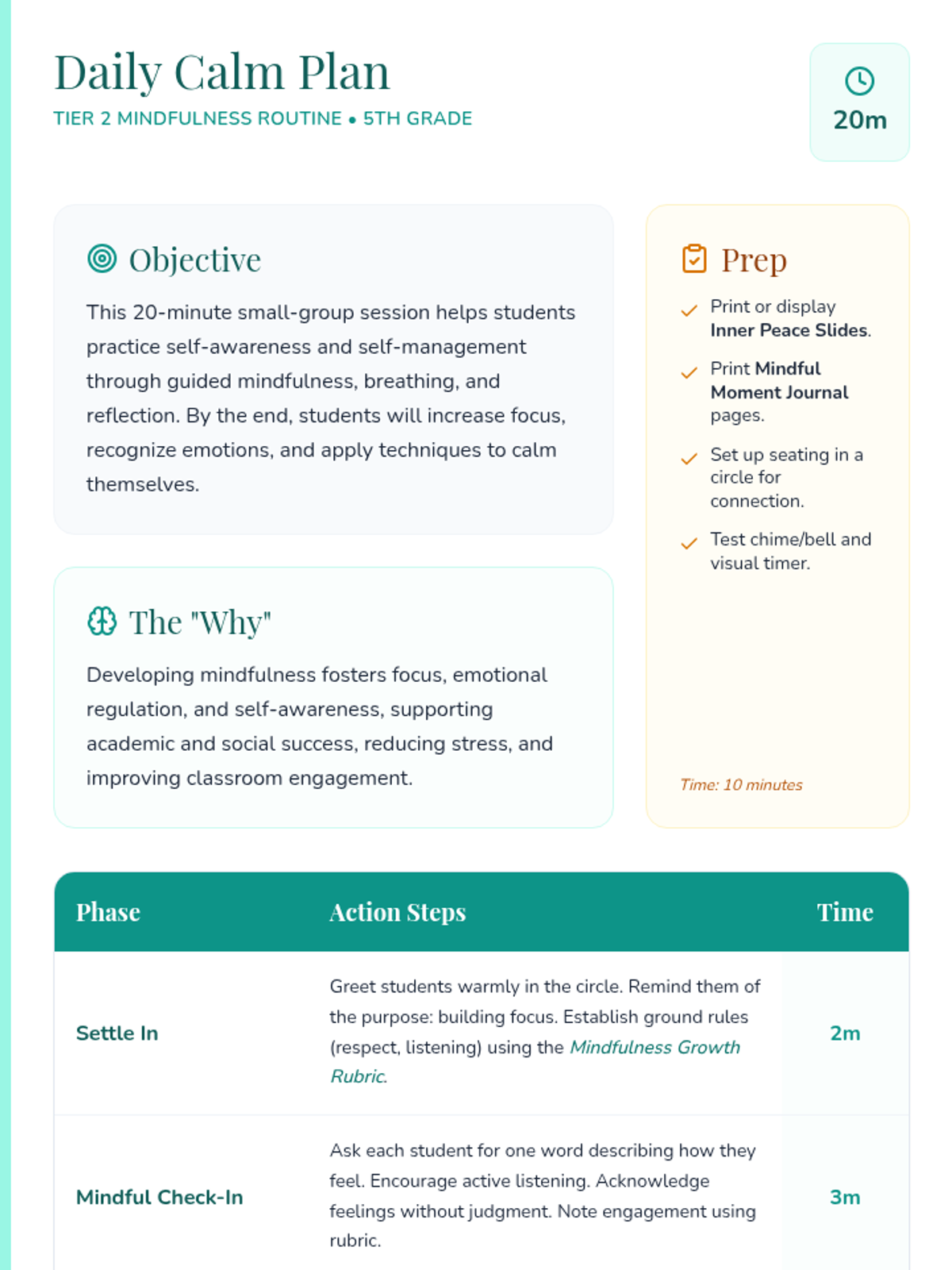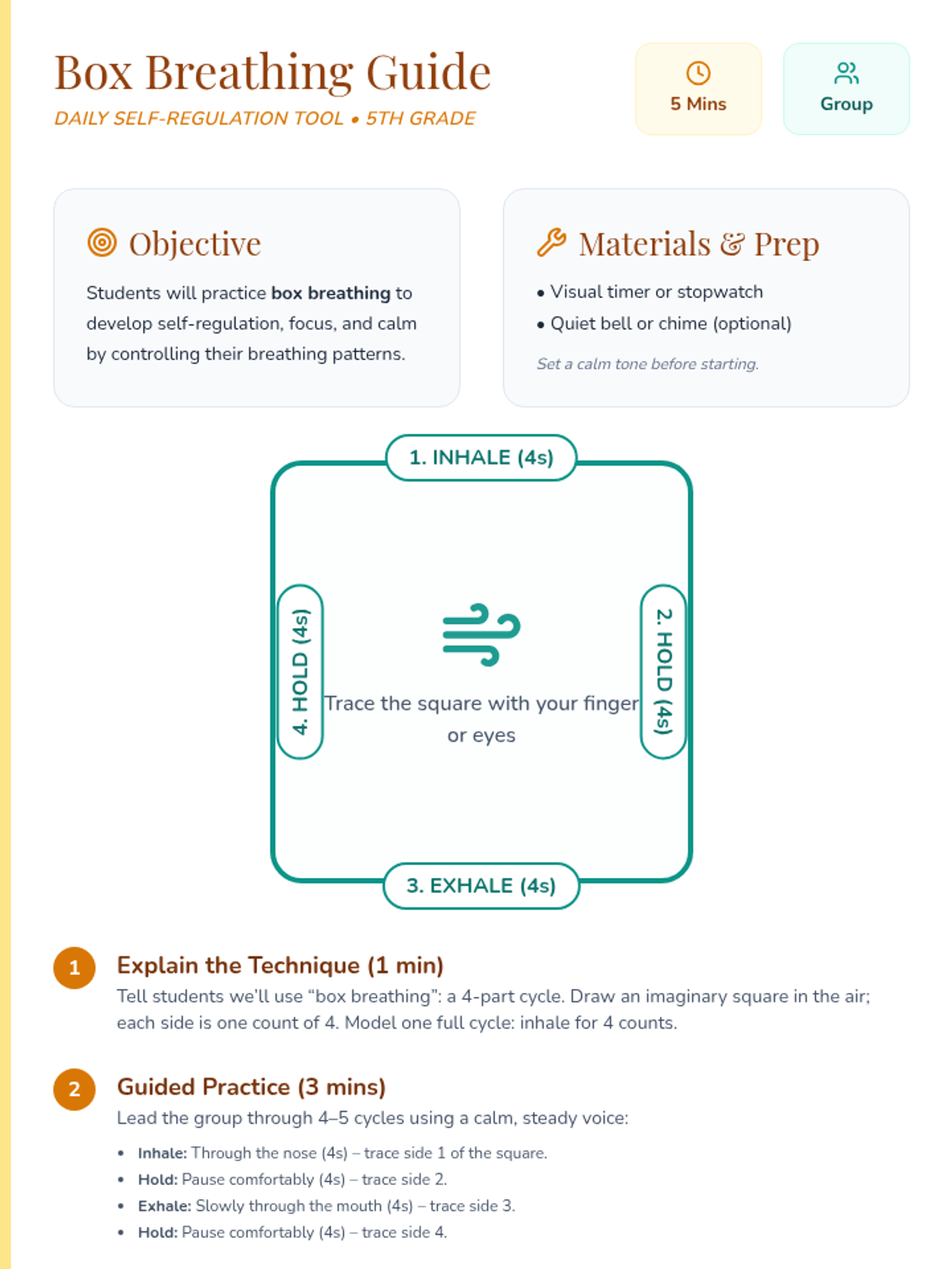 A small-group resource for 5th graders focused on building self-awareness and self-management through daily 20-minute mindfulness practices. This lesson provides a structured routine including breathing exercises, technique practice, and reflection journaling aligned with CASEL competencies.