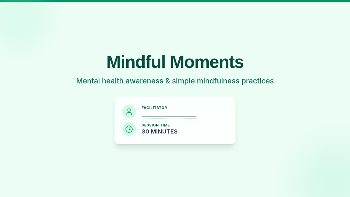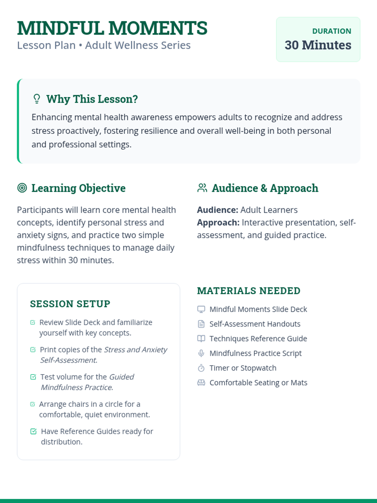 A 30-minute foundational session for adult learners to understand mental health basics, assess personal stress levels, and practice mindfulness techniques for daily well-being.