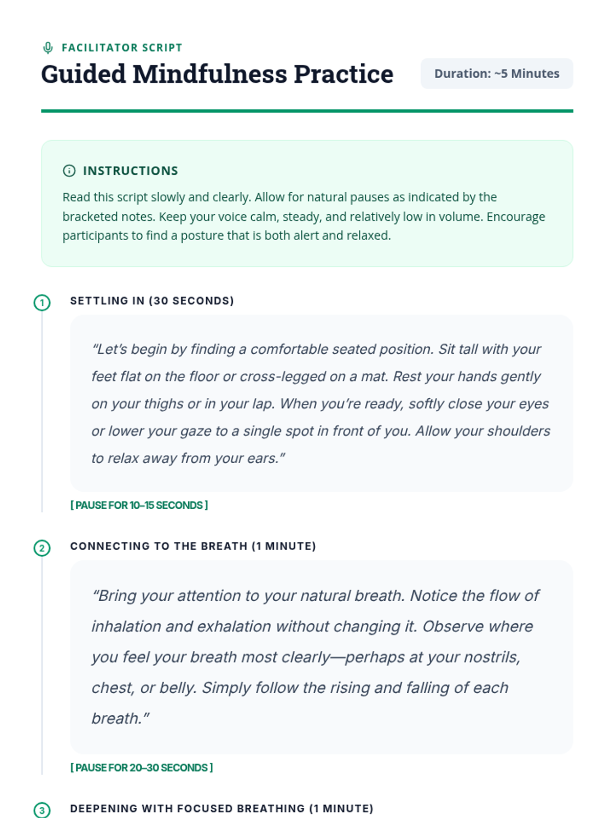 A collection of mindfulness practices designed to help students develop self-regulation, focus, and emotional awareness through guided breathing, grounding, and sensory exploration.