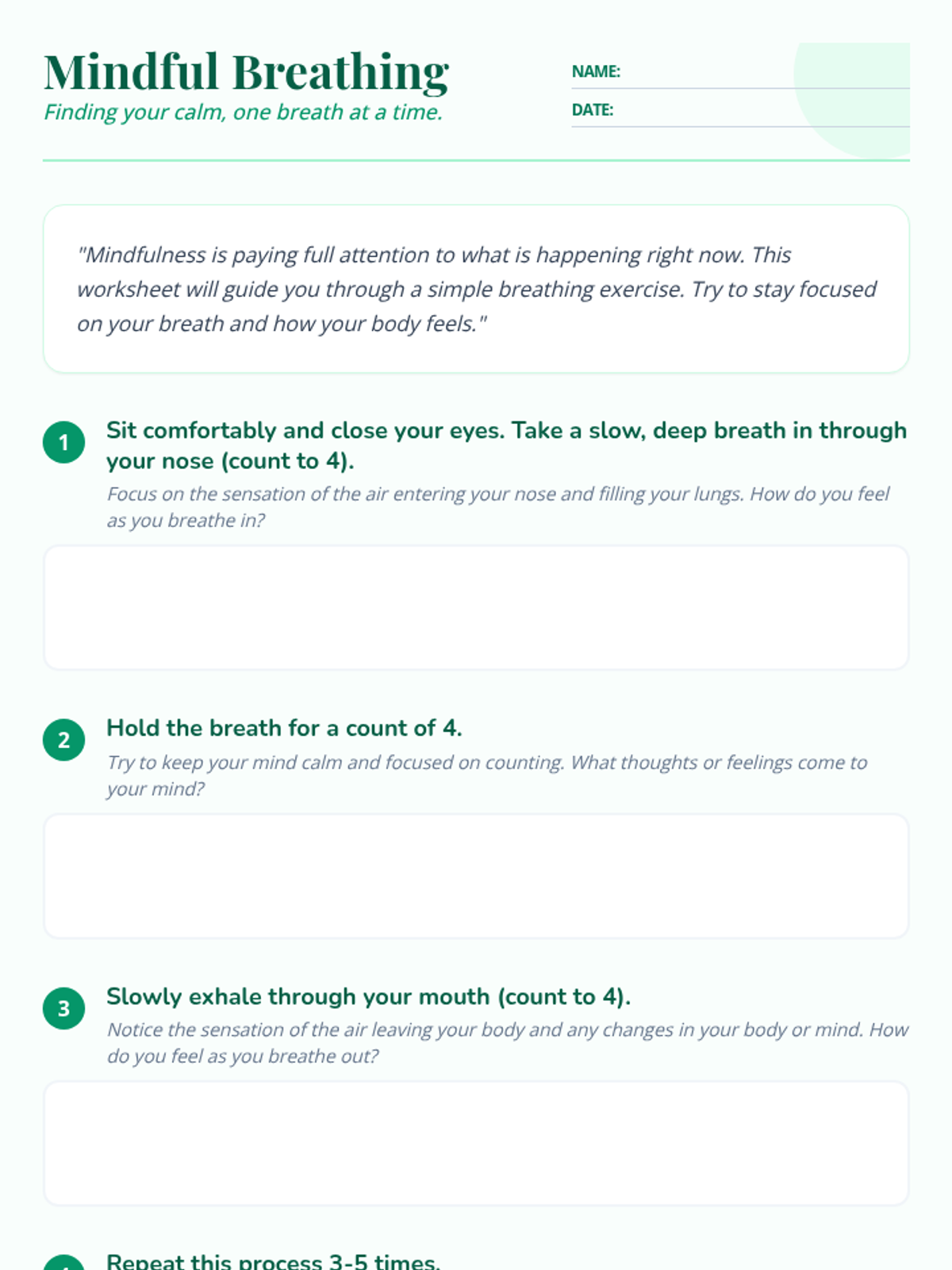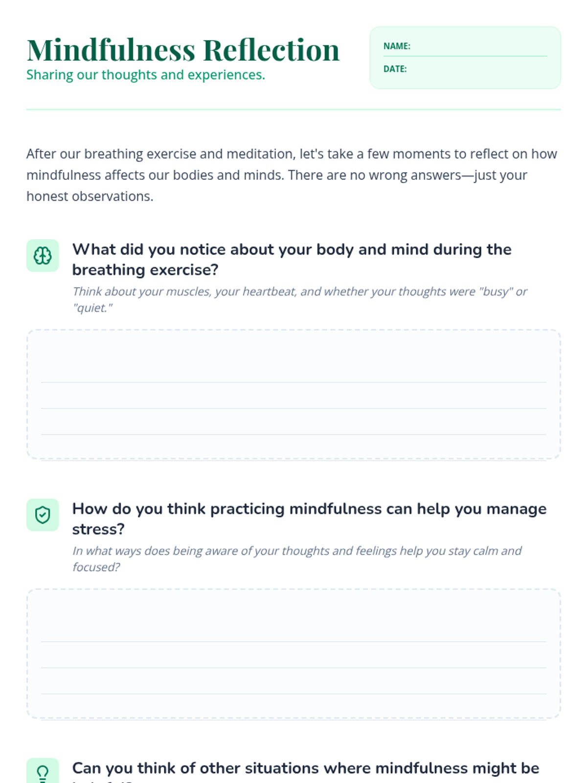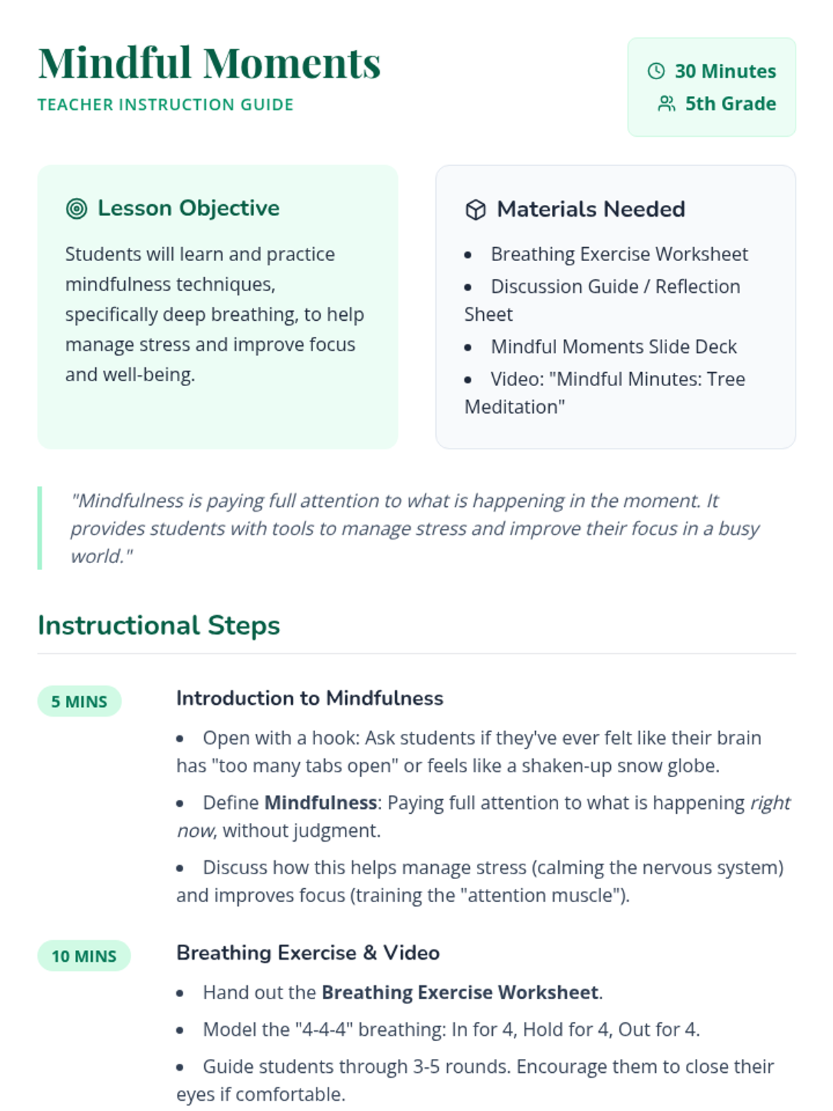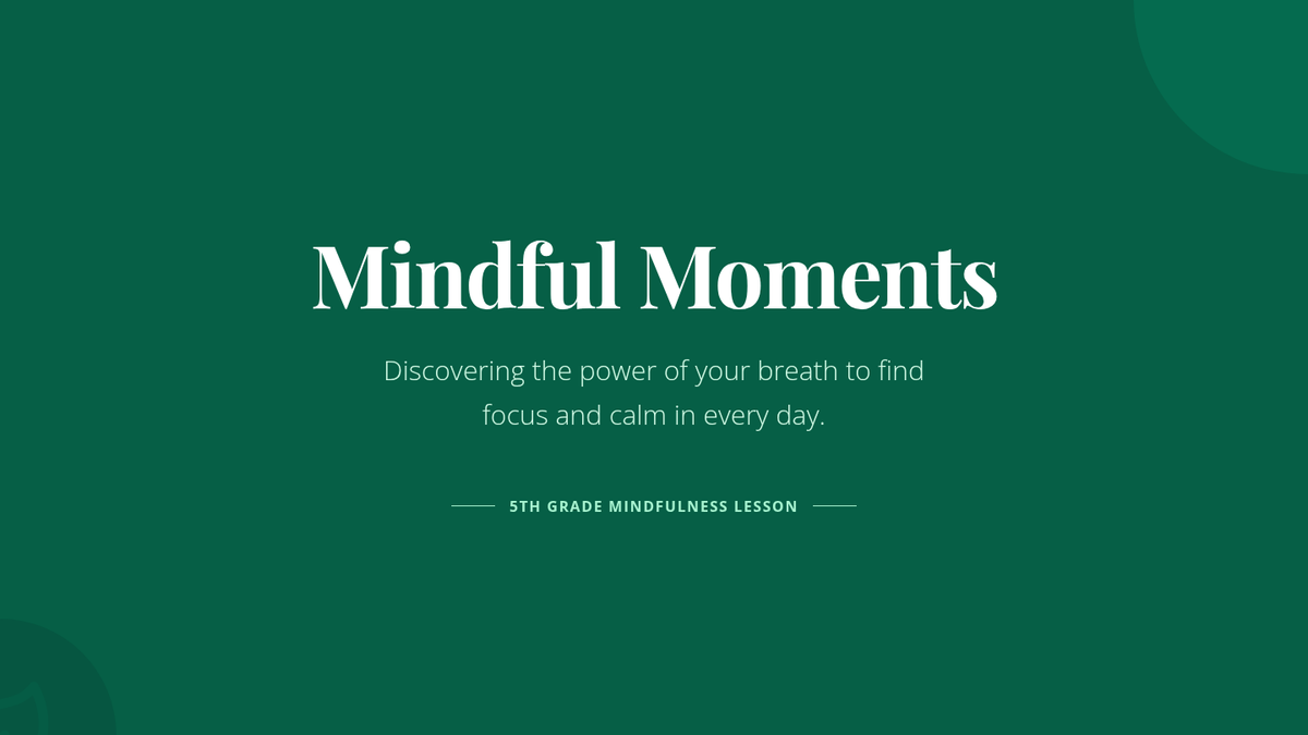 A lesson introducing 5th-grade students to mindfulness through breathing exercises and reflection to help manage stress and improve focus.
