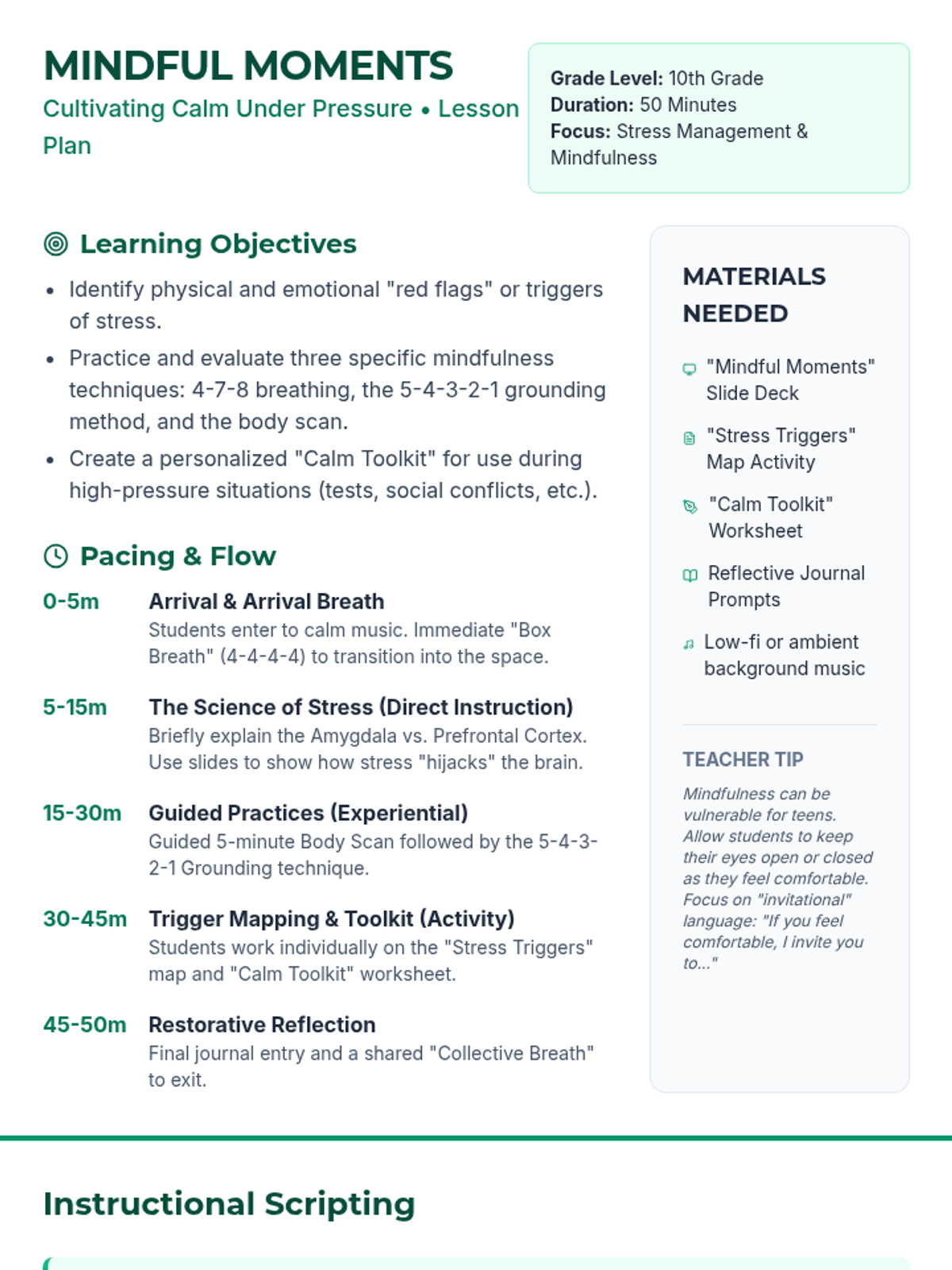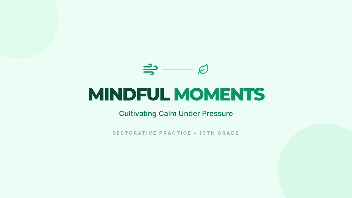 A restorative 50-minute Tier 1 lesson for 10th-grade students to develop practical mindfulness techniques for managing stress and anxiety. Includes guided breathing, body scan activities, and trigger identification.