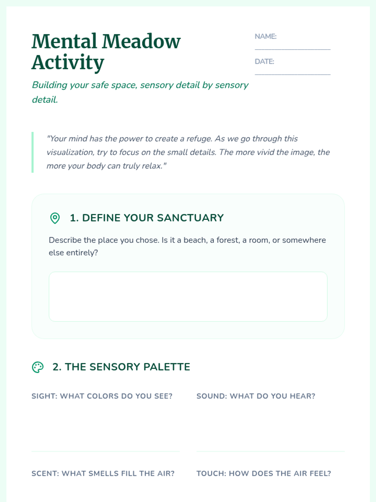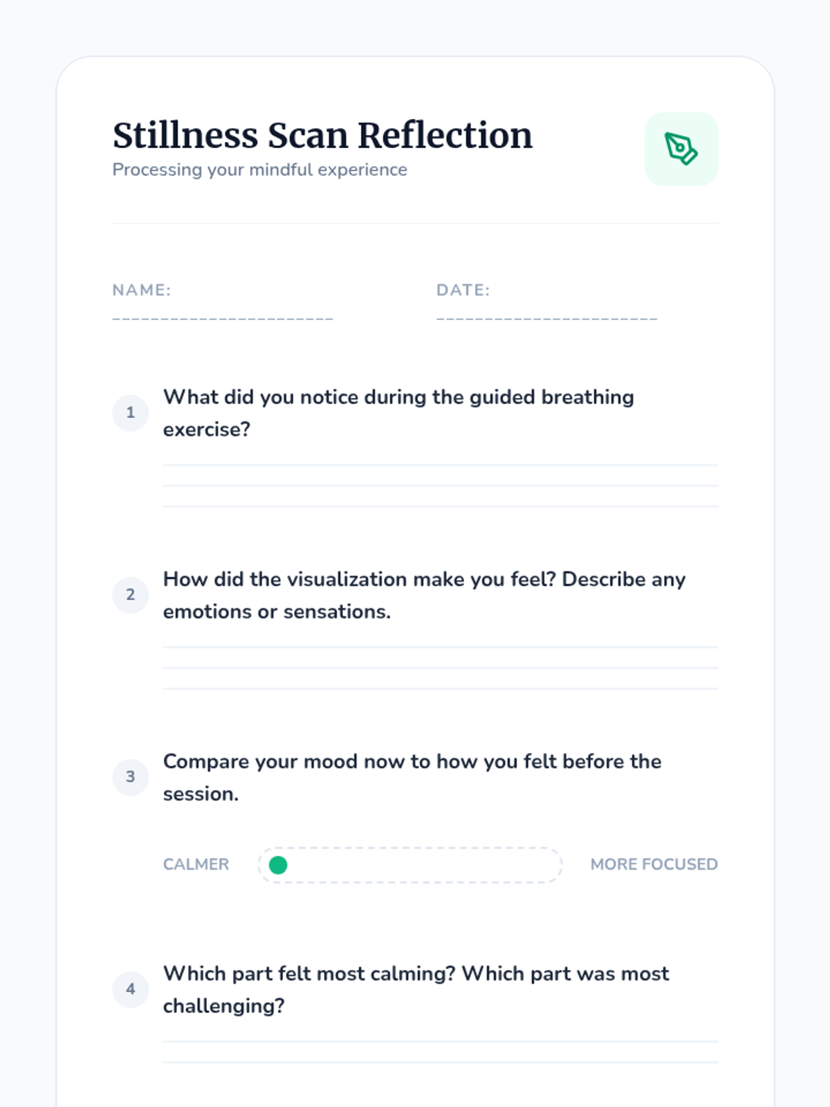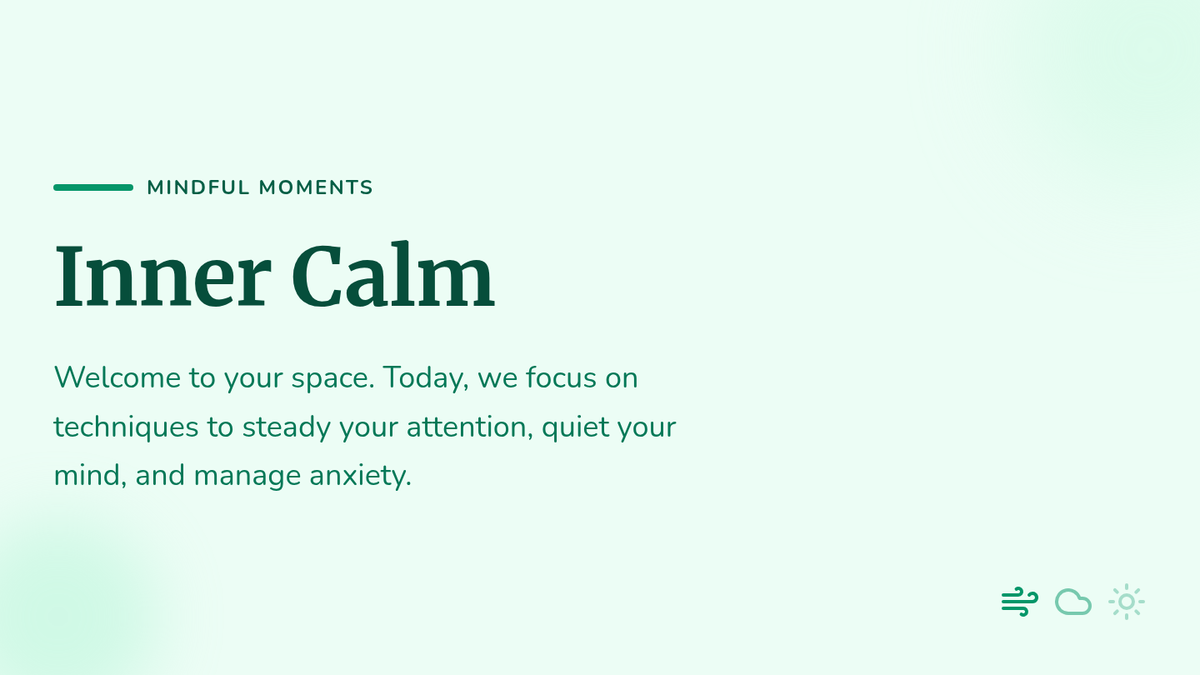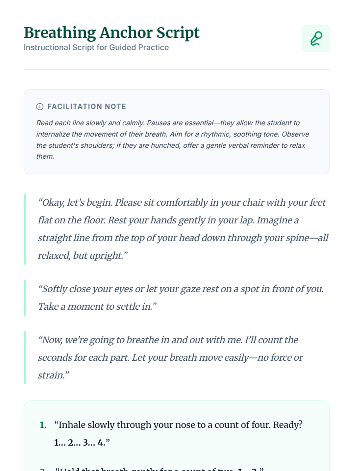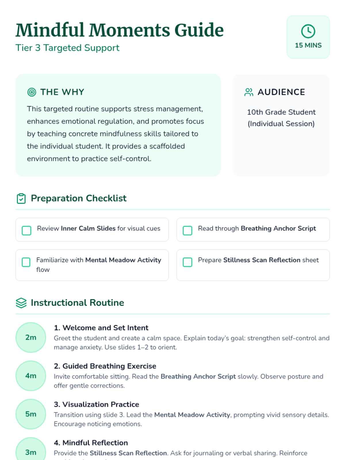 A series of short, individual 15-minute mindfulness sessions for 10th-grade students focusing on breathing and visualization to enhance self-control and manage anxiety.