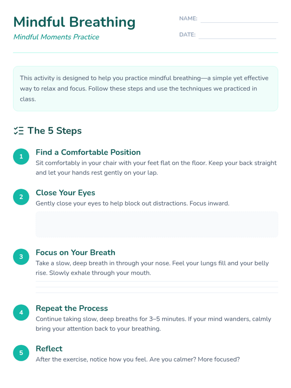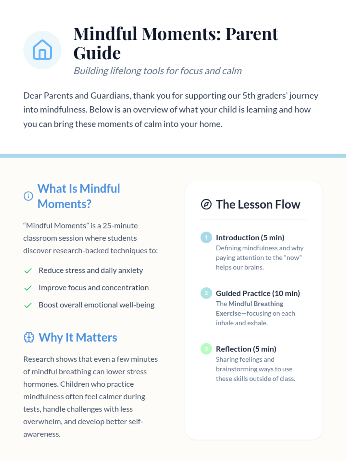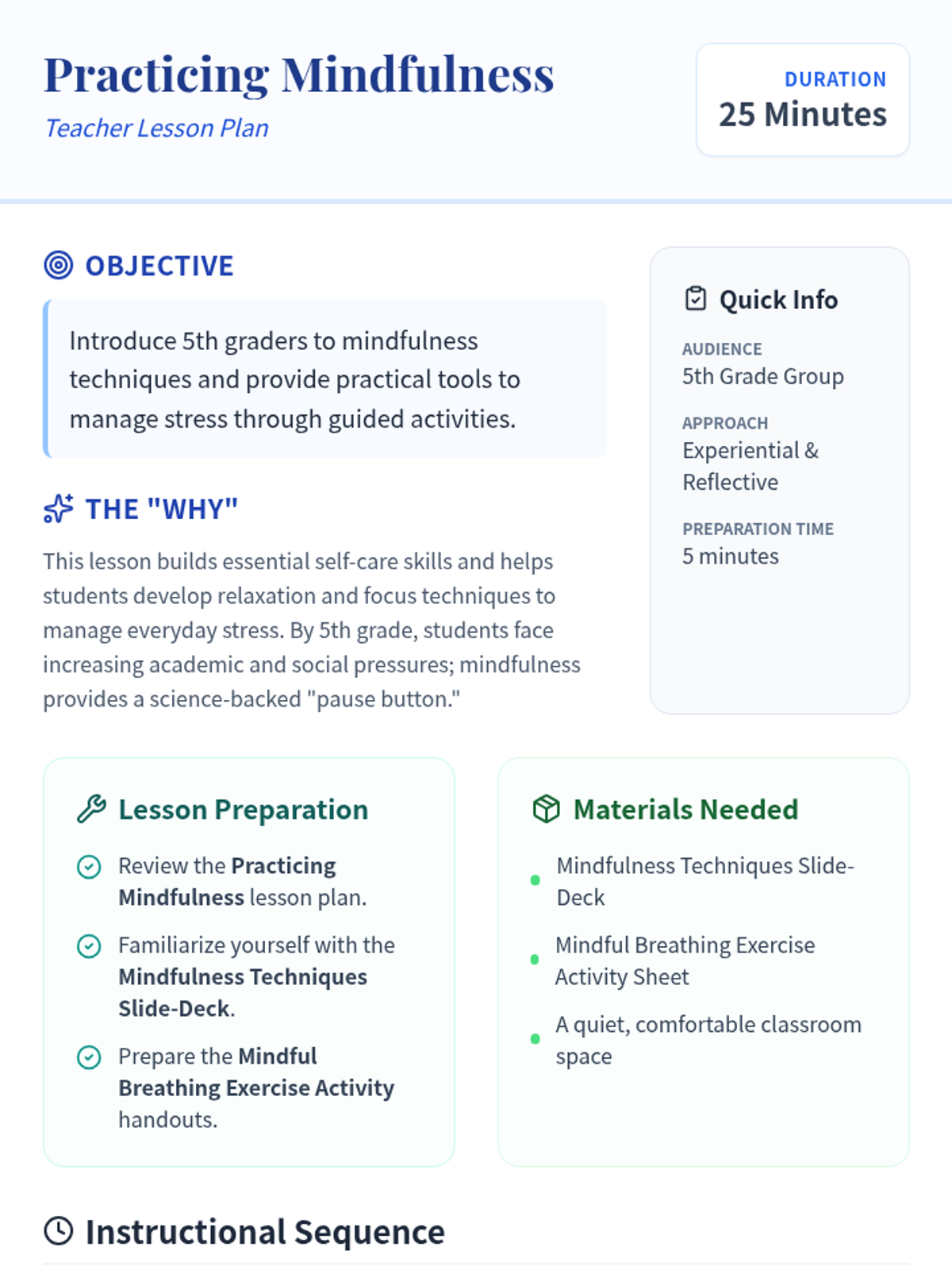 A 25-minute mindfulness session for 5th graders to learn science-backed techniques like mindful breathing to reduce stress and improve focus.