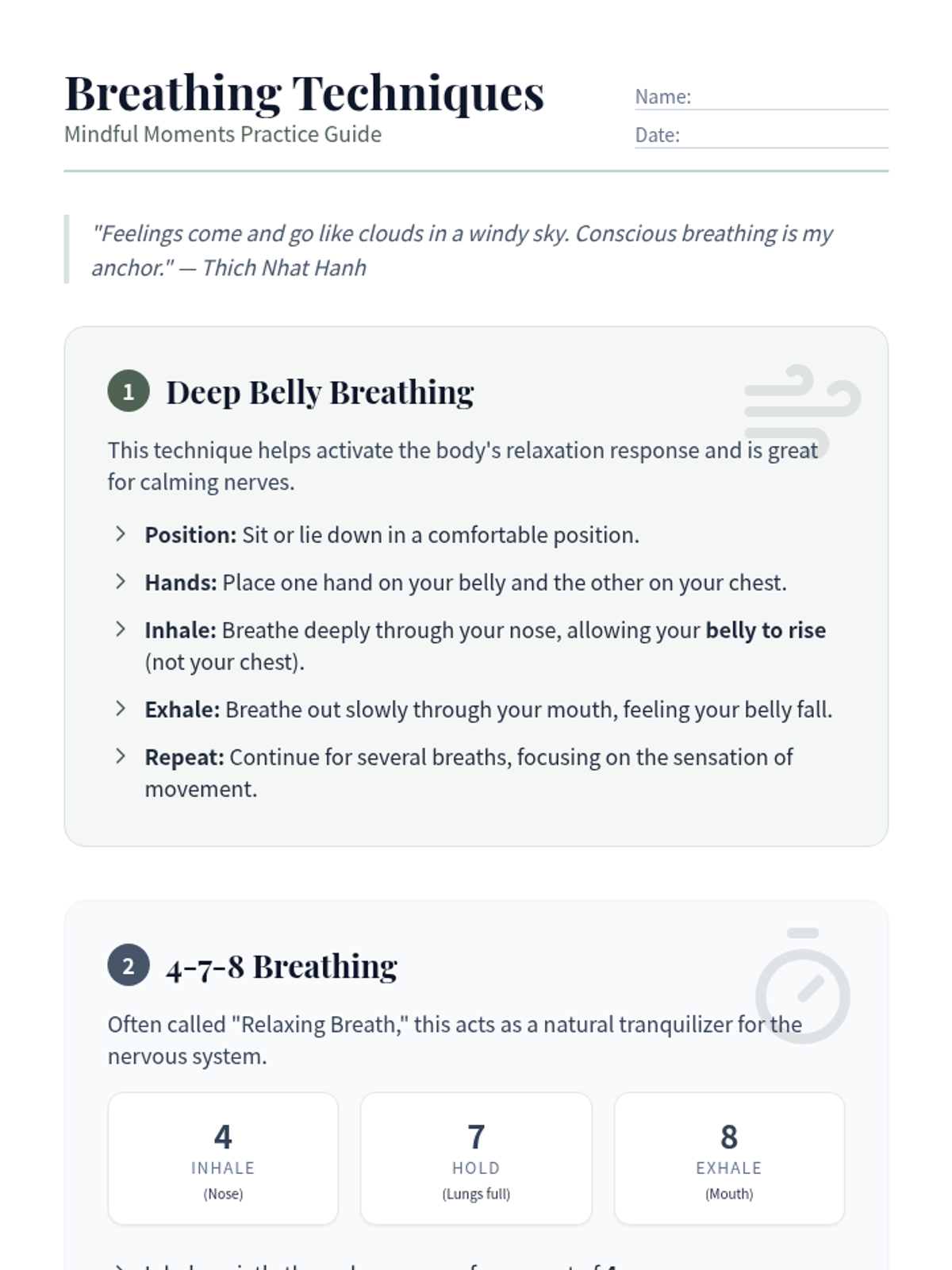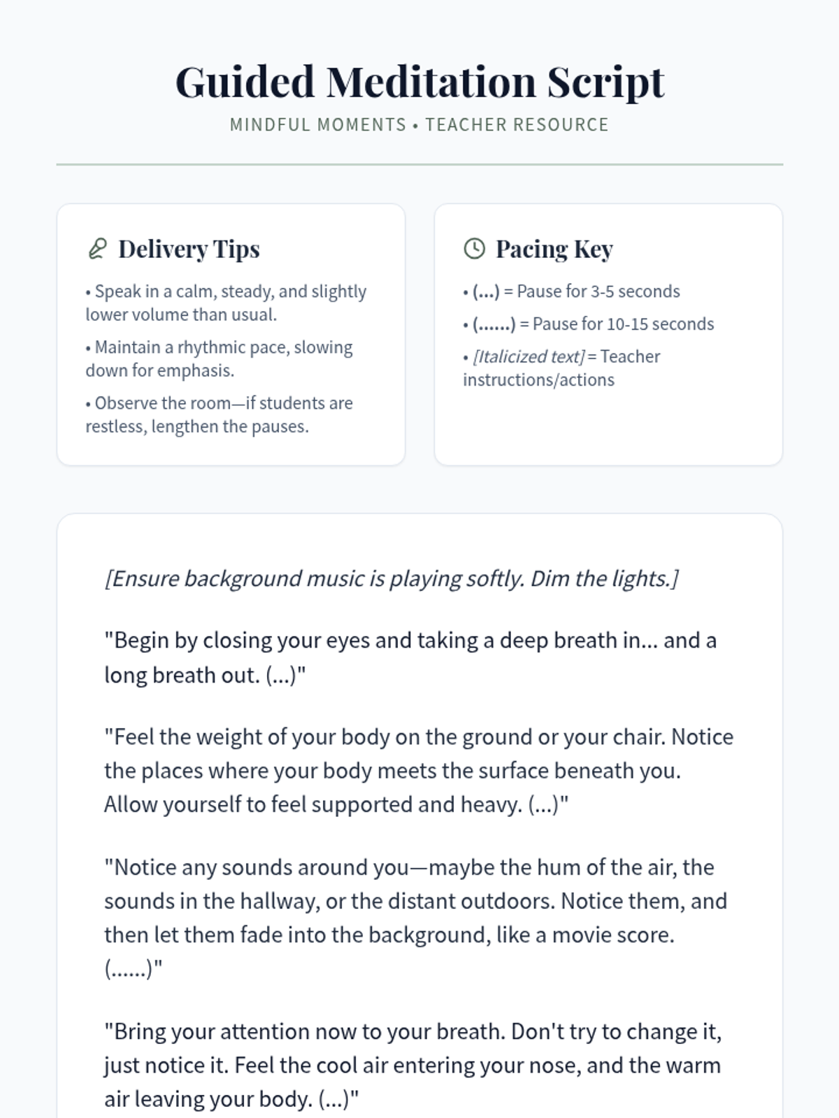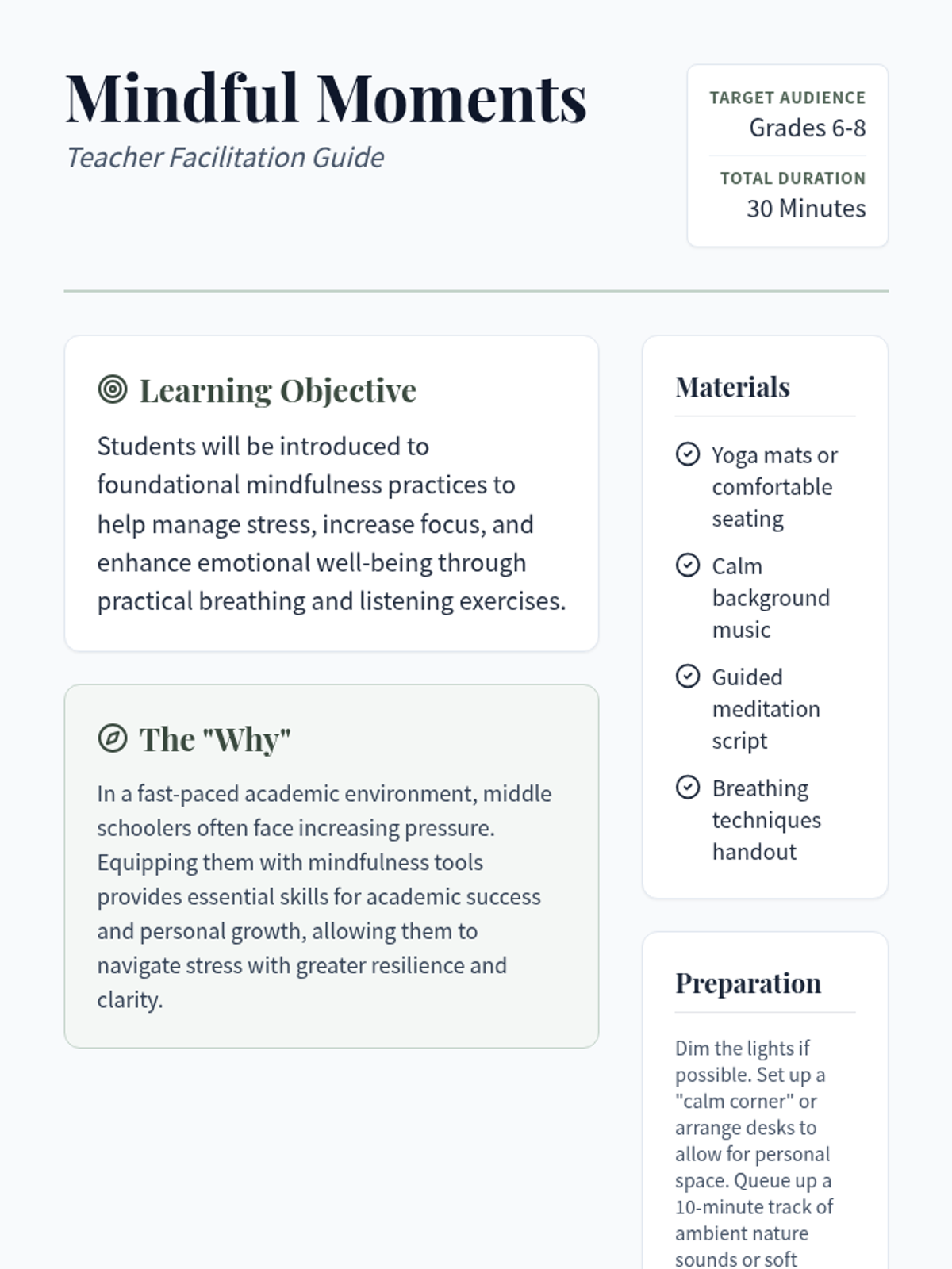 An introductory lesson on mindfulness for middle schoolers, featuring breathing techniques, mindful listening, and guided meditation to improve focus and manage stress.