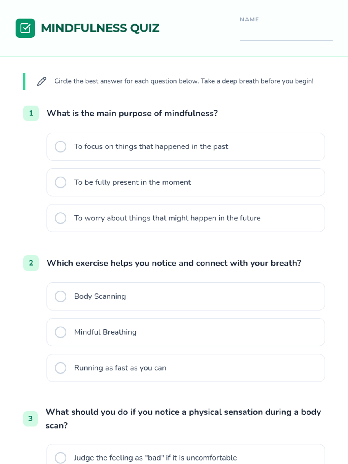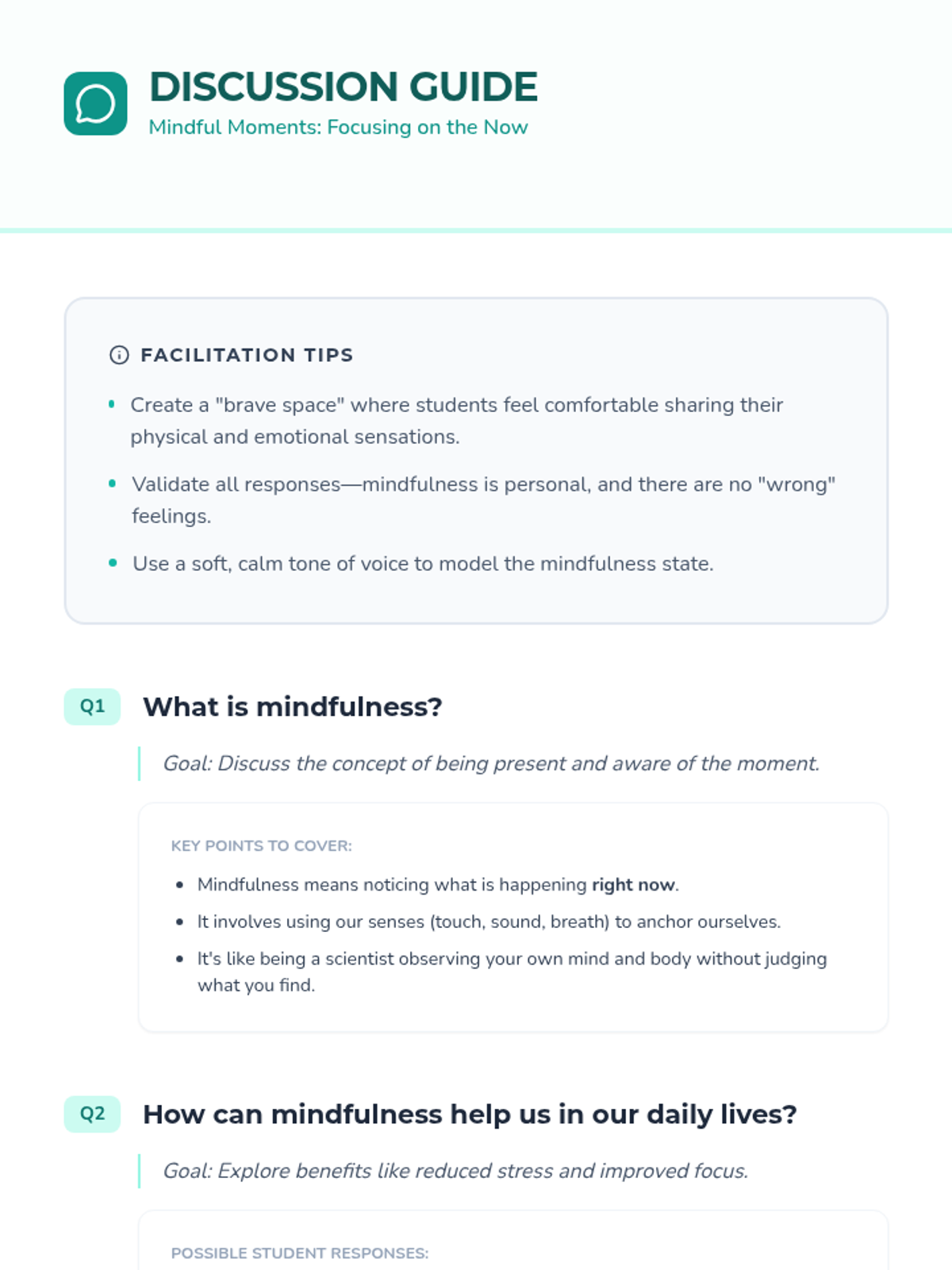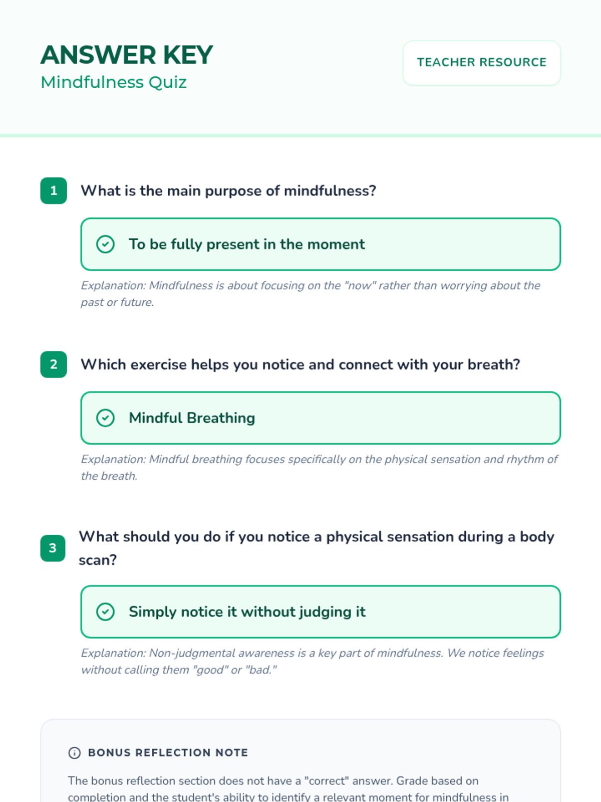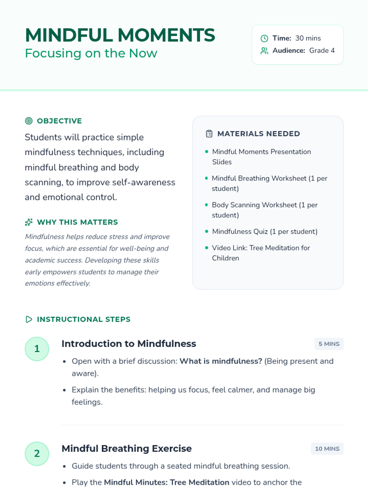This lesson introduces Grade 4 students to mindfulness exercises, focusing on the present moment to reduce stress and improve emotional regulation through breathing and body scanning.