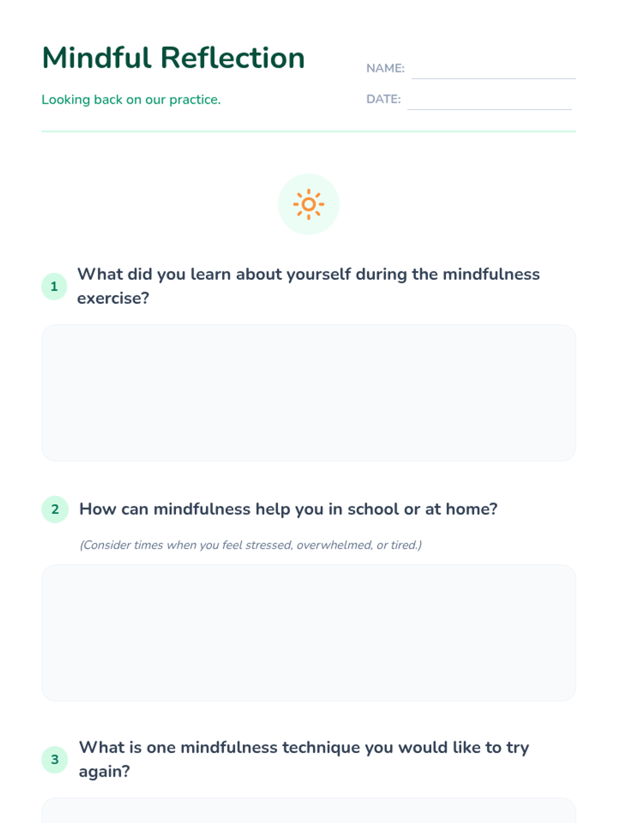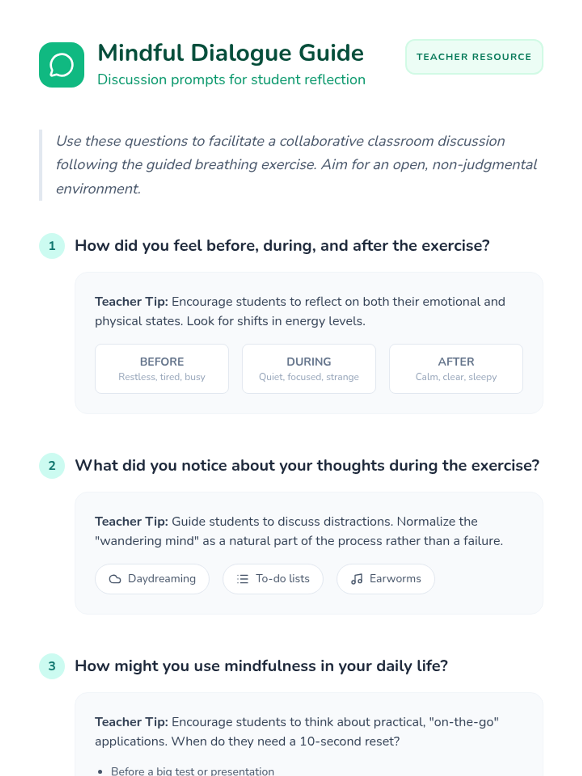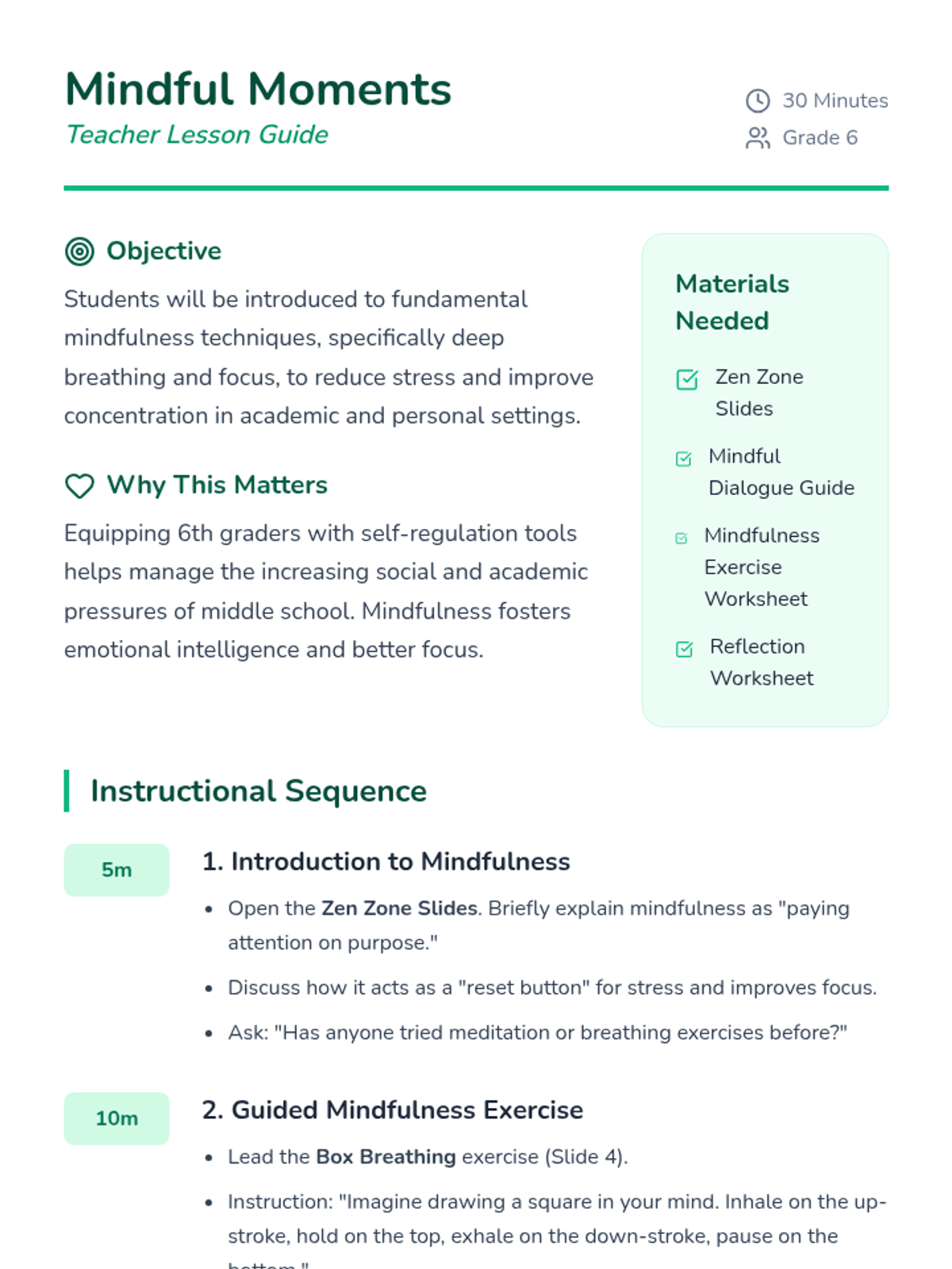 A 30-minute introductory lesson for 6th graders on mindfulness techniques to reduce stress and improve focus through guided exercises and personal reflection.