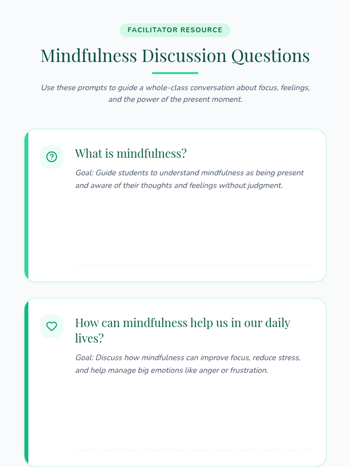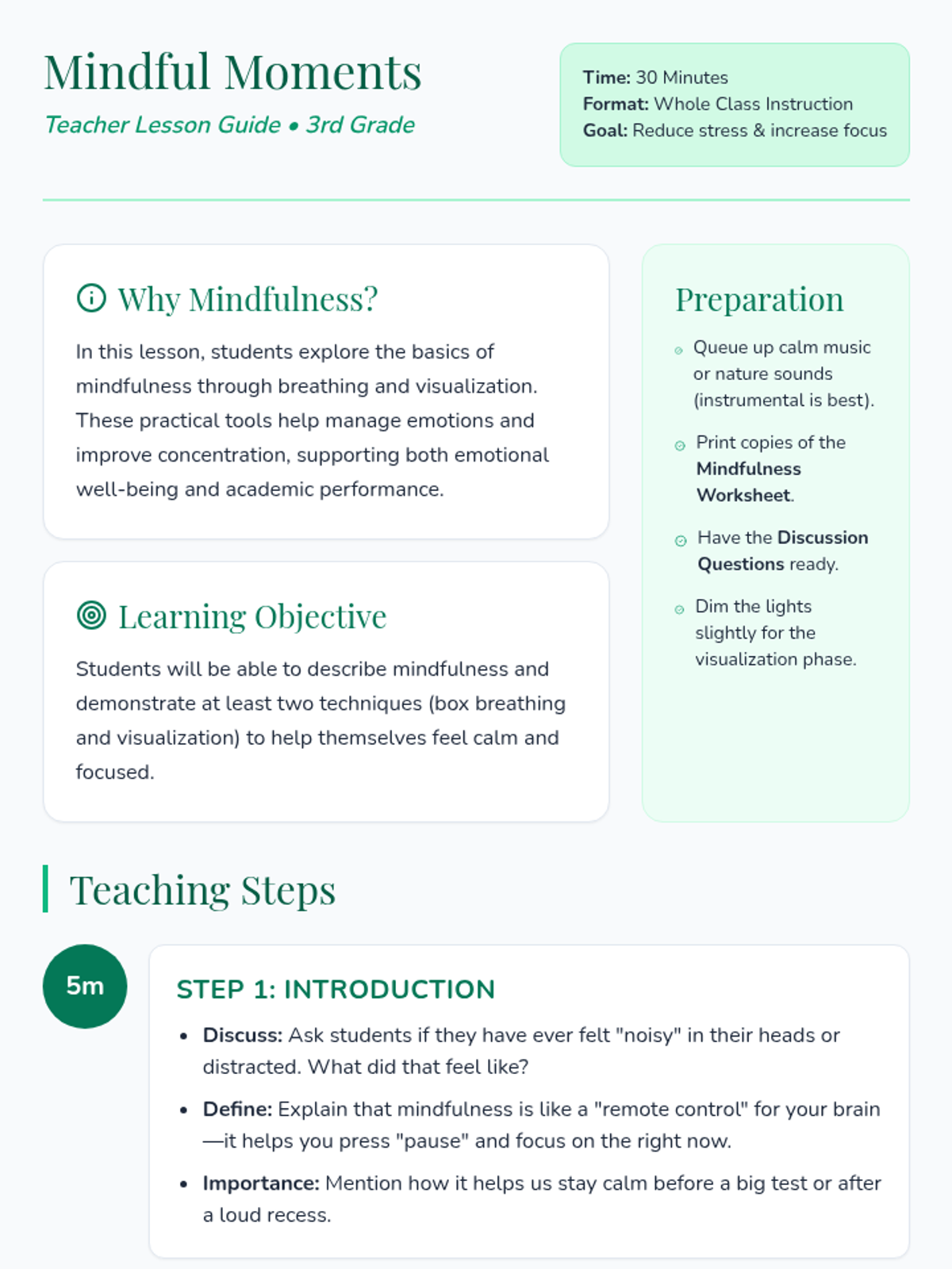 Students explore the basics of mindfulness through simple breathing exercises and visualization techniques to reduce stress and increase focus.