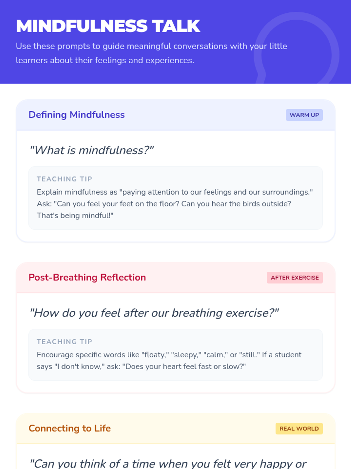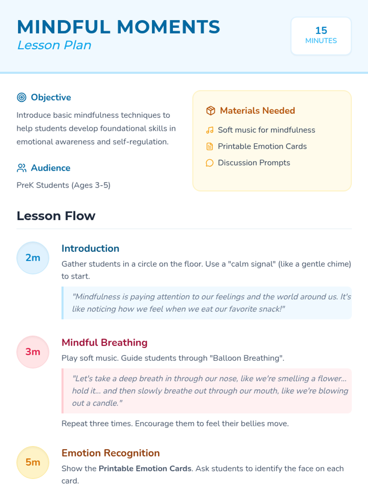 This lesson introduces PreK students to basic mindfulness techniques through engaging and interactive activities. By focusing on recognizing and managing emotions, students will develop foundational skills in emotional awareness and self-regulation.